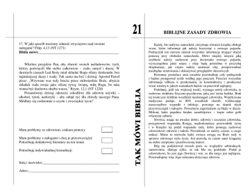 BIBLIJNE ZASADY ZDROWIA 17. W jaki sposób możemy odnieść zwycięstwo nad swoimi nałogami? Filip. 4,13 (NT 1271) Biblia mówi:_____________________________________________ Wkrótce przyjdzie Pan, aby zbawić swoich naśladowców, tych, którzy poświęcili Mu siebie całkowicie – ciało, umysł i duszę. W dawnych czasach Lud Boży miał składać Bogu ofiary doskonałe, bez najmniejszej skazy i wady. Tak samo ma być i dzisiaj. Apostoł Paweł pisze: „Wzywam was tedy bracia przez miłosierdzie Boże, abyście składali ciała swoje jako ofiarę żywą, świętą, miłą Bogu, bo taka winna być duchowa służba wasza.” Rzym. 12,1 (NT 1220) Postanówmy dzisiaj odrzucić szkodliwe dla zdrowia używki – alkohol, tytoń, narkotyki – aby odtąd żyć dla chwały naszego Pana. Módlmy się codziennie o czyste i zwycięskie życie! Mam problemy ze zdrowiem, szukam pomocy Mam problemy z nałogami i chcę je przezwyciężyć Potrzebuję dodatkowej literatury na ten temat Potrzebuję indywidualnej konsultacji Imię i nazwisko:___________________________________________ Adres:___________________________________________________ Każdy, kto nabywa samochód, otrzymuje również książkę obsługi wozu, która informuje jak należy korzystać z nowego pojazdu. Podręcznik ten zawiera niemal wszystkie informacje mogące służyć pomocą przy obsłudze samochodu. Mówi między innymi jaką szybkość należy zachować przy docieraniu nowego pojazdu, wyszczególnia jakie smary i oleje będą potrzebne w przyszłej eksploatacji, jak często należy zmieniać olej, przeprowadzać niezbędne smarowania i dokonywać przeglądów okresowych. Rozumny posiadacz auta uważnie przestudiuje cały podręcznik i będzie postępował ściśle według jego pouczeń. Przecież wszystkie informacje odbiera w przekonaniu, że konstruktorzy i producenci wozu wiedzą w jakich warunkach będzie on pracował najlepiej. Podobnej, jeśli nie większej troski, wymaga ustrój człowieka, ta cudowna struktura fizyczno-psychiczna, jaką jest istota ludzka. Brak tej troski jest źródłem wszelkich niedomagań człowieka. Współczesna medycyna podaje, że 80% wszelkich chorób, wykluczając nieszczęśliwe wypadki i infekcje, powstaje na skutek złych przyzwyczajeń i nałogów. Poważnym zagrożeniem są błędy w diecie. Miliony ludzi popełnia fatalne samobójstwo – kopie sobie grób własnymi zębami. Stwórca, mając na uwadze dobro, zdrowie i szczęście człowieka, przygotował wspaniałą Księgę, najdoskonalszy przewodnik życia i w Księdze tej podał wspaniałe rady, które pomogą zachować człowiekowi zdrowie i radość. Powiedział, co należy czynić, a czego unikać. Mimo to niewielu ludzi zwraca uwagę na Boże rady w sprawie zdrowego stylu życia. Jest prawdą, że często sami ściągamy na siebie cierpienia i przedwczesną śmierć. Bóg nie podyktował swoich praw ze względów arbitralnych, samowolnie, dlatego tylko, że tak Mu się podobało. Podał je człowiekowi, bo jest jego Stwórcą i wie, co dla niego jest najlepsze. Przestudiujmy więc Jego zalecenia dotyczące zdrowia. Biblia mówi: 1. Jakie życie Bóg daje swoim dzieciom? Jan 10,10 (NT 1151) Biblia mówi:___________________________________________________ 2. Co jest życzeniem Niebieskiego Ojca odnośnie naszego fizycznego zdrowia? III Jan 2 (NT 1330) Biblia mówi:___________________________________________________ 3. Jakiej, ogólnej zasady powinien chrześcijanin w życiu przestrzegać? I Kor. 10,31 (NT 1235) Biblia mówi:___________________________________________________ 4. Dlaczego powinien wykazać szczególną troskę o ciało? I Kor. 3,16.17 (NT 1228) Biblia mówi:___________________________________________________ 5. W jaki sposób można nasze ciało zanieczyścić? Dan. 1,8 (ST 945) Biblia mówi:___________________________________________________ 6. Jaką dietę, obowiązującą aż do potopu, dał Bóg pierwszemu człowiekowi? I Mojż. 1,29 (ST 8) Biblia mówi:___________________________________________________ Uwaga: Spis ten zawiera zboża, orzechy, owoce i jarzyny. Mięso nie wchodziło w skład pierwotnej diety. Bóg zezwolił je spożywać dopiero po potopie, kiedy roślinność nie była już tak bujna i zdrowa jak dawniej. I Mojż. 9,1-3 (ST 14) 7. Jakie dwie grupy zwierząt weszły na rozkaz Boga do arki? I Mojż. 7, 1.2 (ST 12) Biblia mówi:___________________________________________________ 8. Które zwierzęta uznał Bóg za czyste i przeznaczył na pokarm dla człowieka? V Mojż. 14,2-7 (ST 211) Biblia mówi:___________________________________________________ 9. Jakie ryby uznał Bóg za czyste? V Mojż. 14,9 (ST 211) Biblia mówi:___________________________________________________ 10. Mięsa jakich zwierząt nie powinien człowiek spożywać? V Mojż. 14, 7.8 (ST 211) Biblia mówi:___________________________________________________ 11. Jaki będzie koniec tych, którzy ignorują zakaz Boży i jedzą mięso zwierząt nieczystych? Izaj. 66,15-17 (ST 812) Biblia mówi:___________________________________________________ 12. Co mówi Salomon o tych, co piją mocne napoje? Przyp. 20,1 (ST 721) Biblia mówi:___________________________________________________ 13. Jakie są skutki spożywania napojów alkoholowych? Przyp. 23,29-35 (ST 724) Biblia mówi:___________________________________________________ 14. Które przykazanie ma powstrzymać chrześcijan przez paleniem papierosów i zażywaniem narkotyków? II Mojż. 20,13 (ST 84) Biblia mówi:___________________________________________________ Uwaga: Chrześcijanie wierzą, że życie ludzkie jest świętością. Pogwałcenie tego prawa polega nie tylko na pozbawieniu kogoś czy siebie życia, lecz także na jego skracaniu przez spożywanie narkotyków, szkodliwych dla zdrowia i używek (w tym także tytoń). 15. Dlaczego chrześcijanin ma czcić Boga nawet troską o swoje ciało? I Kor. 6,19.20 (NT 1231) Biblia mówi:__________________________________________