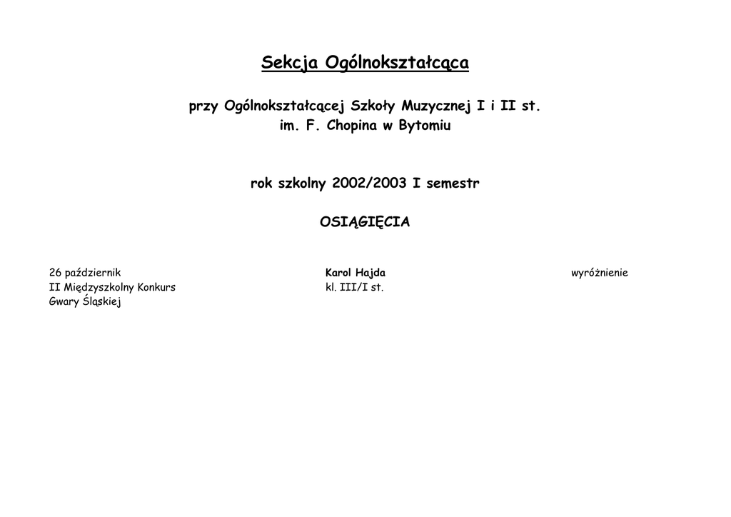 Sekcja Ogólnokształcąca przy Ogólnokształcącej Szkoły Muzycznej I i II st. im. F. Chopina w Bytomiu rok szkolny 2002/2003 I semestr OSIĄGIĘCIA 26 październik II Międzyszkolny Konkurs Gwary Śląskiej Karol Hajda kl. III/I st. wyróŜnienie Sekcja Ogólnokształcąca przy Ogólnokształcącej Szkole Muzycznej I i II st. im. F. Chopina w Bytomiu rok szkolny 2002/2003 I semestr UDZIAŁY 18 wrzesień udział w przedstawieniu teatralnym „Balladyna” – Teatr Nowy (Zabrze) 24 wrzesień wyjście do kina na film „Pianista” (Kino – Bałtyk) 1 październik Międzynarodowy Dzień Muzyki 11 październik wyjście do kina Bałtyk na film pt. „Zemsta” 14 październik Akademia z Okazji Dnia Edukacji Narodowej 12 listopad Akademia z okazji Święta Niepodległości (wspólnie ze szkołą baletową) 3 grudzień udział w Sesji popularnonaukowej z okazji Międzynarodowego Dnia Walki z ADIS 6 grudzień Kino IMAX – Katowice kl. III/I – VI/I st. 19 grudzień „Jasełka” – kl. II b/I st. grudzień 2002 udział uczniów kl. I – III/I st. w konkursie plastycznym pt. „W głębinach oceanu” 20 grudzień zorganizowanie przez wychowawców w kl. I/I st. – IV lic. Wigilii Klasowej 7 styczeń wyjście młodzieŜy kl. gimnazjalnych i licealnych na wystawę BWA Katowice Prace Pablo Picasso Klasy I – III/I st. raz w miesiącu uczestniczą w spektaklach teatralnych