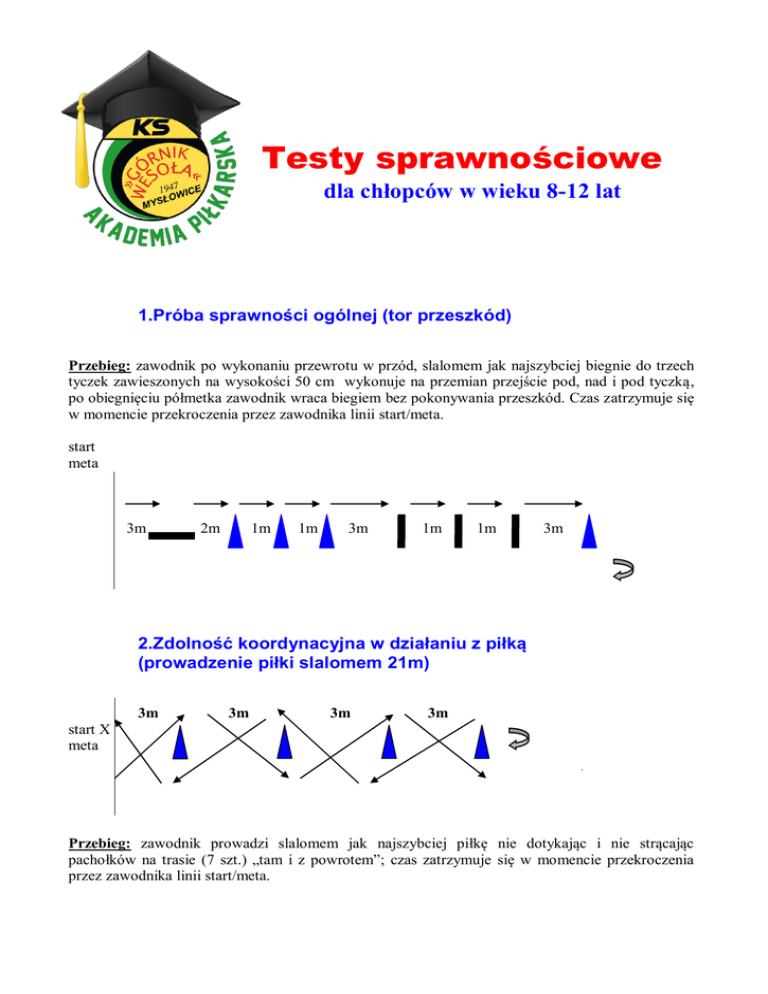 Testy sprawnościowe dla chłopców w wieku 8-12 lat 1.Próba sprawności ogólnej (tor przeszkód) Przebieg: zawodnik po wykonaniu przewrotu w przód, slalomem jak najszybciej biegnie do trzech tyczek zawieszonych na wysokości 50 cm wykonuje na przemian przejście pod, nad i pod tyczką, po obiegnięciu półmetka zawodnik wraca biegiem bez pokonywania przeszkód. Czas zatrzymuje się w momencie przekroczenia przez zawodnika linii start/meta. start meta 3m 2m 1m 1m 3m 1m 1m 3m 2.Zdolność koordynacyjna w działaniu z piłką (prowadzenie piłki slalomem 21m) 3m 3m 3m 3m start X meta Przebieg: zawodnik prowadzi slalomem jak najszybciej piłkę nie dotykając i nie strącając pachołków na trasie (7 szt.) „tam i z powrotem”; czas zatrzymuje się w momencie przekroczenia przez zawodnika linii start/meta. 3. Próba szybkości (bieg na 30m) start X meta 30m Przebieg: na sygnał dźwiękowy zawodnik staruje z pozycji stojącej- pokonując jak najszybciej bieg od linii startu do linii mety. Próbę wykonujemy dwukrotnie . Zapisujemy lepszy czas. 4. Próba zwinności (bieg zygzakiem-„koperta”) 5m 3m X start/meta Przebieg: na wyznaczonym terenie oznaczamy prostokąt o wymiarach 5x3.Na sygnał dźwiękowy zawodnik staruje z pozycji wysokiej, stopy za linią startu, pokonując jak najszybciej 3 razy bieg po kopercie. Start i meta znajdują się w tym samym miejscu. Wynik końcowy stanowi czas pokonania pełnych trzech okrążeń . 5. Zdolność koordynacyjna w działaniu z piłką („żonglerka”) Przebieg: zawodnik zaczyna żonglerkę z piłki stojącej, zaliczone odbicia będą tylko te wykonane nogę (stopa, kolanko). Zawodnik wykonuje dwie próby. Zapisujemy lepszy wynik.