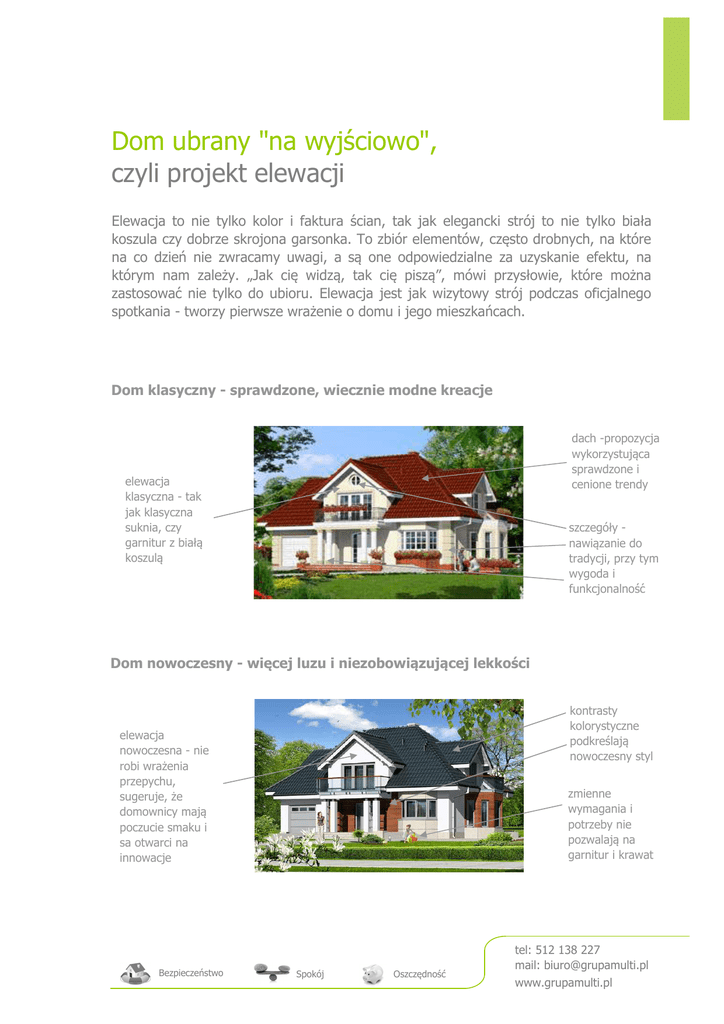 Dom ubrany "na wyjściowo", czyli projekt elewacji Elewacja to nie tylko kolor i faktura ścian, tak jak elegancki strój to nie tylko biała koszula czy dobrze skrojona garsonka. To zbiór elementów, często drobnych, na które na co dzień nie zwracamy uwagi, a są one odpowiedzialne za uzyskanie efektu, na którym nam zależy. „Jak cię widzą, tak cię piszą”, mówi przysłowie, które można zastosować nie tylko do ubioru. Elewacja jest jak wizytowy strój podczas oficjalnego spotkania - tworzy pierwsze wrażenie o domu i jego mieszkańcach. Dom klasyczny - sprawdzone, wiecznie modne kreacje dach -propozycja wykorzystująca sprawdzone i cenione trendy elewacja klasyczna - tak jak klasyczna suknia, czy garnitur z białą koszulą szczegóły nawiązanie do tradycji, przy tym wygoda i funkcjonalność Dom nowoczesny - więcej luzu i niezobowiązującej lekkości kontrasty kolorystyczne podkreślają nowoczesny styl elewacja nowoczesna - nie robi wrażenia przepychu, sugeruje, że domownicy mają poczucie smaku i sa otwarci na innowacje Bezpieczeństwo zmienne wymagania i potrzeby nie pozwalają na garnitur i krawat Spokój Oszczędność tel: 512 138 227 mail: [email protected] www.grupamulti.pl Ściana szczytowa, czyli twarz każdego domu Dom klasyczny - charakteru polskiego dworku nadają mu umieszczone w ścianie szczytowej okna ze szprosami i okrągłe okno powyżej. Dodatkowym elementem ozdobnym, nadającym całości klasycznej elegancji, jest zdobiona balustrada z kutego żelaza. Dom nowoczesny - jego bryła zdaje się być lekka i przejrzysta, dzięki odpowiedniemu dobraniu materiałów i drobnych elementów. Proste w formie drzwi balkonowe w ścianie szczytowej, szklana balustrada o drewnianych poręczach całość nabiera minimalistycznego charakteru. Kolory, kolory, kolory... Tak jak koszula i marynarka - wszystko musi do siebie pasować Dom klasyczny - dom utrzymany w stylu klasycznym przywodzi na myśl tradycyjny polski dworek. Ten charakter podkreśla m.in. jasnobeżowy tynk oraz misterne dekoracje na krawędziach płytek. Dom nowoczesny - projekt domu nowoczesnego w dużej mierze bazuje na opozycjach. Śnieżnobiały tynk kontrastuje z grafitowym kolorem dachówki, cokół przy wykuszu podkreśla delikatne zdobienie, całości zaś dopełniają drewniane panele. Projektowanie oraz wykonanie elewacji W oparciu o nasze wieloletnie doświadczenie i pasję, z przyjemnością przeprowadzimy wszelkie czynności, związane z projektem oraz wykonaniem elewacji: ▪ podczas rozmowy poznamy indywidualne potrzeby i oczekiwania zwiazane z domem ▪ indywidualnie opracujemy projekt „od podstaw”, bądź optymalnie dostosujemy wybrany projekt gotowy ▪ doradzimy jaka elewacja będzie pasować do krajobrazu, otaczającego działkę ▪ zaproponujemy korzystne zmiany i alternatywne rozwi ązania ▪ opracujemy projekt wykonawczy ▪ przeprowadzimy kompleksową organizację i nadzór wykonania projektu ▪ na każdym etapie będziemy gotowi, aby służyć Państwu poradą i pomocą... tel: 512 138 227 mail: [email protected] Informacja przygotowana przez www.grupamulti.pl
