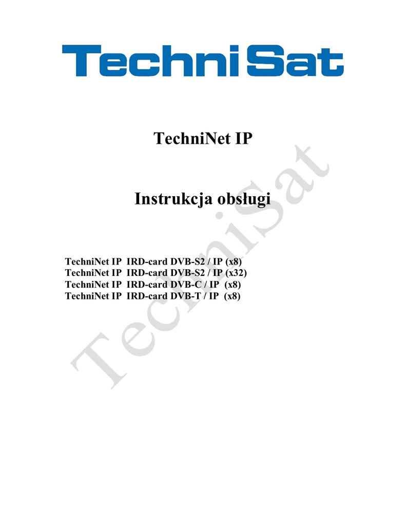 TechniNet IP Instrukcja obsługi TechniNet IP TechniNet IP TechniNet IP TechniNet IP IRD-card DVB-S2 / IP (x8) IRD-card DVB-S2 / IP (x32) IRD-card DVB-C / IP (x8) IRD-card DVB-T / IP (x8) Spis treści 1. Stosowane skróty..........................................................................................................2 2. Bezpieczeństwo..............................................................................................................2 3. Ogólne............................................................................................................................3 3.1 Opis.................................................................................................................................3 3.2 Połączenia.......................................................................................................................4 3.2.1 Widok z przodu...............................................................................................................4 3.2.2 Widok z tyłu....................................................................................................................5 4. Uruchomienie.................................................................................................................5 4.1 Instalacja..........................................................................................................................5 4.2 Podłączanie......................................................................................................................5 4.2.1 LAN.................................................................................................................................5 4.2.2 TS/IP................................................................................................................................5 4.2.3 Programator…………………………………………………………………………….6 4.2.4 Tuner…………………………………………………………………………………...6 4.2.5 Przelotka………………………………………………………………………………..6 4.2.6 SDI – Wyjście.................................................................................................................6 4.2.7 ASI – Wyjście.................................................................................................................6 4.2.8 ASI –Wyjście 2...............................................................................................................6 4.2.9 ASI – Wyjście 1.............................................................................................................6 4.2.10 AV – Wyjście.................................................................................................................6 4.2.11 YpbPr – Wyjście.............................................................................................................7 5. Programowanie................................................................................................................7 6. Dane techniczne..............................................................................................................7 6.1 Wejścia 6.2 Wyjścia 6.3 Konfiguracja, monitorowanie 6.4 Ogólne Niniejsza instrukcja odnosi się do produktów wymienionych poniżej. Nr. artykułu Oznaczenie 0000/5980 TechniNet IP DVB-S2/IP AVC SD/HD 32M 0000/5972 0000/5975 0000/5976 TechniNet IP IRD-card DVB-S2 / IP TechniNet IP IRD-card DVB-C / IP TechniNet IP IRD-card DVB-T / IP 1 1. Stosowane skróty RSSI ASI DiSEqC FBAS IRD MTPS PES PSI RTP SDI SI SNMP SPTS TSoIP UDP Received Signal Strength Indication Asynchronous Serial Interface Digital Satellite Equipment Control Farb-Bild-Austast-Synchron-Signal Integrated Receiver Decoder Multiple Program Transport Stream Packetized Elementary Stream Program Specific Information Real-Time Transport Protocol Serial Digital Interface Service Information Simple Network Management Protocol Singel Program Transport Stream Tranport Stream over Internet Protocol User Datagram Protocol 2. Bezpieczeństwo Przed rozpoczęciem eksploatacji proszę zapoznać się z zasadami użtykowania urządzenia. Wszystkie prace montażowe i instalacjne powinny być przeprowadzane przez wykwalifikowany personel. Ekspertami są osoby, które ze względu na wykształcenie posiadają wiedzę w dziedzinie instalacji satelitarnych oraz odpowiednią znajomość przepisów BHP i ogólnie przyjęte normy techniczne (np. VDE wymagania standardów DIN). Zgodność z obowiązującymi przepisami lokalnymi oraz zasadami montażu, są warunkiem koniecznym instalacji urządzenia. Producent nie ponosi odpowiedzialności za szkody powstałe w wyniku niewłaściwego obchodzenia się, nieprzestrzeganie środków bezpieczeństwa oraz stosowania nieoryginalnych lub wspólnych akcesoriów systemowych. W tych przypadkach należy odłączyć urządzenie od zasilania oraz skonsultować się z ekspertem o pomoc: - Przewód zasilający lub wtyczka są uszkodzone; - Urządzenie zostało wystawiony na działanie wilgoci lub płynu; - W przypadku poważnych awarii; - Ciężkich uszkodzeń zewnętrznych. 2 Niebezpieczeństwa i instrukcja instalacji: - Konstrukcja produktu odpowiada klasie ochrony 1. Jako źródło napięcia może być podpięte tylko do gniazdka sieciowego z uziemieniem (230V ~ / 50Hz). - Przewód zasilający powinien być zawsze łatwo dostępny i w stanie gotowości. - Temperatura otoczenia 0 ... 45 ° C. - Korzystanie z produktu w pomieszczeniach tylko w celu ochrony przed wyładowaniem elektrycznym, deszczem lub słońcem. - Instalacja powinna być wykonana w pomieszczeniach, które zapewniają przy zmieniających się warunkach klimatycznych, dopuszczalny zakres temperatury otoczenia (z dala od promieniowania cieplnego i innych źródeł ciepła). - Urządzenie, nie może być narażone na działanie wody. - Na urządzeniu nie powinny stać przedmioty z