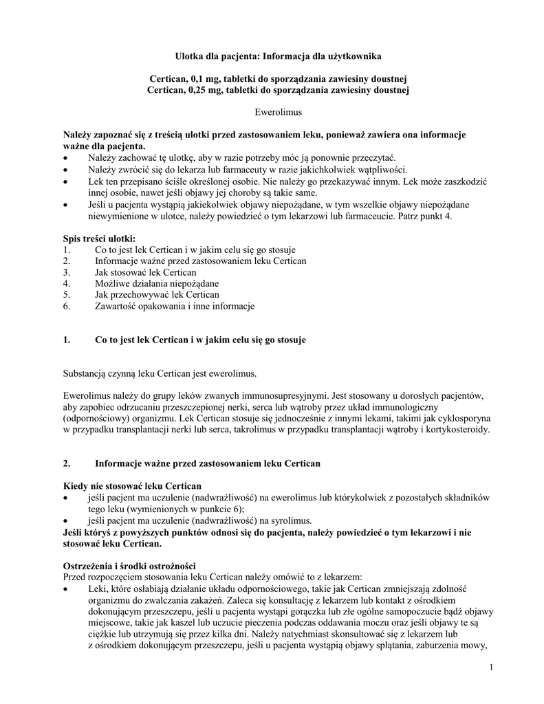 Ulotka dla pacjenta: Informacja dla użytkownika Certican, 0,1 mg, tabletki do sporządzania zawiesiny doustnej Certican, 0,25 mg, tabletki do sporządzania zawiesiny doustnej Ewerolimus Należy zapoznać się z treścią ulotki przed zastosowaniem leku, ponieważ zawiera ona informacje ważne dla pacjenta. Należy zachować tę ulotkę, aby w razie potrzeby móc ją ponownie przeczytać. Należy zwrócić się do lekarza lub farmaceuty w razie jakichkolwiek wątpliwości. Lek ten przepisano ściśle określonej osobie. Nie należy go przekazywać innym. Lek może zaszkodzić innej osobie, nawet jeśli objawy jej choroby są takie same. Jeśli u pacjenta wystąpią jakiekolwiek objawy niepożądane, w tym wszelkie objawy niepożądane niewymienione w ulotce, należy powiedzieć o tym lekarzowi lub farmaceucie. Patrz punkt 4. Spis treści ulotki: 1. Co to jest lek Certican i w jakim celu się go stosuje 2. Informacje ważne przed zastosowaniem leku Certican 3. Jak stosować lek Certican 4. Możliwe działania niepożądane 5. Jak przechowywać lek Certican 6. Zawartość opakowania i inne informacje 1. Co to jest lek Certican i w jakim celu się go stosuje Substancją czynną leku Certican jest ewerolimus. Ewerolimus należy do grupy leków zwanych immunosupresyjnymi. Jest stosowany u dorosłych pacjentów, aby zapobiec odrzucaniu przeszczepionej nerki, serca lub wątroby przez układ immunologiczny (odpornościowy) organizmu. Lek Certican stosuje się jednocześnie z innymi lekami, takimi jak cyklosporyna w przypadku transplantacji nerki lub serca, takrolimus w przypadku transplantacji wątroby i kortykosteroidy. 2. Informacje ważne przed zastosowaniem leku Certican Kiedy nie stosować leku Certican jeśli pacjent ma uczulenie (nadwrażliwość) na ewerolimus lub którykolwiek z pozostałych składników tego leku (wymienionych w punkcie 6); jeśli pacjent ma uczulenie (nadwrażliwość) na syrolimus. Jeśli któryś z powyższych punktów odnosi się do pacjenta, należy powiedzieć o tym lekarzowi i nie stosować leku Certican. Ostrzeżenia i środki ostrożności Przed rozpoczęciem stosowania leku Certican należy omówić to z lekarzem: Leki, które osłabiają działanie układu odpornościowego, takie jak Certican zmniejszają zdolność organizmu do zwalczania zakażeń. Zaleca się konsultację z lekarzem lub kontakt z ośrodkiem dokonującym przeszczepu, jeśli u pacjenta wystąpi gorączka lub złe ogólne samopoczucie bądź objawy miejscowe, takie jak kaszel lub uczucie pieczenia podczas oddawania moczu oraz jeśli objawy te są ciężkie lub utrzymują się przez kilka dni. Należy natychmiast skonsultować się z lekarzem lub z ośrodkiem dokonującym przeszczepu, jeśli u pacjenta wystąpią objawy splątania, zaburzenia mowy, 1 utrata pamięci, ból głowy, zaburzenia widzenia lub napady padaczkowych, ponieważ mogą to być objawy rzadkiej, ale bardzo poważnej choroby zwanej postępującą wieloogniskową leukoencefalopatią(PML). Jeśli pacjent przeszedł w ostatnim czasie poważną operację lub jeśli nadal ma niewygojoną ranę pooperacyjną, Certican może zwiększać ryzyko problemów z gojeniem się rany. Leki, które osłabiają działanie układu odpornościowego, takie jak Certican zwiększają ryzyko rozwoju nowotworów złośliwych, szczególnie skóry i układu chłonnego. Dlatego należy ograniczyć ekspozycję na światło słoneczne i promieniowanie ultrafioletowe (UV) zakładając odpowiednie ubranie ochronne i często używając kremów z filtrem przeciwsłonecznym o wysokim wskaźniku ochrony. Lekarz będzie dokładnie kontrolował pracę nerek, stężenie tłuszczów (lipidów) i cukru we krwi pacjenta oraz ilość białka w moczu. Jeśli pacjent ma zaburzenia czynności wątroby lub przebył wcześniej chorobę, która mogła zaburzyć czynność wątroby, należy poinformować o tym lekarza, ponieważ może to oznaczać konieczność zmiany dawki przyjmowanego leku Certican. Jeśli pacjent ma objawy dotyczące układu oddechowego (np. kaszel, trudności w oddychaniu i świszczący oddech), należy poinformować o tym lekarza. Lekarz rozważy czy i jak kontynuować leczenie lekiem Certican oraz czy konieczne jest zastosowanie innych leków. Lek Certican może zmniejszać wytwarzanie nasienia u mężczyzn i przez to zmniejszać płodność. Działanie to jest na ogół odwracalne. Mężczyźni planujący ojcostwo powinni porozmawiać o leczeniu ze swoim lekarzem. Pacjenci w podeszłym wieku (65 lat i starsi) Istnieje ograniczone doświadczenie ze stosowaniem leku Certican u pacjentów w podeszłym wieku. Dzieci i młodzież (młodsi niż 18 lat) Lek Certican nie jest zalecany do stosowania u dzieci i młodzieży, będących biorcami przeszczepu nerki, ponieważ brak wystarczającego doświadczenia w stosowaniu leku Certican w tej grupie wiekowej. Leku Certican nie należy stosować u dzieci i młodzieży, będących biorcami przeszczepu wątroby. Lek Certican a inne leki Należy powiedzieć lekarzowi o wszystkich lekach przyjmowanych przez pacjenta obecnie lub ostatnio, a także o lekach, które pacjent planuje przyjmować również tych, które wydawane są bez recepty. Pewne leki mogą wpływać na sposób działania leku Certican na organizm. Jest bardzo ważne, aby powiedzieć lekarzowi, jeśli pacjent przyjmuje którykolwiek z następujących leków: leki immunosupresyjne inne niż cyklosporyna, takrolimus lub kortykosteroidy; antybiotyki, takie jak ryfampicyna, ryfabutyna, klarytromycyna, erytromycyna lub telitromycyna; leki przeciwwirusowe, takie jak rytonawir, efawirenz, newirapina, nelfinawir, indynawir lub amprenawir, które stosuje się w leczeniu zakażenia wirusem HIV; leki stosowane w leczeniu zakażeń grzybiczych, takie jak worykonazol, flukonazol, ketokonazol lub itrakonazol; leki stosowane w leczeniu padaczki, takie jak fenytoina, fenobarbital lub karbamazepina; leki stosowane w leczeniu wysokiego ciśnienia krwi lub chorób serca