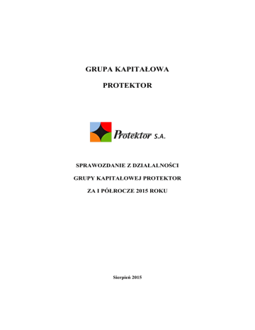 GRUPA KAPITAŁOWA PROTEKTOR SPRAWOZDANIE Z DZIAŁALNOŚCI GRUPY KAPITAŁOWEJ PROTEKTOR ZA I PÓŁROCZE 2015 ROKU Sierpień 2015 Sprawozdanie z działalności Grupy Kapitałowej Protektor za okres od 01.01.2015 roku do 30.06.2015 roku SPIS TREŚCI: 1. Wstępne informacje o Grupie Kapitałowej Protektor.................................................. 4 2. Omówienie podstawowych wielkości ekonomiczno-finansowych ujawnionych w sprawozdaniu finansowym. ................................................................................................. 6 3. Opis podstawowych zagrożeń i ryzyk związanych z pozostałymi miesiącami roku obrotowego .............................................................................................................................. 11 4. Opis organizacji grupy kapitałowej Emitenta, ze wskazaniem jednostek podlegających konsolidacji, a w przypadku Emitenta będącego jednostką dominującą, który na podstawie obowiązujących go przepisów nie ma obowiązku lub może nie sporządzać skonsolidowanych sprawozdań finansowych – również wskazanie przyczyny i podstawę braku konsolidacji. .............................................................................................. 15 5. Wskazanie skutków zmian w strukturze jednostki gospodarczej, w tym w wyniku połączenia jednostek gospodarczych, przejęcia lub sprzedaży jednostek grupy kapitałowej Emitenta, inwestycji długoterminowych, podziału, restrukturyzacji i zaniechania działalności....................................................................................................... 16 6. Stanowisko Zarządu odnośnie do możliwości zrealizowania wcześniej opublikowanych prognoz wyników na dany rok, w świetle wyników zaprezentowanych w raporcie półrocznym w stosunku do wyników prognozowanych. ................................. 16 7. Wskazanie akcjonariuszy posiadających bezpośrednio lub pośrednio przez podmioty zależne, co najmniej 5 % ogólnej liczby głosów na walnym zgromadzeniu Emitenta na dzień przekazania raportu półrocznego wraz ze wskazaniem liczby posiadanych przez te podmioty akcji, ich procentowego udziału w kapitale zakładowym, liczby głosów z nich wynikających i ich procentowego udziału w ogólnej liczbie głosów na walnym zgromadzeniu oraz wskazanie zmian w strukturze własności znacznych pakietów akcji Emitenta w okresie od przekazania poprzedniego raportu kwartalnego. 16 8. Zestawienie stanu posiadania akcji Emitenta lub uprawnień do nich przez osoby zarządzające i nadzorujące Emitenta na dzień przekazania raportu półrocznego, wraz ze wskazaniem zmian w stanie posiadania, w okresie od przekazania poprzedniego raportu kwartalnego, odrębnie dla każdej z osób. .............................................................. 18 9. Wskazanie postępowań toczących się przed sądem, organem właściwym dla postępowania arbitrażowego lub organem administracji publicznej, z uwzględnieniem informacji w zakresie: ............................................................................................................ 18 a. postepowania dotyczącego zobowiązań albo wierzytelności Emitenta lub jednostki od niego zależnej, których wartość stanowi co najmniej 10 % kapitałów własnych Emitenta, ................................................................................................................................. 18 b. dwu lub więcej postepowań dotyczących zobowiązań lub wierzytelności, których łączna wartość stanowi odpowiednio co najmniej 10 % kapitałów własnych Emitenta. 18 10. Informacje o zawarciu przez Emitenta lub jednostkę od niego zależną jednej lub wielu transakcji z podmiotami powiązanymi, jeżeli pojedynczo lub łącznie są one istotne i zostały zawarte na warunkach innych niż rynkowe wraz ze wskazaniem ich wartości, przy czym informacje dotyczące poszczególnych transakcji mogą być zgrupowane według rodzaju, z wyjątkiem przypadku, gdy informacje na temat poszczególnych 2 Sprawozdanie z działalności Grupy Kapitałowej Protektor za okres od 01.01.2015 roku do 30.06.2015 roku transakcji są niezbędne do zrozumienia ich wpływu na sytuacje majątkową, finansową i wynik finansowy Emitenta. ................................................................................................. 18 11. Informacje o udzieleniu przez Emitenta lub przez jednostkę od niego zależną poręczeń kredytu lub pożyczki lub udzieleniu gwarancji - łącznie jednemu podmiotowi lub jednostce zależnej od tego podmiotu, jeżeli łączna wartość istniejących poręczeń lub gwarancji stanowi równowartość, co najmniej 10 % kapitałów własnych Emitenta. ..... 18 12. Inne informacje, które zdaniem Emitenta są istotne dla oceny sytuacji kadrowej, majątkowej, finansowej, wyniku finansowego Emitenta i ich zmian oraz informacje istotne dla oceny możliwości realizacji zobowiązań przez Emitenta. ................................ 19 13. Czynniki, które w ocenie Emitenta będą miały wpływ na osiągnięte przez nią wyniki w perspektywie, co najmniej kolejnego kwartału................................................... 20 3 Sprawozdanie z działalności Grupy Kapitałowej Protektor za okres od 01.01.2015 roku do 30.06.2015 roku 1. Wstępne informacje o Grupie Kapitałowej Protektor PRZEDMIOT DZIAŁALNOŚCI PROTEKTOR Spółka Akcyjna (dalej: PROTEKTOR S.A.) jest podmiotem dominującym Grupy Kapitałowej Protektor. Spółka posiada osobowość prawną, działa na podstawie przepisów prawa polskiego na obszarze Polski, a poprzez nabycie spółek zależnych – także za granicą. Zarejestrowana jest w Sądzie Rejonowym Lublin – Wschód w Lublinie z siedzibą w Świdniku, VI Wydział Gospodarczy Krajowego Rejestru Sądowego pod nr KRS 0000033534. Siedzibą Spółki jest Lublin. Branża według klasyfikacji przyjętej przez rynek regulowany: przemysł lekki. Zgodnie z Polską Klasyfikacją Działalnoś
