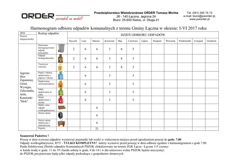 Przedsiębiorstwo Wielobranżowe ORDER Tomasz Michta 26 - 140 Łączna, Jęgrzna 24 Biuro: 25-650 Kielce, ul. Długa 41 Tel. (041) 345 15 13 e-mail: [email protected], www.pworder.pl Harmonogram odbioru odpadów komunalnych z terenu Gminy Łączna w okresie: I-VI 2017 roku 2016 Nazwa miejscowości Rodzaj odpadów Styczeń Zmieszane (niesegregowane) odpady komunalne Odpady biodegradowalne Tworzywa sztuczne, Jęgrzna (bez Zajamnia), Gózd, Występa, Zalezianka, Jaśle, Kamionki "blok" DZIEŃ ODBIORU ODPADÓW Papier i tektura, opakowania z papieru i tektury Opakowania wielomateriałowe Szkło, opakowania ze szkła Metal, opakowania z metalu Meble i inne odpady wielkogabarytowe Zużyte opony Zużyty sprzęt elektryczny i elektroniczny Popioły Luty Marzec Kwiecień Maj Czerwiec 2 6 6 3 8 5 2 6 6 3 8 5 2 6 6 3 8 5 6 3 5 6 3 5 6 3 5 6 3 5 Lipiec Sierpień Wrzesień Październik Listopad 6 6 6 21 Szanowni Państwo ! Proszę w dniu wywozu odpadów wystawiać pojemniki lub worki w widocznym miejscu przed ogrodzeniem posesji do godz. 7.00 Odpady wielkogabarytowe, RTV - TYLKO KOMPLETNY! należy wystawić przed posesję w dniu odbioru zgodnie z harmonogramem o godz 7.00 Punkt Selektywnej Zbiórki odpadów Komunalnych PSZOK zlokalizowany na terenie ZGK Łącza - Łączna 115 czynny: w każda środę w godz. 11 do 19 i każda sobotę w godz. 8 do 14 ( w dni ustawowo wolne PSZOK będzie nieczynny) do PSZOK przyjmowane będą tylko odpady pochodzące z gospodarstw domowych Grudzień Przedsiębiorstwo Wielobranżowe ORDER Tomasz Michta 26 - 140 Łączna, Jęgrzna 24 Biuro: 25-650 Kielce, ul. Długa 41 Tel. (041) 345 15 13 e-mail: [email protected], www.pworder.pl Harmonogram odbioru odpadów komunalnych z terenu Gminy Łączna w okresie: I-VI 2017 roku 2016 Nazwa miejscowości Rodzaj odpadów Styczeń Zmieszane (niesegregowane) odpady komunalne Odpady biodegradowalne Tworzywa sztuczne, Stawik, Osełków, Łączna, Kamionki, Czerwona Górka DZIEŃ ODBIORU ODPADÓW Papier i tektura, opakowania z papieru i tektury Opakowania wielomateriałowe Szkło, opakowania ze szkła Metal, opakowania z metalu Meble i inne odpady wielkogabarytowe Zużyte opony Zużyty sprzęt elektryczny i elektroniczny Popioły Luty Marzec Kwiecień Maj Czerwiec 9 13 13 10 15 12 9 13 13 10 15 12 9 13 13 10 15 12 13 10 12 13 10 12 13 10 12 13 10 12 Lipiec Sierpień Wrzesień Październik Listopad 13 13 13 22 Szanowni Państwo ! Proszę w dniu wywozu odpadów wystawiać pojemniki lub worki w widocznym miejscu przed ogrodzeniem posesji do godz. 7.00 Odpady wielkogabarytowe, RTV - TYLKO KOMPLETNY! należy wystawić przed posesję w dniu odbioru zgodnie z harmonogramem o godz 7.00 Punkt Selektywnej Zbiórki odpadów Komunalnych PSZOK zlokalizowany na terenie ZGK Łącza - Łączna 115 czynny: w każda środę w godz. 11 do 19 i każda sobotę w godz. 8 do 14 ( w dni ustawowo wolne PSZOK będzie nieczynny) do PSZOK przyjmowane będą tylko odpady pochodzące z gospodarstw domowych Grudzień Przedsiębiorstwo Wielobranżowe ORDER Tomasz Michta 26 - 140 Łączna, Jęgrzna 24 Biuro: 25-650 Kielce, ul. Długa 41 Tel. (041) 345 15 13 e-mail: [email protected], www.pworder.pl Harmonogram odbioru odpadów komunalnych z terenu Gminy Łączna w okresie: I-VI 2017 roku 2016 Rodzaj odpadów Nazwa miejscowości Styczeń Zmieszane (niesegregowane) odpady komunalne Odpady biodegradowalne Tworzywa sztuczne, Klonów, Podłazie, Podzagna ńszcze, Zaskale, Ostrów, Zagórze, Zajamnie, Kamionki "blok" DZIEŃ ODBIORU ODPADÓW Papier i tektura, opakowania z papieru i tektury Opakowania wielomateriałowe Szkło, opakowania ze szkła Metal, opakowania z metalu Meble i inne odpady wielkogabarytowe Zużyte opony Zużyty sprzęt elektryczny i elektroniczny Popioły Luty Marzec Kwiecień Maj Czerwiec 16 20 20 24 22 19 16 20 20 24 22 19 16 20 20 24 22 19 20 24 19 20 24 19 20 24 19 20 24 19 Lipiec Sierpień Wrzesień Październik Listopad 20 20 20 23 Szanowni Państwo ! Proszę w dniu wywozu odpadów wystawiać pojemniki lub worki w widocznym miejscu przed ogrodzeniem posesji do godz. 7.00 Odpady wielkogabarytowe, RTV - TYLKO KOMPLETNY! należy wystawić przed posesję w dniu odbioru zgodnie z harmonogramem o godz 7.00 Punkt Selektywnej Zbiórki odpadów Komunalnych PSZOK zlokalizowany na terenie ZGK Łącza - Łączna 115 czynny: w każda środę w godz. 11 do 19 i każda sobotę w godz. 8 do 14 ( w dni ustawowo wolne PSZOK będzie nieczynny) do PSZOK przyjmowane będą tylko odpady pochodzące z gospodarstw domowych Grudzień
