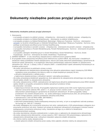 Samodzielny Publiczny Wojewódzki Szpital Chirurgii Urazowej w Piekarach Śląskich Dokumenty niezbędne podczas przyjęć planowych Dokumenty niezbędne podczas przyjęć planowych 1. Skierowanie: w przypadku przyjęcia na oddział urazowo - ortopedyczny - skierowanie na oddział urazowo - ortopedyczny w przypadku przyjęcia na Oddział Rehabilitacyjny - skierowanie na oddział rehabilitacyjny w przypadku przyjęcia na Oddział Rehabilitacji, Balenologii i Medycyny Fizykalnej - Kochcice - skierowanie ( wniosek) na leczenie rehabilitacyjne w Oddziale Rehabilitacji, Balneologii i Medycyny Fizykalnej - Kochcice, który podlega wcześniejszej weryfikacji przez Komisję Kwalifikacyjną. w przypadku konsultacji w poradni urazowo - ortopedycznej - skierowanie do poradni urazowo - ortopedycznej w przypadku konsultacji w Poradni Rehabilitacyjnej, Poradni Rehabilitacyjnej - Kochcice - skierowanie do poradni rehabilitacyjnej w przypadku zabiegów rehabilitacyjnych w Dziale Rehabilitacji, Dziale Rehabilitacji - Kochcice, Dziale Fizykoterapii - Kochcice - skierowanie do działu rehabilitacji / fizykoterapii 2. DOWÓD OSOBISTY - w celu weryfikacji ubezpieczenia w elektronicznym systemie EWUŚ 3. W przypadku braku pozytywnej weryfikacji przez elektroniczny system EWUŚ, aby skorzystać z bezpłatnych świadczeń należy przedstawić dowód ubezpieczenia, którym jest każdy dokument potwierdzający uprawnienia do świadczeń opieki zdrowotnej, w szczególności dokument potwierdzający opłacenie składek na ubezpieczenia zdrowotne (art. 240 ust. 1 ustawy z dnia 27 sierpnia 2004 r. o świadczeniach opieki zdrowotnej finansowanych ze środków publicznych). dla osoby zatrudnionej na podstawie umowy o pracę: druk zgłoszenia do ubezpieczenia zdrowotnego oraz aktualnie potwierdzony raport miesięczny ZUS RMUA wydawany przez pracodawcę (nie dotyczy osób na urlopie bezpłatnym powyżej 30 dni), aktualne zaświadczenie z zakładu pracy, legitymacja ubezpieczeniowa z aktualnym wpisem i pieczątką pracodawcy; dla osoby prowadzącej działalność gospodarczą: druk zgłoszenia do ubezpieczenia zdrowotnego oraz aktualny dowód wpłaty składki na ubezpieczenie zdrowotne; dla osoby ubezpieczonej w KRUS: zaświadczenie lub legitymacja aktualnie podstemplowane przez KRUS (dowód wpłaty składki w przypadku prowadzenia działów specjalnych produkcji rolnej); dla emerytów i rencistów: legitymacja emeryta lub rencisty. W przypadku legitymacji wydanej przez ZUS numer legitymacji powinien zawierać oznaczenie oddziału NFZ. Jeżeli 3. i 4. pozycja numeru zawiera znaki "--", legitymacja nie jest dokumentem potwierdzającym uprawnienia do świadczeń zdrowotnych. W takim przypadku należy przedstawić inny dowód ubezpieczenia - np. osoba pobierająca rentę/emeryturę ZUS, ale zamieszkała na terenie innego państwa, powinna przedstawić aktualną kartę EKUZ, zaświadczenie z ZUS lub KRUS (WBA, ZER MSWiA.), aktualny odcinek emerytury lub renty, dokument potwierdzający kwotę przekazanej emerytury lub renty, w tym w szczególności odcinek przekazu lub wyciąg (art. 240 ust. 2 Ustawy); dla osoby ubiegającej się o przyznanie emerytury lub renty: zaświadczenie z ZUS potwierdzające ubieganie się o przyznanie emerytury lub renty. Osobom tym prawo do świadczeń zdrowotnych przysługuje w okresie trwania postępowania o przyznanie emerytury/ renty, niezależnie od tego czy w efekcie to świadczenie emerytalne/rentowe uzyskają; dla osoby bezrobotnej: aktualne zaświadczenie z urzędu pracy o zgłoszeniu do ubezpieczenia zdrowotnego; dla osoby ubezpieczonej dobrowolnie: umowa zawarta z NFZ i dokument ZUS potwierdzający zgłoszenie do ubezpieczenia zdrowotnego wraz z aktualnym dowodem opłacenia składki zdrowotnej; dla członka rodziny osoby ubezpieczonej: dowód opłacenia składki zdrowotnej przez osobę, która zgłosiła członków rodziny do ubezpieczenia ❍ ❍ ❍ ❍ ❍ ❍ ❍ ■ ■ ■ ❍ ❍ ❍ ■ ■ ■ ■ ❍ ❍ ❍ ❍ ■ 1 Samodzielny Publiczny Wojewódzki Szpital Chirurgii Urazowej w Piekarach Śląskich zdrowotnego wraz z kserokopią zgłoszenia (druki: ZUS RMUA + druk ZUS ZCNA jeżeli zgłoszenie nastąpiło po 1 lipca 2008 r. (ZUS ZCZA jeżeli zgłoszenie nastąpiło przed dniem 1 lipca 2008 r.), aktualne zaświadczenie wydane przez pracodawcę, > zaświadczenie z KRUS o ubezpieczeniu członków rodziny, > legitymacja rodzinna z wpisanymi danymi członków rodziny wraz z aktualną datą i pieczątką zakładu pracy lub ZUS, legitymacja emeryta/rencisty z wpisanymi członkami rodziny podlegającymi ubezpieczeniu, potwierdzająca dokonanie zgłoszenia w dniu 1 stycznia 1999 r. lub później, wraz z aktualnym odcinkiem wypłaty świadczenia dotyczy tylko KRUS, w przypadku dzieci uczących się - pomiędzy 18. a 26. rokiem życia - dodatkowo należy przedstawić dokument potwierdzający fakt kontynuacji nauki - legitymację szkolną/studencką lub dokument potwierdzający znaczny stopień niepełnosprawności, w przypadku studentów po ukończeniu 26. roku życia - zgłoszenie do ubezpieczenia przez uczelnię (druk ZUS ZZA) oraz legitymacja studencka lub doktorancka. w przypadku osób zdających maturę - w okresie od daty wskazanej na świadectwie maturalnym - w przypadku absolwentów niezdających matury - od daty wskazanej na świadectwie ukończenia szkoły; dla osoby nieubezpieczonej, spełniającej kryterium dochodowe uprawniające do otrzymywania świadczeń z pomocy społecznej: decyzja wójta (burmistrza, prezydenta) gminy właściwej ze względu na miejsce zamieszkania tej osoby; dla osoby ubezpieczonej w innym niż Polska państwie członkowskim Unii Europejskiej lub Europejskiego Porozumienia o Wolnym Handlu: poświadczenie wydane przez NFZ (w przypadku zamieszkiwania na terenie RP), karta EKUZ (lub certyfikat ją zastępujący) wydana przez inny niż Polska kraj członkowski UE lub EFTA - w przypadku pobytu na terenie RP; dla osoby przebywającej na zasiłku chorobowym lu