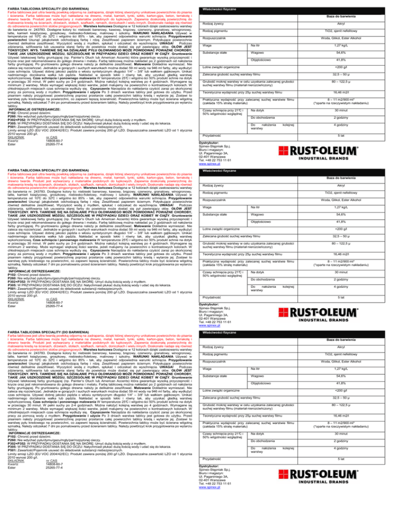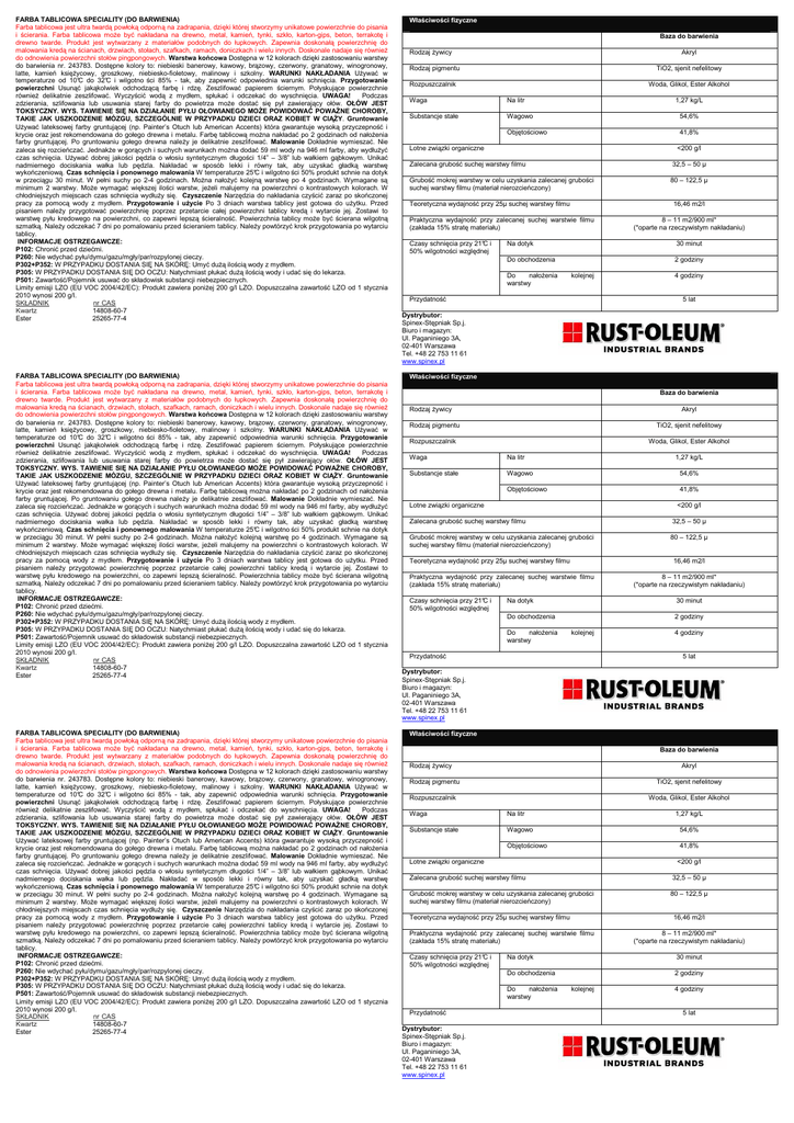 FARBA TABLICOWA SPECIALITY (DO BARWIENIA) Farba tablicowa jest ultra twardą powłoką odporną na zadrapania, dzięki której stworzymy unikatowe powierzchnie do pisania i ścierania. Farba tablicowa może być nakładana na drewno, metal, kamień, tynki, szkło, karton-gips, beton, terrakotę i drewno twarde. Produkt jest wytwarzany z materiałów podobnych do łupkowych. Zapewnia doskonałą powierzchnię do malowania kredą na ścianach, drzwiach, stołach, szafkach, ramach, doniczkach i wielu innych. Doskonale nadaje się również do odnowienia powierzchni stołów pingpongowych. Warstwa końcowa Dostępna w 12 kolorach dzięki zastosowaniu warstwy do barwienia nr. 243783. Dostępne kolory to: niebieski banerowy, kawowy, brązowy, czerwony, granatowy, winogronowy, latte, kamień księżycowy, groszkowy, niebiesko-fioletowy, malinowy i szkolny. WARUNKI NAKŁADANIA Używać w temperaturze od 10°C do 32°C i wilgotno ści 85% - tak, aby zapewnić odpowiednia warunki schnięcia. Przygotowanie powierzchni Usunąć jakąkolwiek odchodzącą farbę i rdzę. Zeszlifować papierem ściernym. Połyskujące powierzchnie również delikatnie zeszlifować. Wyczyścić wodą z mydłem, spłukać i odczekać do wyschnięcia. UWAGA! Podczas zdzierania, szlifowania lub usuwania starej farby do powietrza może dostać się pył zawierający ołów. OŁÓW JEST TOKSYCZNY. WYS. TAWIENIE SIĘ NA DZIAŁANIE PYŁU OŁOWIANEGO MOŻE POWIDOWAĆ POWAŻNE CHOROBY, TAKIE JAK USZKODZENIE MÓZGU, SZCZEGÓLNIE W PRZYPADKU DZIECI ORAZ KOBIET W CIĄŻY. Gruntowanie Używać lateksowej farby gruntującej (np. Painter’s Otuch lub American Accents) która gwarantuje wysoką przyczepność i krycie oraz jest rekomendowana do gołego drewna i metalu. Farbę tablicową można nakładać po 2 godzinach od nałożenia farby gruntującej. Po gruntowaniu gołego drewna należy je delikatnie zeszlifować. Malowanie Dokładnie wymieszać. Nie zaleca się rozcieńczać. Jednakże w gorących i suchych warunkach można dodać 59 ml wody na 946 ml farby, aby wydłużyć czas schnięcia. Używać dobrej jakości pędzla o włosiu syntetycznym długości 1/4” – 3/8” lub wałkiem gąbkowym. Unikać nadmiernego dociskania wałka lub pędzla. Nakładać w sposób lekki i równy tak, aby uzyskać gładką warstwę wykończeniową. Czas schnięcia i ponownego malowania W temperaturze 25°C i wilgotno ści 50% produkt schnie na dotyk w przeciągu 30 minut. W pełni suchy po 2-4 godzinach. Można nałożyć kolejną warstwę po 4 godzinach. Wymagane są minimum 2 warstwy. Może wymagać większej ilości warstw, jeżeli malujemy na powierzchni o kontrastowych kolorach. W chłodniejszych miejscach czas schnięcia wydłuży się. Czyszczenie Narzędzia do nakładania czyścić zaraz po skończonej pracy za pomocą wody z mydłem. Przygotowanie i użycie Po 3 dniach warstwa tablicy jest gotowa do użytku. Przed pisaniem należy przygotować powierzchnię poprzez przetarcie całej powierzchni tablicy kredą i wytarcie jej. Zostawi to warstwę pyłu kredowego na powierzchni, co zapewni lepszą ścieralność. Powierzchnia tablicy może być ścierana wilgotną szmatką. Należy odczekać 7 dni po pomalowaniu przed ścieraniem tablicy. Należy powtórzyć krok przygotowania po wytarciu tablicy. INFORMACJE OSTRZEGAWCZE: P102: Chronić przed dziećmi. P260: Nie wdychać pyłu/dymu/gazu/mgły/par/rozpylonej cieczy. P302+P352: W PRZYPADKU DOSTANIA SIĘ NA SKÓRĘ: Umyć dużą ilością wody z mydłem. P305: W PRZYPADKU DOSTANIA SIĘ DO OCZU: Natychmiast płukać dużą ilością wody i udać się do lekarza. P501: Zawartość/Pojemnik usuwać do składowisk substancji niebezpiecznych. Limity emisji LZO (EU VOC 2004/42/EC): Produkt zawiera poniżej 200 g/l LZO. Dopuszczalna zawartość LZO od 1 stycznia 2010 wynosi 200 g/l. SKŁADNIK nr CAS Kwartz 14808-60-7 Ester 25265-77-4 FARBA TABLICOWA SPECIALITY (DO BARWIENIA) Farba tablicowa jest ultra twardą powłoką odporną na zadrapania, dzięki której stworzymy unikatowe powierzchnie do pisania i ścierania. Farba tablicowa może być nakładana na drewno, metal, kamień, tynki, szkło, karton-gips, beton, terrakotę i drewno twarde. Produkt jest wytwarzany z materiałów podobnych do łupkowych. Zapewnia doskonałą powierzchnię do malowania kredą na ścianach, drzwiach, stołach, szafkach, ramach, doniczkach i wielu innych. Doskonale nadaje się również do odnowienia powierzchni stołów pingpongowych. Warstwa końcowa Dostępna w 12 kolorach dzięki zastosowaniu warstwy do barwienia nr. 243783. Dostępne kolory to: niebieski banerowy, kawowy, brązowy, czerwony, granatowy, winogronowy, latte, kamień księżycowy, groszkowy, niebiesko-fioletowy, malinowy i szkolny. WARUNKI NAKŁADANIA Używać w temperaturze od 10°C do 32°C i wilgotno ści 85% - tak, aby zapewnić odpowiednia warunki schnięcia. Przygotowanie powierzchni Usunąć jakąkolwiek odchodzącą farbę i rdzę. Zeszlifować papierem ściernym. Połyskujące powierzchnie również delikatnie zeszlifować. Wyczyścić wodą z mydłem, spłukać i odczekać do wyschnięcia. UWAGA! Podczas zdzierania, szlifowania lub usuwania starej farby do powietrza może dostać się pył zawierający ołów. OŁÓW JEST TOKSYCZNY. WYS. TAWIENIE SIĘ NA DZIAŁANIE PYŁU OŁOWIANEGO MOŻE POWIDOWAĆ POWAŻNE CHOROBY, TAKIE JAK USZKODZENIE MÓZGU, SZCZEGÓLNIE W PRZYPADKU DZIECI ORAZ KOBIET W CIĄŻY. Gruntowanie Używać lateksowej farby gruntującej (np. Painter’s Otuch lub American Accents) która gwarantuje wysoką przyczepność i krycie oraz jest rekomendowana do gołego drewna i metalu. Farbę tablicową można nakładać po 2 godzinach od nałożenia farby gruntującej. Po gruntowaniu gołego drewna należy je delikatnie zeszlifować. Malowanie Dokładnie wymieszać. Nie zaleca się rozcieńczać. Jednakże w gorących i suchych warunkach można dodać 59 ml wody na 946 ml farby, aby wydłużyć czas schnięcia. Używać dobrej jak