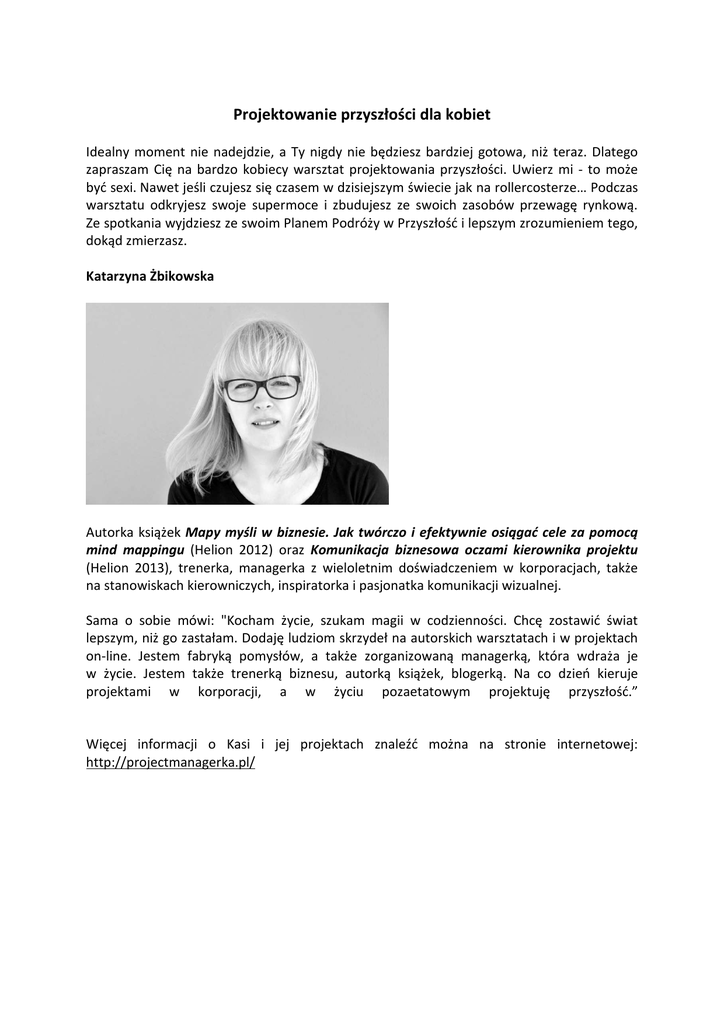 Projektowanie przyszłości dla kobiet Idealny moment nie nadejdzie, a Ty nigdy nie będziesz bardziej gotowa, niż teraz. Dlatego zapraszam Cię na bardzo kobiecy warsztat projektowania przyszłości. Uwierz mi - to może być sexi. Nawet jeśli czujesz się czasem w dzisiejszym świecie jak na rollercosterze… Podczas warsztatu odkryjesz swoje supermoce i zbudujesz ze swoich zasobów przewagę rynkową. Ze spotkania wyjdziesz ze swoim Planem Podróży w Przyszłość i lepszym zrozumieniem tego, dokąd zmierzasz. Katarzyna Żbikowska Autorka książek Mapy myśli w biznesie. Jak twórczo i efektywnie osiągać cele za pomocą mind mappingu (Helion 2012) oraz Komunikacja biznesowa oczami kierownika projektu (Helion 2013), trenerka, managerka z wieloletnim doświadczeniem w korporacjach, także na stanowiskach kierowniczych, inspiratorka i pasjonatka komunikacji wizualnej. Sama o sobie mówi: "Kocham życie, szukam magii w codzienności. Chcę zostawić świat lepszym, niż go zastałam. Dodaję ludziom skrzydeł na autorskich warsztatach i w projektach on-line. Jestem fabryką pomysłów, a także zorganizowaną managerką, która wdraża je w życie. Jestem także trenerką biznesu, autorką książek, blogerką. Na co dzień kieruje projektami w korporacji, a w życiu pozaetatowym projektuję przyszłość.” Więcej informacji o Kasi i jej projektach znaleźć można na stronie internetowej: http://projectmanagerka.pl/