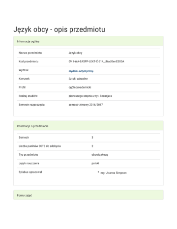 Język obcy - opis przedmiotu Informacje ogólne Nazwa przedmiotu Język obcy Kod przedmiotu 09.1-WA-EASPP-LEKT-Ć-S14_pNadGenESX0A Wydział Wydział Artystyczny Kierunek Sztuki wizualne Profil ogólnoakademicki Rodzaj studiów pierwszego stopnia z tyt. licencjata Semestr rozpoczęcia semestr zimowy 2016/2017 Informacje o przedmiocie Semestr 3 Liczba punktów ECTS do zdobycia 2 Typ przedmiotu obowiązkowy Język nauczania polski Sylabus opracował Formy zajęć mgr Joanna Simpson Forma Liczba godzin w Liczba godzin w Liczba godzin w Liczba godzin w Forma zajęć semestrze tygodniu semestrze tygodniu zaliczenia (stacjonarne) (stacjonarne) (niestacjonarne) (niestacjonarne) 30 2 - - Ćwiczenia Zaliczenie na ocenę Cel przedmiotu Opanowanie przedmiotu na poziomie B1+ według skali Europejskiego systemu opisu kształcenia językowego oraz w zakresie niezbędnym dla potrzeb studiowania i wykonywania pracy zawodowej. Wymagania wstępne Znajomość języka angielskiego na poziomie A2 według skali Europejskiego Systemu Opisu Kształcenia Językowego. Zakres tematyczny 1. System Edukacji w Polsce i krajach anglosaskich - dyskusja w grupach w języku angielskim. 2. Test sprawdzający poziom wiedzy studenta z języka angielskiego i służący jako podstawa do dalszej oceny poczynionych przez studentów postępów w osiągnięciu wyższego poziomu - B1+ 3. Praca i życie za granicą - prowadzenie rozmów na temat życia, pracy, systemu edukacji i opieki zdrowotnej, systemu bankowego itp. w Wielkiej Brytanii. 4. Szukanie pracy - pisanie podań o pracę, dialogi - rozmowa kwalifikacyjna, pisanie podań o pracę i CV. 5. Kariera zawodowa - opisywanie własnej sylwetki profesjonalnej lub planów zawodowych na przyszlość. 6. Freelancing - wady i zalety pracy zawodowej artysty jako freelancer. 7. Testy z writing and reading na poziomie A2/B1 sprawdzające postępy studentów w osiągnięciu wyższego poziomu językowego wymaganego w danym semestrze. 8. Funkcjonowanie w życiu artystycznym - dyskusje na temat organizacji wystaw, happeningów artystycznych. 9. Test zaliczeniowy. 10. Prezenytacja indywidualna z użyciem PowerPoint. Metody kształcenia Metodyka komunikacyjna nauczania języka obcego. Korzystanie z literatury przedmiotu oraz profesjonalnych źródeł internetowych. Efekty kształcenia i metody weryfikacji osiągania efektów kształcenia Opis efektu Symbole efektów Student powinien KA1_U23 Metody weryfikacji Forma zajęć aktywność w trakcie zajęć posiadać umiejętności kolokwium językowe na poziomie obserwacja i ocena aktywności na B1+ zgodnie z ESOKJ. zajęciach Ćwiczenia praca pisemna test test końcowy przygotowanie indywidualnych prezentacji w PowerPoint na dowolnie wybrany temat - zgodnie z kierunkiem studiów studenta Warunki zaliczenia Uzyskanie conajmniej 60% w wynikach testów oraz w ramach bieżącej kontroli KA1 U23. Obciążenie pracą Obciążenie pracą Studia Studia niestacjonarne stacjonarne (w godz.) (w godz.) Godziny kontaktowe (udział w zajęciach; konsultacjach; egzaminie, itp.) 30 - Samodzielna praca studenta (przygotowanie do: zajęć, kolokwium, 30 - egzaminu; studiowanie literatury przygotowanie: pracy pisemnej, projektu, prezentacji, raportu, wystąpienia; itp.) Łącznie 60 - Punkty ECTS Studia Studia niestacjonarne stacjonarne Zajęcia z udziałem nauczyciela akademickiego 1 - Zajęcia bez udziału nauczyciela akademickiego 1 - Łącznie 2 - Literatura podstawowa 1. Oxenden, C., 2009 New English File. Advanced Student's Book., University Press, Oxford University. 2. Davis, P. and Falla, I., 2008, FCE Result, University Press, Oxford. 3. Hughes, D and Lawlor, P., 2007, ESOL EXEMPLARS, DfES Publications, Nottingham 4. O'conne, l Sue. 1993. Focus on Advanced English C.A.E. Longman. Literatura uzupełniająca Uwagi Zmodyfikowane przez dr hab. Helena Kardasz (ostatnia modyfikacja: 07-08-2016 21:38)