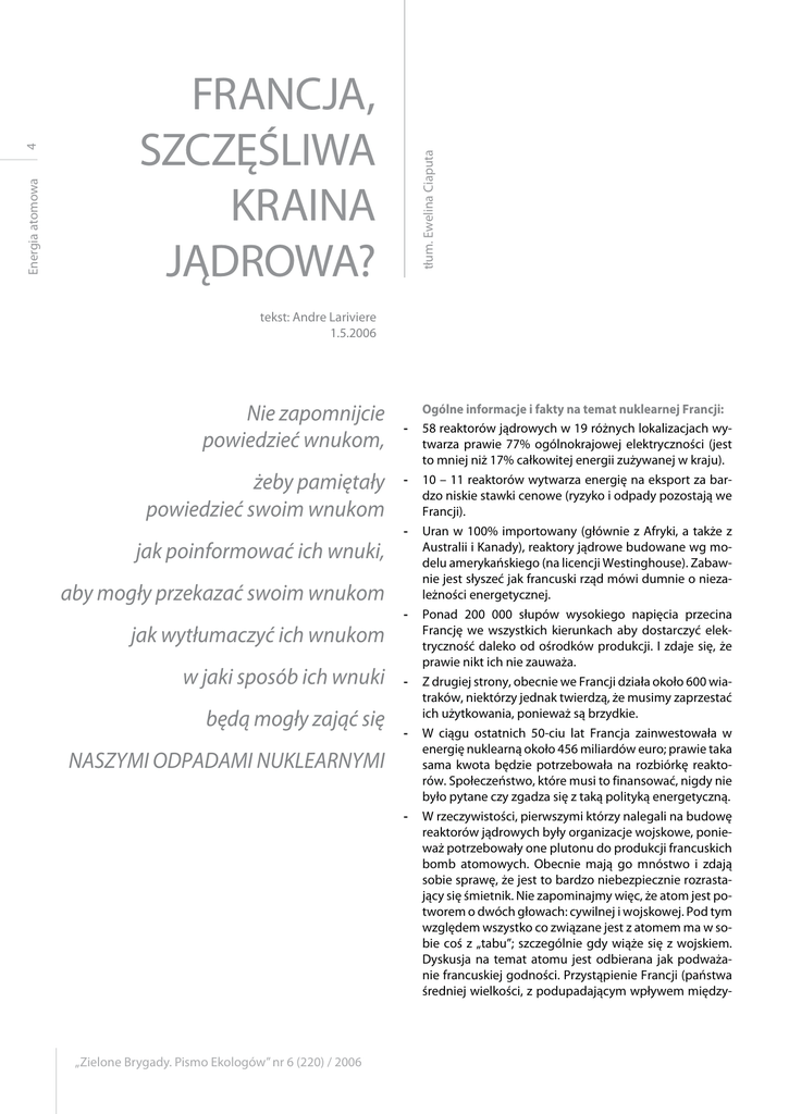 tłum. Ewelina Ciaputa Energia atomowa FRANCJA, SZCZĘŚLIWA KRAINA JĄDROWA? tekst: Andre Lariviere 1.5.2006 Nie zapomnijcie powiedzieć wnukom, żeby pamiętały powiedzieć swoim wnukom jak poinformować ich wnuki, aby mogły przekazać swoim wnukom jak wytłumaczyć ich wnukom w jaki sposób ich wnuki będą mogły zająć się NASZYMI ODPADAMI NUKLEARNYMI „Zielone Brygady. Pismo Ekologów” nr 6 (220) / 2006 Ogólne informacje i fakty na temat nuklearnej Francji: - 58 reaktorów jądrowych w 19 różnych lokalizacjach wytwarza prawie 77% ogólnokrajowej elektryczności (jest to mniej niż 17% całkowitej energii zużywanej w kraju). - 10 – 11 reaktorów wytwarza energię na eksport za bardzo niskie stawki cenowe (ryzyko i odpady pozostają we Francji). - Uran w 100% importowany (głównie z Afryki, a także z Australii i Kanady), reaktory jądrowe budowane wg modelu amerykańskiego (na licencji Westinghouse). Zabawnie jest słyszeć jak francuski rząd mówi dumnie o niezależności energetycznej. - Ponad 200 000 słupów wysokiego napięcia przecina Francję we wszystkich kierunkach aby dostarczyć elektryczność daleko od ośrodków produkcji. I zdaje się, że prawie nikt ich nie zauważa. - Z drugiej strony, obecnie we Francji działa około 600 wiatraków, niektórzy jednak twierdzą, że musimy zaprzestać ich użytkowania, ponieważ są brzydkie. - W ciągu ostatnich 50-ciu lat Francja zainwestowała w energię nuklearną około 456 miliardów euro; prawie taka sama kwota będzie potrzebowała na rozbiórkę reaktorów. Społeczeństwo, które musi to finansować, nigdy nie było pytane czy zgadza się z taką polityką energetyczną. - W rzeczywistości, pierwszymi którzy nalegali na budowę reaktorów jądrowych były organizacje wojskowe, ponieważ potrzebowały one plutonu do produkcji francuskich bomb atomowych. Obecnie mają go mnóstwo i zdają sobie sprawę, że jest to bardzo niebezpiecznie rozrastający się śmietnik. Nie zapominajmy więc, że atom jest potworem o dwóch głowach: cywilnej i wojskowej. Pod tym względem wszystko co związane jest z atomem ma w sobie coś z „tabu”; szczególnie gdy wiąże się z wojskiem. Dyskusja na temat atomu jest odbierana jak podważanie francuskiej godności. Przystąpienie Francji (państwa średniej wielkości, z podupadającym wpływem między- - - - - Politycy i lobby: Wszystkie francuskie partie polityczne (oprócz partii Zielonych), które są u władzy, zawsze były i nadal są bardzo przychylnie nastawione do rozwiązań nuklearnych. Partia socjalistyczna wypowiada się krytycznie na temat energii jądrowej, kiedy jest w opozycji; natomiast kiedy wraca do władzy jest jej zwolennikiem. Najbardziej „oryginalną” pozycję zajmuje partia komunistyczna, która jest całkowicie przeciwko bombom atomowym, niemniej jednak promuje energię nuklearną. Oczywiście nie chce także wiedzieć jak następuje rozprzestrzenianie się tejże energii: od cywilnej do wojskowej. Po wyborach się okazuje, że żadni z tych polityków nie reprezentują swojego społeczeństwa. Oni po prostu decydują bez jego zgody. Silne, bogate i dobrze ustawione lobby jądrowe (funkcjonujące pod ogólną nazwą „AREVA”- Międzynarodowa Agencja Nuklearna) nalega na zwiększenie wytwarzanej energii jądrowej we Francji, a jeśli to możliwe na całym świecie. Obecnie AREVA rozgrywa wielką międzynarodową grę; 79% jej funduszy pochodzi z Francji. Ta francuska koalicja dumnych i ślepych polityków oraz chciwego i potężnego lobby tworzy jeden z najbardziej chorobliwych gangów na świecie, który promuje nuklearną ślepą uliczkę. Aktywiści: - W połowie lat 70-tych powstał we Francji silny ruch antynuklearny. Jednak w 1977 r., podczas wielkiej manifestacji z udziałem 70 000 osób, śmierć poniósł jeden aktywista a dwóch innych zostało na trwałe kalekami. Spowodowało to ograniczenie działalność tego ruchu na kolejne 10 lat, z wyjątkiem Bretanii (zachodniej części Francji), gdzie społeczeństwo osiągnęło sukces powstrzymując w 1981 r. budowę reaktorów jądrowych. - Po r. 1986 francuski opór powoli się odbudował, głównie dzięki walce przeciwko szybkiemu reaktorowi samopowielającemu Superphenix (który miał używać plutonu pochodzącego z odzysku), którego pracę ostatecznie zakończono w 1996 r. - Po miesiącu od katastrofy w Czarnobylu, grupa uczciwych naukowców, mająca dość oficjalnych kłamstw rządu, stworzyła nową organizację pozarządową o nazwie CRII-RAD (Komisja do Badań i Niezależnej Informacji o Radioaktywności). Od tego momentu została przez nich ujawniona większość skandali związanych z promieniowaniem radioaktywnym. - Tymczasem główna francuska organizacja antynuklearna Reseau „Sortir du nucleaire” (sieć „Wyjść z energii nuklearnej”) zrzesza w sobie 720 organizacji pozarządowych - - - - Francuska opinia publiczna: Zadziwiający jest fakt, że pomimo dziesięcioleci pronuklearnej propagandy i wprowadzania w błąd, francuska opinia publiczna sprzeciwia się energii jądrowej. Co roku jesienią od wielu lat przeprowadzane są badania opinii publicznej. 51% – 61% społeczeństwa wyraża chęć odejścia od energii nuklearnej. Nawet lepiej: pod koniec stycznia 2006 r. UE przeprowadziła badanie opinii Europejczyków. Pytanie brzmiało: czy myśli Pan/Pani, że energia jądrowa jest rozwiązaniem służącym do zmniejszenia zaburzeń klimatycznych i stanowi alternatywę dla innych źródeł energii? Tylko 8% Francuzów odpowiedziało twierdząco (wobec 12% odpowiedzi na „tak” w skali Europy). Oczywiście Francuzi, nigdy tak naprawdę nie byli pytani na poważnie czy zgadzają się na politykę jądrową. W każdym bądź razie ich opinia nigdy nie miała znaczenia. Dla polityków ludzie potrzebni są tylko aby płacić podatki. Dla przykładu, w dwóch departamentach północnowschodniej Francji, gdzie obecnie rząd chce zakopać odpady promieniotwórcze