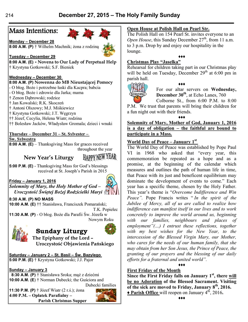 December 27, 2015 – The Holy Family Sunday 214 Mass Intentions: Monday – December 28 8:00 A.M. (P) † Wilhelm Machnik; żona z rodziną Tuesday – December 29 8:00 A.M. (E) - Novena to Our Lady of Perpetual Help † Krystyna Gotkowski; S.F. Bieniek Wednesday – December 30 8:00 A.M. (P) Nowenna do MB Nieustającej Pomocy - O błog. Boże i potrzebne łaski dla Kacpra; babcia - O błog. Boże i zdrowie dla Jarka; mama † Zenon Dąbrowski; rodzice † Jan Kowalski; R.K. Skoczeń † Antoni Olszowy; M.J. Miśkiewicz † Krystyna Gotkowski; J.T. Węgrzyn †† Józef, Cecylia, Helena Wiatr; rodzina †† Bolesław Jacków, Władysław Gromala; dzieci i wnuki Thursday – December 31 – St. Sylvester – Św. Sylwestra 8:00 A.M. (E) – Thanksgiving Mass for graces received throughout the year New Year’s Liturgy 5:00 P.M. (E) - Thanksgiving Mass for God’s blessings received at St. Joseph’s Parish in 2015 Friday – January 1, 2016 Solemnity of Mary, the Holy Mother of God – Uroczystość Świętej Bożej Rodzicielki Maryi 8:30 A.M. (P) NO MASS 10:00 A.M. (E) †† Stanisława, Franciszek Pomarański; T.K. Popielec 11:30 A.M. (P) - O błog. Boże dla Parafii Św. Józefa w Nowym Roku Sunday Liturgy The Epiphany of the Lord – Uroczystość Objawienia Pańskiego Saturday – January 2 – St. Basil – Św. Bazylego 5:00 P.M. (E) † Krystyna Gotkowski; J.J. Pajor Open House at Polish Hall on Pearl Str. The Polish Hall on 154 Pearl St. invites everyone to an Open House, this Sunday December 27th, from 11 a.m. to 3 p.m. Drop by and enjoy our hospitality in the lounge. ♦♦♦ Christmas Play “Jaselka” Rehearsal for children taking part in our Christmas play will be held on Tuesday, December 29th at 6:00 pm in parish hall. ♦♦♦ For our altar servers on Wednesday, December 30th, at Echo Lanes, 760 Colborne St., from 6:00 P.M. to 8:00 P.M. We trust that parents will bring their children for a fun night out with their friends. ♦♦♦ Solemnity of Mary, Mother of God, January 1, 2016 is a day of obligation – the faithful are bound to participate in a Mass. World Day of Peace – January 1st The World Day of Peace was established by Pope Paul VI in 1968 who asked that “every year, this commemoration be repeated as a hope and as a promise, at the beginning of the calendar which measures and outlines the path of human life in time, that Peace with its just and beneficent equilibrium may dominate the development of events to come.” Each year has a specific theme, chosen by the Holy Father. This year’s theme is “Overcome Indifference and Win Peace”. Pope Francis writes “ In the spirit of the Jubilee of Mercy, all of us are called to realize how indifference can manifest itself in our lives and to work concretely to improve the world around us, beginning with our families, neighbours and places of employment”(…) I entrust these reflections, together with my best wishes for the New Year, to the intercession of the Blessed Virgin Mary, our Mother, who cares for the needs of our human family, that she may obtain from her Son Jesus, the Prince of Peace, the granting of our prayers and the blessing of our daily efforts for a fraternal and united world”. ♦♦♦ Sunday – January 3 8:30 A.M. (P) † Stanisława Sroka; mąż z dziećmi 10:00 A.M. (E) † Norman Dubecki; the Guściora and Dubecki families 11:30 P.M. (P) † Józef Wiatr (2 r.ś.); żona 4:00 P.M. – Opłatek Parafialny – Parish Christmas Supper First Friday of the Month Since the First Friday falls on January 1st, there will be no Adoration of the Blessed Sacrament. Visiting of the sick are moved to Friday, January 8th, 2016. ♦ Parish Office will reopen on January 4th, 2016. ♦♦♦ 214 27 grudnia 2015 r. – Niedziela Świętej Rodziny Offertory Envelopes for 2016 are available at the back of the church. Dear Parishioners, As the winter months are now upon us, all parishioners are encouraged, for their safety, to enter the church through the new parking lot entrance. Here, the inside steps are not subject to the snow and ice which affects the outside steps. Additionally, parishioners are reminded NOT to park in the laneways of the parking lot. A thoroughfare is required for emergency vehicles and anyone dropping off elderly parishioners at our new entrance. Thank you in advance for your co-operation. Fr. Adam ******************************************** Wkroczyliśmy w okres zimowy. Zachęcam więc wszystkich parafian, aby dla ich własnego bezpieczeństwa korzystali z głównego wejścia do kościoła od strony parkingu. Schody zewnętrzne często mogą być oblodzone i zasypane śniegiem, co może spowodować niebezpieczne upadki. Ponadto zwracam szczególną uwagę wiernym, aby parkowali samochody tylko w wyznaczonych miejscach, ponieważ środek parkingu musi pozostać przejezdny w każdym czasie. Z góry dziękuję za wyrozumiałość. Ks. Adam Dzieci z Polskich Szkół, które będą występowały w Jasełkach przygotowywanych przez Parafię Św. Józefa, proszone są o przybycie na próbę do sali parafialnej we wtorek 29 grudnia na godz. 6:00 wieczorem. ♦♦♦ 1 stycznia – Światowy Dzień Pokoju Od 1968 r. Kościół katolicki 1 stycznia, w święto Bożej Rodzicielki Maryi, wita kolejny rok Światowym Dniem Pokoju. Ojciec Święty w tym dniu ogłasza okolicznościowe orędzie. W 2016 roku obchodzony on już jest po raz 49 i przebiega pod hasłem „Przezwycięż obojętność i zyskaj pokój”. Papież Franciszek w swoim orędziu na ten szczególny dzień pisze: ”Bóg nie jest obojętny! Dla Boga ludzkość jest ważna, Bóg jej nie opuszcza! Na początku nowego roku chciałbym, aby to moje głębokie przekonanie towarzyszyło życzeniom obfitego błogosławieństwa i pokoju, pełnym nadziei na przyszłość każdego mężczyzny i kobiety, każdej rodziny, ludu i narodu świata, a także szefów państw i rządów oraz zwierzchników religijnych. (...) W duchu Jubil