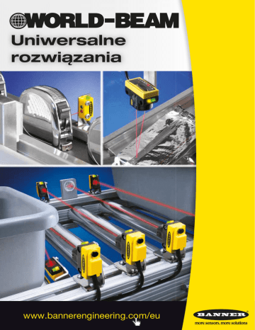 Uniwersalne rozwiązania www.bannerengineering.com/eu co om PRZECIWSOBNY PRZECIWSOBNY DO DETEKCJI WODY REFLEKSYJNY Q12 Miniaturowy QS18 Prostopadłościenny REFLEKSYJNY Z POLARYZACJĄ Wykonania z lub bez gwintu M18 LASEROWY REFLEKSYJNY (Z POL.) NADAJNIK LASEROWY Wytrzymała obudowa o wysokim stopniu uszczelnienia, wzmacniane metalem otwory montażowe oraz czytelne wskaźniki LED widoczne w 360º REFLEKSYJNY DLA OBIEKTÓW PRZEŹR. Zintegrowane złącze lub przewód ODBICIOWY ROZBIEŻNY Zintegrowany przewód zakończony wolnymi końcami lub złączem M8 albo M12 LASEROWY ODBICIOWY ODBICIOWY ZBIEŻNY ODBICIOWY ZE ST. ODC. TŁA Dostępne wykonania w otulinie PFA odpornej na związki agresywne chemicznie Szeroki wybór dodatkowych wykonań: laserowych, ultradźwiękowych, AC/DC ODBICIOWY Z UST. ODC. TŁA LASEROWY ODB. Z UST. ODC. TŁA Miniaturowe rozmiary Wersje AC/DC ŚWIATŁOWODOWY Wykonania laserowe cechujące się dużymi zasięgami oraz wysoką dokładnością ULTRADŹWIĘKOWY 2 Banner Engineering EMEA | www.bannerengineering.com/eu QS30 Zaawansowany Montaż za pomocą gwintu M30 lub otworów montażowych Zintegrowany przewód lub złącze Duża, jasna dioda LED z tyłu oraz czytelne w 360º diody LED na górze obudowy Dostępne wersje z przyciskiem TEACH, potencjometrem lub programowaniem zdalnym Nastawa za pomocą potencjometru lub przycisku TEACH Szeroki wybór uchwytów dla obu wariantów montażowych Wykonania specjalne do niezawodnej detekcji wody i jej roztworów Programowanie statyczne i dynamiczne, nastawa ręczna, bargraf, funkcje czasowe Q20 Kompaktowy Jasne diody LED stanu widoczne w 360° Wersje przeznaczone do pracy w ciężkich warunkach z wiązką świetlną o bardzo wysokim wzmocnieniu Kompaktowa, prostopadłościenna obudowa zgodna z przemysłowymi standardami; odległość między otworami montażowymi: 25,4 mm Prosta nastawa za pomocą jednoobrotowego potencjometru czułości (zależnie od typu) Stopień ochrony IP69K Wersje AC/DC Wykonania laserowe 3 Miniaturowe czujniki serii Q12 światło czerwone WORLD-BEAM Q12, 10-30 VDC, czerwona wiązka świetlna Tryb pracy Przeciwsobny Refleksyjny Refleksyjny z polaryzacją Odbiciowy ze stałym odc. tła LO DO Zasięg Podłączenie Wyjście W yjście Q126E Przewód 2 m Nadajnik Q126EQ Przewód 15 cm z 4-p. złąc. M8 Nadajnik Q126EQ3 Przewód 15 cm z 3-p. złąc. M8 Nadajnik Q12AB6R Q12RB6R Przewód 2 m Bipolarne PNP / NPN Q12AB6RQ Q12RB6RQ 2m Przewód 15 cm z 4-p. złąc. M8 Bipolarne PNP / NPN Q12AP6RQ3 Q12RP6RQ3 Przewód 15 cm z 3-p. złąc. M8 PNP Q12AN6RQ3 Q12RN6RQ3 Przewód 15 cm z 3-p. złąc. M8 NPN Q12AB6LV Q12RB6LV Przewód 2 m Bipolarne PNP / NPN Q12AB6LVQ Q12RB6LVQ Przewód 15 cm z 4-p. złąc. M8 Bipolarne PNP / NPN Q12AP6LVQ3 Q12RP6LVQ3 Przewód 15 cm z 3-p. złąc. M8 PNP Q12AN6LVQ3 Q12RN6LVQ3 Przewód 15 cm z 3-p. złąc. M8 NPN Q12AB6LP Q12RB6LP Przewód 2 m Bipolarne PNP / NPN Q12AB6LPQ Q12RB6LPQ Przewód 15 cm z 4-p. złąc. M8 Bipolarne PNP / NPN Q12AP6LPQ3 Q12RP6LPQ3 Przewód 15 cm z 3-p. złąc. M8 PNP Q12AN6LPQ3 Q12RN6LPQ3 Przewód 15 cm z 3-p. złąc. M8 NPN Q12AB6FF15 Q12RB6FF15 Przewód 2 m Bipolarne PNP / NPN Q12AB6FF15Q Q12RB6FF15Q Przewód 15 cm z 4-p. złąc. M8 Bipolarne PNP / NPN Q12AP6FF15Q3 Q12RP6FF15Q3 Przewód 15 cm z 3-p. złąc. M8 PNP Q12AN6FF15Q3 Q12RN6FF15Q3 Przewód 15 cm z 3-p. złąc. M8 NPN Q12AB6FF30 Q12RB6FF30 Przewód 2 m Bipolarne PNP / NPN Q12AB6FF30Q Q12RB6FF30Q Przewód 15 cm z 4-p. złąc. M8 Bipolarne PNP / NPN 1,5 m z BRT-60X40C 1m z BRT-60X40C Punkt odcięcia 15 mm Punkt odcięcia 30 mm Q12AP6FF30Q3 Q12RP6FF30Q3 Przewód 15 cm z 3-p. złąc. M8 PNP Q12AN6FF30Q3 Q12RN6FF30Q3 Przewód 15 cm z 3-p. złąc. M8 NPN Q12AB6FF50 Q12RB6FF50 Przewód 2 m Bipolarne PNP / NPN Q12AB6FF50Q Q12RB6FF50Q Przewód 15 cm z 4-p. złąc. M8 Bipolarne PNP / NPN Przewód 15 cm z 3-p. złąc. M8 PNP Przewód 15 cm z 3-p. złąc. M8 NPN Q12AP6FF50Q3 Q12RP6FF50Q3 Q12AN6FF50Q3 Q12RN6FF50Q3 Punkt odcięcia 50 mm Wersje w otulinie PFA odporne na związki agresywne chemicznie: W celu uzyskania wersji czujnika w otulinie PFA (przeciwsobnego lub odbiciowego ze stałym odcięciem tła) należy na końcu symbolu wersji z przewodem 2m dodać końcówkę CR (np. Q12AB6FF15CR). Wykonania te charakteryzują się zasięgiem 1,5 m w trybie przeciwsobnym oraz odpowiednio 12, 28 lub 48 mm w trybie odbiciowym ze stałym odcięciem tła. Podłączenie: wykonania z wyjściem bipolarnym – Zintegrowany 2 m przewód PVC (bez rozszerzenia symbolu) W/30 W celu uzyskania wersji z 9 m kablem PVC należy do symbolu wersji z 2 m przewodem dodać końcówkę W/30 Q Symbol wersji z przewodem 150 mm i 4-pinowym złączem M8 kończy się oznaczeniem Q Q5 Symbol wersji z przewodem 150 mm i 4-pinowym złączem M12 kończy się oznaczeniem Q5 4 Podłączenie: wykonania z wyjściem PNP lub NPN Q3 Symbol wersji z przewodem 150 mm i 3-pinowym złączem M8 kończy się oznaczeniem Q3 Kompatybilne z modułami I/O Podłączenie: wykonania w otulinie PFA – Czujniki w otulinie PFA odpornej na środki agresywne chemicznie (symbol z końcówką CR) wyposażone są w zintegrowany przewód 2 m Banner Engineering EMEA | www.bannerengineering.com/eu Czujniki kompaktowe serii Q20 światło czerwone światło podczerwone WORLD-BEAM Q20, 10-30 VDC, wiązka świetlna czerwona lub podczerwona Tryb pr pracy prac Symbol (PNP) Q20E Nadajnik Q20EQ5 Nadajnik Q20PR Przeciwsobny Podłączenie Przewód 2 m Przewód 15 cm z 4-pinowym złączem M12 12 m Przewód 2 m Q20PRQ5 Przewód 15 cm z 4-pinowym złączem M12 Q20EL Nadajnik Q20ELQ5 Nadajnik Q20PRL Przeciwsobny Zasięg Przewód 2 m Przewód 15 cm z 4-pinowym złączem M12 20 m Przewód 2 m Q20PRLQ5 Przewód 15 cm z 4-pinowym złączem M12 Q20PLV Przewód 2 m 6m z BRT-84 Q20PLVQ5 Przewód 15 cm z 4-pinowym złączem M12 Refleksyjny Q20PLP Przewód 2 m 4m z BRT-84 Q20PLPQ5 Przewód 15 cm z 4-pinowym złączem M12 Refleksyjny z polaryzacją Q20PD Q20PDQ5 Q20PDL Odbiciowy Q20PDLQ5 Przewód 2 m 250 mm Przew