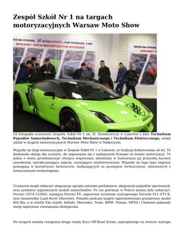 Zespół Szkół Nr 1 na targach motoryzacyjnych Warsaw Moto Show 18 listopada uczniowie Zespołu Szkół Nr 1 im. H. Sienkiewicza w Łukowie z klas Technikum Pojazdów Samochodowych, Technikum Mechanicznego i Technikum Elektrycznego, wzięli udział w targach motoryzacyjnych Warsaw Moto Show w Nadarzynie. Wyjazdy na targi motoryzacyjne w Zespole Szkół Nr 1 w Łukowie, to tradycja kultywowana od lat. To doskonała okazja dla uczniów, do zapoznania się z najlepszymi firmami ze świata motoryzacji. To jedno z wielu przedsięwzięć służące wspieraniu młodzieży w budowaniu jej przyszłej kariery zawodowej, uatrakcyjniające zajęcia, rozwijające zainteresowania. Wyjazdy na tego typu imprezy pomagają w kształceniu fachowców, nadążających za postępem technicznym, obeznanych z nowoczesnymi technologiami. Uczniowie mogli zobaczyć ekspozycje sprzętu extreme perfomance, ekspozycje pojazdów sportowych, oraz premiery najnowszych modeli samochodów. Po raz pierwszy w Polsce można było zobaczyć: Ferrari GTC4 LUSSO, następcę Ferrari FF, najnowsze wcielenie wyścigowego Porsche 911 GT3 R, oraz niezawodny Land Rover Discovery. Ponadto podczas targów zaprezentowano premierowy model KIA Rio, a w strefie Eko marki: Infiniti, Mercedes, Tesla, BMW, Nissan, MPX4 i Chatenet pokazały swoje najnowsze rozwiązania ekologiczne. Na targach została rozegrana druga runda Euro Off-Road Series, największego na świecie wyścigu modeli zdalnie sterowanych. W zawodach uczestniczyło 150 zawodników z całego świata. Specjalnie z myślą o młodzieży, przy współpracy z polskimi uczelniami, została przygotowana strefa edukacyjna. Można było porozmawiać z przyszłymi inżynierami i obejrzeć skonstruowane przez nich pojazdy wyścigowe, bolidy superekonomiczne, innowacyjne auta o alternatywnych źródłach napędu oraz konstrukcje nagrodzone na ogólnopolskich i światowych konkursach. Uczniom szczególnie przypadła do gustu specjalna strefa symulatorów i gier motoryzacyjnych oraz pokazy rajdowe.