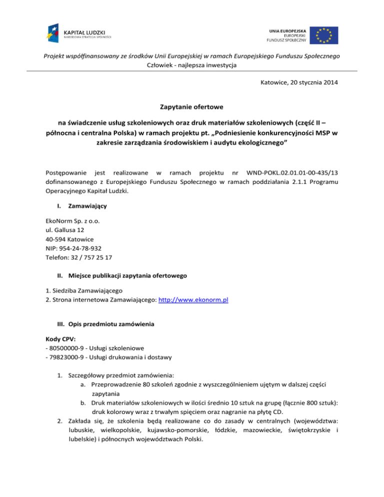 Projekt współfinansowany ze środków Unii Europejskiej w ramach Europejskiego Funduszu Społecznego Człowiek - najlepsza inwestycja Katowice, 20 stycznia 2014 Zapytanie ofertowe na świadczenie usług szkoleniowych oraz druk materiałów szkoleniowych (część II – północna i centralna Polska) w ramach projektu pt. „Podniesienie konkurencyjności MSP w zakresie zarządzania środowiskiem i audytu ekologicznego” Postępowanie jest realizowane w ramach projektu nr WND-POKL.02.01.01-00-435/13 dofinansowanego z Europejskiego Funduszu Społecznego w ramach poddziałania 2.1.1 Programu Operacyjnego Kapitał Ludzki. I. Zamawiający EkoNorm Sp. z o.o. ul. Gallusa 12 40-594 Katowice NIP: 954-24-78-932 Telefon: 32 / 757 25 17 II. Miejsce publikacji zapytania ofertowego 1. Siedziba Zamawiającego 2. Strona internetowa Zamawiającego: http://www.ekonorm.pl III. Opis przedmiotu zamówienia Kody CPV: - 80500000-9 - Usługi szkoleniowe - 79823000-9 - Usługi drukowania i dostawy 1. Szczegółowy przedmiot zamówienia: a. Przeprowadzenie 80 szkoleń zgodnie z wyszczególnieniem ujętym w dalszej części zapytania b. Druk materiałów szkoleniowych w ilości średnio 10 sztuk na grupę (łącznie 800 sztuk): druk kolorowy wraz z trwałym spięciem oraz nagranie na płytę CD. 2. Zakłada się, że szkolenia będą realizowane co do zasady w centralnych (województwa: lubuskie, wielkopolskie, kujawsko-pomorskie, łódzkie, mazowieckie, świętokrzyskie i lubelskie) i północnych województwach Polski. Projekt współfinansowany ze środków Unii Europejskiej w ramach Europejskiego Funduszu Społecznego Człowiek - najlepsza inwestycja 3. Termin realizacji zamówienia: szkolenia będą realizowane w okresie od podpisania umowy do 31.12.2014 r. 4. Szkolenia będą realizowane w formie stacjonarnej bądź wyjazdowej (w cenie szkolenia prosimy uwzględnić koszt dojazdu na szkolenie; wyżywienie dla jednego trenera na każde szkolenie oraz zakwaterowanie na każde szkolenie 2-dniowe będzie zapewnione przez Zleceniodawcę). 5. Zamawiający wskaże termin i miejsce realizacji szkoleń co najmniej 14 dni przed rozpoczęciem danego szkolenia. 6. Szczegółowy wykaz szkoleń: a. Szkolenie: Zarządzanie środowiskiem w przedsiębiorstwie: 1 dzień / 6 godzin dydaktycznych 12 grup szkoleniowych Ramowy program szkolenia: A. Odpowiedzialność przedsiębiorcy w zakresie prawa ochrony środowiska 1. Omówienie podstawowych wymagań w podziale na komponenty środowiska (powietrze, odpady, ścieki, hałas) - Decyzje - Ewidencje - Opłaty 2. Zagrożenia dla środowiska 3. Zagrożenia dla przedsiębiorcy - kary w przypadku zanieczyszczenia środowiska i nieprzestrzegania wymagań prawnych B. Narzędzia stosowane w prawidłowym zarządzaniu środowiskiem 1. Omówienie Normy PN ISO 14001 - Polityka środowiskowa - Cele - Aspekty środowiskowe 2. Korzyści wynikające z wdrożenia systemu 3. Koszty związane z wdrożeniem i certyfikacją systemu C. Problemy dotyczące ochrony środowiska w przedsiębiorstwie 1. Najczęściej pojawiające się problemy 2. Co zrobić, gdy przedsiębiorca zaniedba obowiązki wynikające z prawa? 3. Kontrole WIOŚ 4. Jak naprawić szkodę w środowisku? D. Panel dyskusyjny b. Szkolenie: Zarządzanie środowiskiem w przedsiębiorstwie przedsiębiorcy w zakresie emisji do powietrza i emisji hałasu: 1 dzień / 6 godzin dydaktycznych 8 grup szkoleniowych - Odpowiedzialność Projekt współfinansowany ze środków Unii Europejskiej w ramach Europejskiego Funduszu Społecznego Człowiek - najlepsza inwestycja Ramowy program szkolenia: 1. Omówienie podstawowych wymagań - Decyzje - Ewidencje - Opłaty 2. Zagrożenia dla środowiska 3. Zagrożenia dla przedsiębiorcy - kary w przypadku zanieczyszczenia środowiska i nieprzestrzegania wymagań prawnych c. Szkolenie: Zarządzanie środowiskiem w przedsiębiorstwie - Odpowiedzialność przedsiębiorcy w zakresie gospodarki wodno-ściekowej i gospodarki odpadami: 1 dzień / 6 godzin dydaktycznych 8 grup szkoleniowych Ramowy program szkolenia: 1. Omówienie podstawowych wymagań - Decyzje - Ewidencje - Opłaty 2. Zagrożenia dla środowiska 3. Zagrożenia dla przedsiębiorcy - kary w przypadku zanieczyszczenia środowiska i nieprzestrzegania wymagań prawnych d. Szkolenie: Zarządzanie środowiskiem w przedsiębiorstwie - Norma ISO 14001 jako narzędzie stosowane w prawidłowym zarządzaniu środowiskiem: 1 dzień / 6 godzin dydaktycznych 8 grup szkoleniowych Ramowy program szkolenia: 1. Omówienie Normy PN ISO 14001 - Polityka środowiskowa - Cele - Aspekty środowiskowe 2. Korzyści wynikające z wdrożenia systemu 3. Koszty związane z wdrożeniem i certyfikacją systemu e. Szkolenie: Zarządzanie środowiskiem w przedsiębiorstwie - Koszty związane z ochroną środowiska w przedsiębiorstwie - szkolenie wyjazdowe: 2 dni / 16 godzin dydaktycznych 3 grupy dydaktyczne Projekt współfinansowany ze środków Unii Europejskiej w ramach Europejskiego Funduszu Społecznego Człowiek - najlepsza inwestycja Ramowy program szkolenia: 1. Omówienie podstawowych wymagań w podziale na komponenty środowiska (powietrze, odpady, ścieki, hałas) - Decyzje - Ewidencje - Opłaty 2. Omówienie kosztów związanych z wymaganiami prawnymi w zakresie ochrony środowiska 3. Zagrożenia dla przedsiębiorcy - Kary w przypadku zanieczyszczenia środowiska - Kary w przypadku nieprzestrzegania wymagań prawnych 4. Narzędzia stosowane w prawidłowym zarządzaniu środowiskiem 5. Koszty związane z wdrożeniem i certyfikacją systemu 6. Problemy dotyczące ochrony środowiska w przedsiębiorstwie - Najczęściej pojawiające się problemy - Co zrobić, gdy przedsiębiorca zaniedba obowiązki wynikające z prawa? - Kontrole WIOŚ 7. Jak przygotować się do kontroli WIOŚ? 8. Jak naprawić szkodę w środowisku? 9. Panel dyskusyjny f. Szkolenie: Zarządzanie środowiskiem w przedsiębiorstwie - Polityka Zakładu w obszarze Zarządzania Środowiskowego- szkolenie 