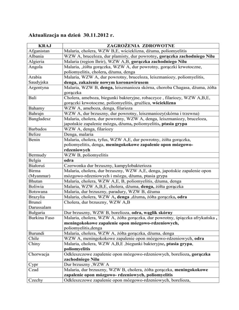 Aktualizacja na dzień 30.11.2012 r. KRAJ Afganistan Albania Algieria Angola Arabia Saudyjska Argentyna Bali Bahamy Bahrajn Bangladesz Barbados Belize Benin Bermudy Belgia Białoruś Birma (Myanmar) Bhutan Boliwia Botswana Brazylia Brunei Darussalam Bułgaria Burkina Faso Burundi Chile Chiny Chorwacja Cypr Czad Czechy ZAGROŻENIA ZDROWOTNE Malaria, cholera, WZW B,E, wścieklizna, dżuma, poliomyelitis WZW A, bruceloza, dur plamisty, dur powrotny, gorączka zachodniego Nilu Malaria (region Ihrir), WZW A,B, gorączka zachodniego Nilu Malaria, ,żółta gorączka, WZW A, dur powrotny, gorączki krwotoczne, poliomyelitis, cholera, dżuma, denga Malaria, WZW A, dur powrotny, bruceloza, leiszmaniozy, poliomyelitis, denga, zakażenie nowym koronawirusem Malaria, WZW B, denga, leiszmanioza skórna, choroba Chagasa, dżuma, żółta gorączka Cholera, ameboza, biegunki bakteryjne, robaczyce , filariozy, WZW A,B,E, gorączki krwotoczne, poliomyelitis, gruźlica, wścieklizna WZW A, ameboza, denga, filarioza WZW A, dur brzuszny, dur powrotny, leiszmaniozy(skórna i trzewna) Malaria, cholera, dur powrotny, WZW A, denga, leiszmaniozy, bruceloza, japońskie zapalenie mózgu, dżuma, poliomyelitis, ptasia grypa WZW A, denga, filariozy Denga, malaria Malaria, cholera, tyfus, WZW A,E, dur powrotny, żółta gorączka, poliomyelitis, denga, meningokokowe zapalenie opon mózgowordzeniowych WZW B, poliomyelitis odra Czerwonka dur brzuszny, kampylobakterioza Malaria, cholera, dur brzuszny, WZW A,E, denga, japońskie zapalenie opon mózgowo-rdzeniowych i mózgu, dżuma, ptasia grypa Malaria, cholera, WZW A,E, B, poliomyelitis, dżuma, denga Malaria, WZW A,B,E, cholera, dżuma, denga, żółta gorączka Malaria, dur brzuszny, paradury, WZW B, dżuma Malaria, cholera, WZW A, denga ,dżuma, żółta gorączka, odra Cholera, dur brzuszny, WZW A,B Dur brzuszny, WZW B, borelioza, odra, wąglik skórny Malaria, cholera, WZW A, żółta gorączka, dur powrotny, śpiączka afrykańska , meningokokowe zapalenie opon mózgowo-rdzeniowych, poliomyelitis,denga Malaria, cholera, WZW A, żółta gorączka, dżuma, denga WZW A, meningokokowe zapalenie opon mózgowo-rdzeniowych, odra Malaria, cholera, WZW A,B,E ,biegunki bakteryjne, ptasia grypa, poliomyelitis Odkleszczowe zapalenie opon mózgowo-rdzeniowych, borelioza, gorączka zachodniego Nilu Dur brzuszny ,WZW A Malaria, dur brzuszny, WZW B, cholera, żółta gorączka, meningokokowe zapalenie opon mózgowo- rdzeniowych, poliomyelitis Odkleszczowe zapalenie opon mózgowo-rdzeniowych, borelioza, Haiti zakażenia Clostridium difficile Malaria, cholera,WZW A,E,B, żółta gorączka, gorączki krwotoczne ,dżuma , meningokokowe zapalenie opon mózgowo- rdzeniowych, poliomyelitis, odra, Ebola Malaria, WZW B, denga, leptospiroza, cholera Malaria, WZW A,B,dury ,gorączki krwotoczne, poliomyelitis,denga, Malaria, dur brzuszny, cholera, dur powrotny, poliomyelitis, ptasia grypa Malaria, cholera, WZW A, żółta gorączka, dżuma, denga, odra Malaria, cholera, WZW A,E ,żółta gorączka, denga WZW A, odkleszczowe zapalenie opon mózgowo-rdzeniowych, borelioza Malaria, WZW A,E, dury, gorączki krwotoczne, poliomyelitis, żółta gorączka, denga, cholera, odra WZW A,E,, denga, dur brzuszny Malaria, cholera, WZW A, E, gorączki krwotoczne, denga , japońskie zapalenie mózgu ,meningokokowe zapalenie opon mózgowordzeniowych, Borelioza, odkleszczowe zapalenie opon mózgowo-rdzeniowych Odra Malaria, WZW A,E,B, gorączki krwotoczne, denga, dur powrotny, poliomyelitis, śpiączka afrykańska, cholera, żółta gorączka Malaria, cholera, WZW A,E, gorączki krwotoczne, denga, dur powrotny, poliomyelitis, żółta gorączka, meningokokowe zapalenie opon mózgowordzeniowych Malaria, cholera, WZW A,E,B gorączki krwotoczne, denga, żółta gorączka, meningokokowe zapalenie opon mózgowo-rdzeniowych, poliomyelitis Odkleszczowe zapalenie opon mózgowo-rdzeniowych, gorączka zachodniego Nilu, malaria Malaria,, cholera, WZW A,E, B, gorączki krwotoczne, denga. Malaria, cholera, gorączki krwotoczne, WZW A,B, wścieklizna, denga, żółta gorączka WZW A, B, tężec, błonica, dur brzuszny, denga Malaria, cholera, WZW A,B,E, gorączki krwotoczne, poliomyelitis, denga Malaria, WZW A,B,E , żółta gorączka ,denga, gorączki krwotoczne, poliomyelitis, cholera Malaria, WZW A,B,E, gorączki krwotoczne, denga, tularemia, cholera Hiszpania odra Holandia Honduras Hongkong Indie odra Malaria, WZW A,B,E, gorączki krwotoczne, denga, wścieklizna Malaria, cholera, WZW A,E Malaria, cholera, WZW A,E, gorączki krwotoczne, denga, japońskie zapalenie mózgu, meningokokowe zapalenie opon mózgowo-rdzeniowych chikungunya, dżuma , poliomyelitis Malaria, cholera, WZW A,E,B, gorączki krwotoczne, denga, poliomyelitis, gruźlica, dżuma, meningokokowe zapalenie opon mózgowo- rdzeniowych, wścieklizna, ptasia grypa , chikungunya Malaria, gorączki krwotoczne, denga, poliomyelitis, WZW B, Malaria, cholera, WZW A,B,C, dur powrotny, gorączki krwotoczne, poliomyelitis , gorączka krymsko-kongijska, dżuma Czechy (cd) Demokratyczna Republika Konga Dominikana Dżibuti Egipt Ekwador Erytrea Estonia Etiopia Fidżi Filipiny Finlandia Francja Gabon Gambia Ghana Grecja Gujana Gujana Francuska Gwadelupa Gwatemala Gwinea Indonezja Irak Iran Odkleszczowe zapalenie opon mózgowo-rdzeniowych, borelioza Odkleszczowe zapalenie opon mózgowo-rdzeniowych, borelioza gorączka zachodniego Nilu, WZW A,E,B, gorączki krwotoczne, denga, malaria Gorączki krwotoczne, cholera, japońskie zapalenie mózgu, denga Malaria, cholera, WZW A,B,E, bruceloza, gorączki krwotoczne, dury odkleszczowe,, poliomyelitis, denga Jordania Cholera, WZW A,E, dury odkleszczowe, poliomielitis, zakażenie nowym koronawirusem Kambodża Malaria, cholera, WZW A,E,B, gorączki krwotoczne, japońskie zapalenie mózgu, dżuma, denga, ptasia grypa,*HFMD Kamerun Malaria, cholera, WZW A,E,C, gorączki krwotoczne, poliomyelitis, meningokokowe zapalenie opon mózgowo-rd
