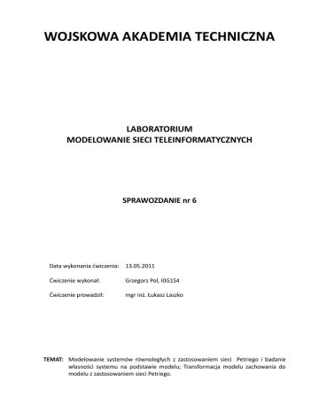 WOJSKOWA AKADEMIA TECHNICZNA LABORATORIUM MODELOWANIE SIECI TELEINFORMATYCZNYCH SPRAWOZDANIE nr 6 Data wykonania ćwiczenia: 13.05.2011 Ćwiczenie wykonał: Grzegorz Pol, I0G1S4 Ćwiczenie prowadził: mgr inż. Łukasz Laszko TEMAT: Modelowanie systemów równoległych z zastosowaniem sieci Petriego i badanie własności systemu na podstawie modelu; Transformacja modelu zachowania do modelu z zastosowaniem sieci Petriego. 1. Treść zadania Zad.1 W programie PIPE odtworzyć niżej pokazaną sieć Petriego (rysunek 1) symulującą działanie automatu do kawy. Zbadać jej własności (ograniczoność, bezpieczeństwo, występowanie zakleszczeń) oraz wygenerować i opisać graf osiągalności. Następnie zmodyfikować sieć, uszczegółowiając proces przygotowania napoju tak, aby składał się on z kawy, wody, mleka i cukru (przyjąć założenie o niewyczerpalności wspomnianych składników). Po tym znów zbadać własności utworzonej sieci (jak zmieniły się one w stosunku do sieci pierwotnej ?). Ograniczyć liczbę możliwych do przygotowywania napojów do 30. Zbadać własności sieci, wyciągnąć wnioski. Rysunek 1 Zad.2 Za pomocą sieci Petriego zamodelować proces nawiązywania połączenia w protokole TCP (tzw. 3-way TCP handshake). Zbadać własności utworzonej sieci. Zad.3 Poniższa sieć Petriego (rysunek 2) stanowi prezentację najprostszego przypadku problemu producenta i konsumenta. Należy odtworzyć ją w programie PIPE oraz zbadać jej własności. Następnie dokonać modyfikacji tej sieci, dodając jednego producenta (jaki ma to wpływ na bufor ?). Ponownie zmodyfikować sieć, dodając jeszcze jednego producenta i drugiego konsumenta. Wyeliminować problem nieograniczoności sieci. Pokazać jak może dojść do zakleszczenia w tej sieci. Powrócić do pierwotnej postaci sieci (jeden producent, jeden konsument). Zmodyfikować sieć tak, by działała ona zgodnie z następującym scenariuszem: W stanie początkowym producent ma wyprodukowanych 5 elementów, Konsument, który może skonsumować tylko dokładnie 2 elementy naraz, po konsumpcji wysyła sygnał zwrotny do producenta, informując go o zakończeniu konsumpcji, Po otrzymaniu sygnału od konsumenta, producent wznawia produkcję. Nie dopuścić do zakleszczenia w sieci. Rysunek 2 Sprawozdanie: Każdy student zobowiązany jest wykonać sprawozdanie dokumentujące jego własną pracę. W sprawozdaniu należy zawrzeć krótki opis wykonanego zadania, opisane diagramy i wnioski płynące z rozwiązania (należy wykorzystać niniejszy szablon sprawozdania). Sprawozdanie należy umieścić na portalu. 2. Realizacja zadania 3.1 Automat do kawy Na poniższym rysunku odwzorowałem sieć Petriego, która symuluje zachowanie automatu do kawy. Następnie dokonałem analizy sieci Petriego. Wynik tej analizy zamieszczam na na następnym rysunku: Analiza wykazała, że stworzona przeze mnie sieć jest ograniczona (właściwość Bounded), bezpieczna (właściwość Safe) oraz pozbawiona zakleszczeń (właściwość Deadlock). Ostatnim etapem badania stworzonej sieci było wygenerowanie za pomocą aplikacji PIPE grafu osiągalności dla stworzonej sieci. Graf ten zamieszczam poniżej: Dzięki powyższemu grafowi jesteśmy w stanie określić poprawność naszego modelu sieci. Ponadto widzimy na nim wszystkie możliwe drogi do osiągnięcia poszczególnych stanów w modelu. Model wyróżnia następujące stany: S0 - Stan początkowy z którego możemy przedostać się wyłącznie do stanu S1 po wykonaniu tranzycji T2. Czyli, żeby przenieść się do stanu S1 należy wrzucić monetę. S1 - Z tego stanu możemy przedostać się do stanu S0 po wykonaniu tanzycji T1 (operacja anulowano) oraz do stanu S2 po wykonaniu tranzycji T3 (operacja wybrano napój). S2 - Ze stanu w którym automat przygotowuje nam napój jesteśmy w stanie przejść wyłącznie do stanu S0 po wykonaniu tranzycji T0 (odebrano napój). 3.2 Automat do kawy z uwzględnieniem jej składników Drugi podpunkt w zadaniu pierwszym polegał na uwzględnieniu składników kawy (czyli proces tworzenia kawy). Pod uwagę nie było brana ilość dostępnych składników. Rysunek zmodyfikowanej sieci przedstawiam poniżej: Następnie dokonałem analizy sieci, która wykazała, że stworzona przeze mnie sieć jest tak samo jak w przypadku poprzedniej sieci ograniczona (właściwość Bounded), bezpieczna (właściwość Safe) oraz pozbawiona zakleszczeń (właściwość Deadlock). Graf osiągalności sieci wygląda identycznie jak poprzedni z różnicą taką, że aby dostać się ze stanu wybrano napój a odebrano napój trzeba przejść przez stany dodawania każdego składnika kawy. 3.3 Automat do kawy z uwzględnieniem jej składników Kolejny podpunkt polegał na ograniczeniu liczby przygotowanych napojów do 30. Model przedstawiam poniżej: W porównaniu do poprzedniego modelu na tym pojawiła się nowa tranzycja T7, która za pomocą miejsca P7 rejestruje przejścia (z tranzycji T7 token "przeskakuje" zarówno do P7 i P6). W momencie kiedy liczba przejść wyniesie 30 ruch przez tranzycję T7 zostanie zablokowany, a każda transakcja zostanie anulowana. Analiza modelu wykazała, że sieć nadal jest ograniczona i jest pozbawiona zakleszczeń, ale nie jest już bezpieczna. Sieć przstała być bezpieczna z powodu wprowadzonego ograniczenia, które po 30 przejściach zablokuje tranzycję T7. 3.4 Nawiązywanie połączeń w protokole TCP Kolejny podpunkt polegał na zamodelowaniu za pomocą sieci Petriego procesu nawiązywania połączenia w protokole TCP (tzw. 3-way TCP handshake), a następnie zbadaniu własności utworzonej sieci. Model sieci zamieszczam poniżej: Analizę stanów została przedstawiona poniżej. Zamodelowana sieć jest ograniczona, bezpieczna i nie występują w niej zakleszczenia. 3.5 Działanie producenta i konsumenta Kolejny podpunkt polegał na zamodelowaniu za pomocą sieci Petriego procesu symulującego zachowanie producenta i konsumenta. Po