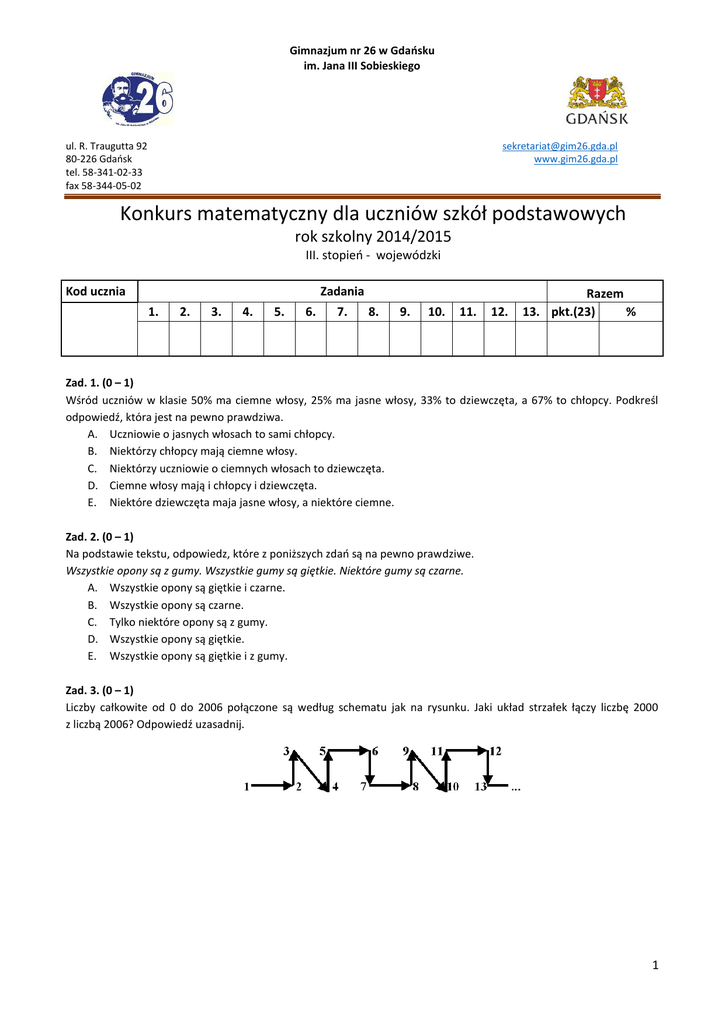 Gimnazjum nr 26 w Gdańsku im. Jana III Sobieskiego ul. R. Traugutta 92 80-226 Gdańsk tel. 58-341-02-33 fax 58-344-05-02 [email protected] www.gim26.gda.pl Konkurs matematyczny dla uczniów szkół podstawowych rok szkolny 2014/2015 III. stopień - wojewódzki Kod ucznia Zadania 1. 2. 3. 4. 5. 6. 7. 8. 9. 10. 11. 12. Razem 13. pkt.(23) % Zad. 1. (0 – 1) Wśród uczniów w klasie 50% ma ciemne włosy, 25% ma jasne włosy, 33% to dziewczęta, a 67% to chłopcy. Podkreśl odpowiedź, która jest na pewno prawdziwa. A. Uczniowie o jasnych włosach to sami chłopcy. B. Niektórzy chłopcy mają ciemne włosy. C. Niektórzy uczniowie o ciemnych włosach to dziewczęta. D. Ciemne włosy mają i chłopcy i dziewczęta. E. Niektóre dziewczęta maja jasne włosy, a niektóre ciemne. Zad. 2. (0 – 1) Na podstawie tekstu, odpowiedz, które z poniższych zdań są na pewno prawdziwe. Wszystkie opony są z gumy. Wszystkie gumy są giętkie. Niektóre gumy są czarne. A. Wszystkie opony są giętkie i czarne. B. Wszystkie opony są czarne. C. Tylko niektóre opony są z gumy. D. Wszystkie opony są giętkie. E. Wszystkie opony są giętkie i z gumy. Zad. 3. (0 – 1) Liczby całkowite od 0 do 2006 połączone są według schematu jak na rysunku. Jaki układ strzałek łączy liczbę 2000 z liczbą 2006? Odpowiedź uzasadnij. 1 Zad. 4. ( 0 – 2) Pan Jerzy zamierza zakupić prostokątną działkę o powierzchni 1600 arów. Spośród kilku propozycji wybrał tę, której obwód jest najmniejszy. Jakiej długości są boki wybranej działki? Zaprezentuj tok rozumowania pana Jerzego przy dokonywaniu wyboru działki. Zad. 5. (0 – 2) W niewielkiej sali, w której odbywał się wykład, wszystkie miejsca były zajęte. W każdym rzędzie krzeseł siedziała jedna kobieta, zaś resztę miejsc zajmowali mężczyźni. Liczba krzeseł w jednym rzędzie nie przekraczała 15. Na sali było więcej niż 80 osób, a mniej niż 90. Ile kobiet, a ile mężczyzn było na wykładzie? Uzasadnij swoją odpowiedź. Jeżeli stwierdzasz, że jest więcej niż jedno rozwiązanie – wskaż je. Zad. 6. (0 – 2) W sadzie znajduje się 16 drzew owocowych posadzonych w cztery rzędy po cztery drzewa w każdym rzędzie. Odległość między drzewami rosnącymi obok siebie jest równa 5 metrów. Jaką długość ma najkrótsza trasa, jaką musi przejść ogrodnik w celu obejścia wszystkich drzew? Naszkicuj tę trasę. Uzasadnij swoją odpowiedź. 2 Zad. 7. (0 – 2) Uzasadnij, czy istnieje kwadrat, dla którego długość obwodu w metrach wyraża się tą samą liczbą, co pole powierzchni w centymetrach kwadratowych. Jeśli jest – podaj długość jego boku. Zad. 8. (0 – 2) Ile należy zbudować dróg, aby siedem miejscowości miało bezpośrednie połączenie ze sobą? Zapisz swoje rozumowanie. Przedstaw połączenia między tymi miejscowościami graficznie. Zad. 9. (0 – 2) Państwo Sokolniccy zamierzają kupić nowy samochód. W tym celu obserwują jak zmieniają się ceny samochodów. Jesienią cena wymarzonego auta wzrosła o 10%, ale tuż przed końcem roku zmalała o 10%. Czy cena samochodu, który chcą kupić państwo Sokolniccy, wzrosła czy zmalała w stosunku do ceny początkowej? O ile procent pierwotnej ceny zmieniła się ostateczna cena tego samochodu? Uzasadnij swoją odpowiedź. Zad. 10. (0 – 1) Klasa szła parami na wycieczkę. Basia obróciła się za siebie i naliczyła 7 par, a gdy spojrzała ku przodowi naliczyła 5 par. Ilu uczniów szło na wycieczkę? Uzasadnij swoją odpowiedź. 3 Zad. 11. (0 – 2) Długości dwóch boków trójkąta są równe odpowiednio: 3 cm i 9 cm. Podaj długość trzeciego boku tego trójkąta, wiedząc, że wyraża się ona liczbą naturalną. Uzasadnij odpowiedź. Czy zadanie ma tylko jedno rozwiązanie? Jeśli nie – wskaż wszystkie. Zad. 12. (0 – 3) Dorosłe ufoludki, żyjące na planecie AGPAW, rodzą w ciągu jednej godziny 10 malutkich ufoludków. Każdy ufoludek żyje tylko 5 godzin, a zaczyna się rozmnażać w drugiej godzinie życia. Oblicz, ilu potomków miał ufoludek, który żyje już 4 godziny. Zapisz rozwiązanie. Zad. 13. (0 – 2) Narysuj dowolny trójkąt prostokątny ABC. Przedłuż przeciwprostokątną AB. Na zewnątrz trójkąta, na przedłużeniu przeciwprostokątnej, otrzymasz odcinki AD i BE. Wiedząc, że odcinki AD i AC są równe oraz równe są odcinki BE i BC, o uzasadnij, że kąt DCE ma 135 . 4