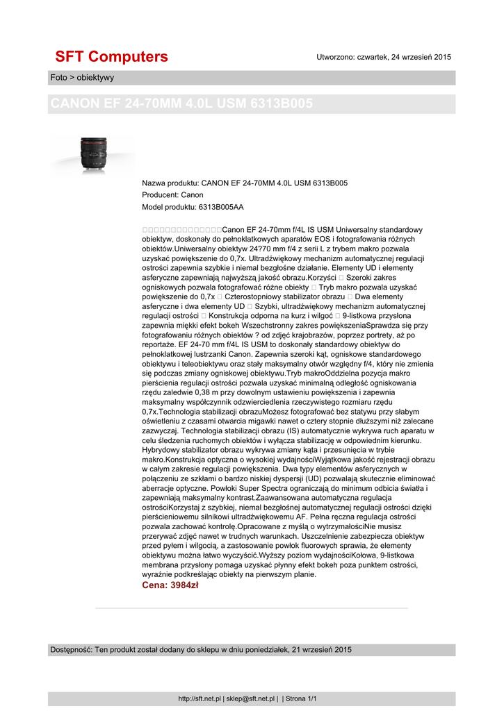 SFT Computers Utworzono: czwartek, 24 wrzesień 2015 Foto > obiektywy CANON EF 24-70MM 4.0L USM 6313B005 Nazwa produktu: CANON EF 24-70MM 4.0L USM 6313B005 Producent: Canon Model produktu: 6313B005AA Canon EF 24-70mm f/4L IS USM Uniwersalny standardowy obiektyw, doskonały do pełnoklatkowych aparatów EOS i fotografowania różnych obiektów.Uniwersalny obiektyw 24?70 mm f/4 z serii L z trybem makro pozwala uzyskać powiększenie do 0,7x. Ultradźwiękowy mechanizm automatycznej regulacji ostrości zapewnia szybkie i niemal bezgłośne działanie. Elementy UD i elementy asferyczne zapewniają najwyższą jakość obrazu.Korzyści Szeroki zakres ogniskowych pozwala fotografować różne obiekty Tryb makro pozwala uzyskać powiększenie do 0,7x Czterostopniowy stabilizator obrazu Dwa elementy asferyczne i dwa elementy UD Szybki, ultradźwiękowy mechanizm automatycznej regulacji ostrości Konstrukcja odporna na kurz i wilgoć 9-listkowa przysłona zapewnia miękki efekt bokeh Wszechstronny zakres powiększeniaSprawdza się przy fotografowaniu różnych obiektów ? od zdjęć krajobrazów, poprzez portrety, aż po reportaże. EF 24-70 mm f/4L IS USM to doskonały standardowy obiektyw do pełnoklatkowej lustrzanki Canon. Zapewnia szeroki kąt, ogniskowe standardowego obiektywu i teleobiektywu oraz stały maksymalny otwór względny f/4, który nie zmienia się podczas zmiany ogniskowej obiektywu.Tryb makroOddzielna pozycja makro pierścienia regulacji ostrości pozwala uzyskać minimalną odległość ogniskowania rzędu zaledwie 0,38 m przy dowolnym ustawieniu powiększenia i zapewnia maksymalny współczynnik odzwierciedlenia rzeczywistego rozmiaru rzędu 0,7x.Technologia stabilizacji obrazuMożesz fotografować bez statywu przy słabym oświetleniu z czasami otwarcia migawki nawet o cztery stopnie dłuższymi niż zalecane zazwyczaj. Technologia stabilizacji obrazu (IS) automatycznie wykrywa ruch aparatu w celu śledzenia ruchomych obiektów i wyłącza stabilizację w odpowiednim kierunku. Hybrydowy stabilizator obrazu wykrywa zmiany kąta i przesunięcia w trybie makro.Konstrukcja optyczna o wysokiej wydajnościWyjątkowa jakość rejestracji obrazu w całym zakresie regulacji powiększenia. Dwa typy elementów asferycznych w połączeniu ze szkłami o bardzo niskiej dyspersji (UD) pozwalają skutecznie eliminować aberracje optyczne. Powłoki Super Spectra ograniczają do minimum odbicia światła i zapewniają maksymalny kontrast.Zaawansowana automatyczna regulacja ostrościKorzystaj z szybkiej, niemal bezgłośnej automatycznej regulacji ostrości dzięki pierścieniowemu silnikowi ultradźwiękowemu AF. Pełna ręczna regulacja ostrości pozwala zachować kontrolę.Opracowane z myślą o wytrzymałościNie musisz przerywać zdjęć nawet w trudnych warunkach. Uszczelnienie zabezpiecza obiektyw przed pyłem i wilgocią, a zastosowanie powłok fluorowych sprawia, że elementy obiektywu można łatwo wyczyścić.Wyższy poziom wydajnościKołowa, 9-listkowa membrana przysłony pomaga uzyskać płynny efekt bokeh poza punktem ostrości, wyraźnie podkreślając obiekty na pierwszym planie. Cena: 3984zł Dostępność: Ten produkt został dodany do sklepu w dniu poniedziałek, 21 wrzesień 2015 http://sft.net.pl | [email protected] | | Strona 1/1