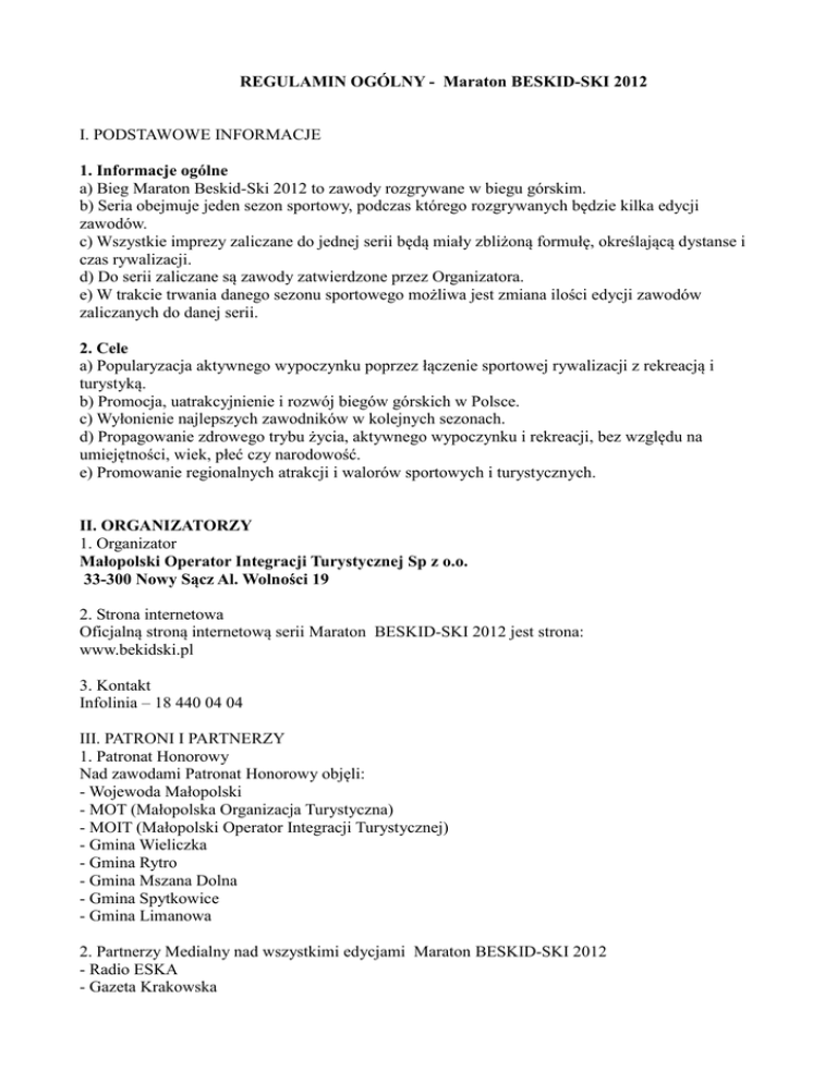 REGULAMIN OGÓLNY - Maraton BESKID-SKI 2012 I. PODSTAWOWE INFORMACJE 1. Informacje ogólne a) Bieg Maraton Beskid-Ski 2012 to zawody rozgrywane w biegu górskim. b) Seria obejmuje jeden sezon sportowy, podczas którego rozgrywanych będzie kilka edycji zawodów. c) Wszystkie imprezy zaliczane do jednej serii będą miały zbliżoną formułę, określającą dystanse i czas rywalizacji. d) Do serii zaliczane są zawody zatwierdzone przez Organizatora. e) W trakcie trwania danego sezonu sportowego możliwa jest zmiana ilości edycji zawodów zaliczanych do danej serii. 2. Cele a) Popularyzacja aktywnego wypoczynku poprzez łączenie sportowej rywalizacji z rekreacją i turystyką. b) Promocja, uatrakcyjnienie i rozwój biegów górskich w Polsce. c) Wyłonienie najlepszych zawodników w kolejnych sezonach. d) Propagowanie zdrowego trybu życia, aktywnego wypoczynku i rekreacji, bez względu na umiejętności, wiek, płeć czy narodowość. e) Promowanie regionalnych atrakcji i walorów sportowych i turystycznych. II. ORGANIZATORZY 1. Organizator Małopolski Operator Integracji Turystycznej Sp z o.o. 33-300 Nowy Sącz Al. Wolności 19 2. Strona internetowa Oficjalną stroną internetową serii Maraton BESKID-SKI 2012 jest strona: www.bekidski.pl 3. Kontakt Infolinia – 18 440 04 04 III. PATRONI I PARTNERZY 1. Patronat Honorowy Nad zawodami Patronat Honorowy objęli: - Wojewoda Małopolski - MOT (Małopolska Organizacja Turystyczna) - MOIT (Małopolski Operator Integracji Turystycznej) - Gmina Wieliczka - Gmina Rytro - Gmina Mszana Dolna - Gmina Spytkowice - Gmina Limanowa 2. Partnerzy Medialny nad wszystkimi edycjami Maraton BESKID-SKI 2012 - Radio ESKA - Gazeta Krakowska - Nasze Miasto.pl - Sądeczanin.pl - Małopolska Online - Podhale Region - Limanowa.naszemiasto.pl IV. TERMINY I MIEJSCA POSZCZEGÓLNYCH EDYCJI: a) I edycja zawodów „Maraton BESKID-SKI” Termin : 30.06.2012 Adres :Podstolice SKI , Podstolice 260, 32-020 Wieliczka Dystans: 5 km Godzina rozpoczęcia imprezy 9.00 Godzina rozpoczęcia biegu głównego : 11.00 Zapisy : przez formularz zgłoszeniowy lub w dniu zawodów w punkcie rejestracji zawodników (Szkółka narciarska / dolna stacja) b) II edycja zawodów „Maraton BESKID-SKI” Termin : 14.07.2012 Adres : SN Śnieżnica , Kasina Wielka 672 Dystans: 10 km Godzina rozpoczęcia imprezy : 9.00 Godzina rozpoczęcia biegu głównego : 11.00 Zapisy : przez formularz zgłoszeniowy lub w dniu zawodów w punkcie rejestracji zawodników (Karczma Śnieżnica ) c) III edycja zawodów „Maraton BESKID-SKI” Termin : 29.07.2012 Adres : SN Ryterski Raj , 33 - 343 RYTRO 302 Dystans: 7 km Godzina rozpoczęcia imprezy : 9.00 Godzina rozpoczęcia biegu głównego : 11.00 Zapisy : przez formularz zgłoszeniowy lub w dniu zawodów w punkcie rejestracji zawodników (Oberża pod Aniołami ) d) IV edycja zawodów „Maraton BESKID-SKI” Termin : 12.08.2012 Adres : SN Beskid , Spytkowice 135 A Dystans: 10 km Godzina rozpoczęcia imprezy : 9.00 Godzina rozpoczęcia biegu głównego : 11.00 Zapisy : przez formularz zgłoszeniowy lub w dniu zawodów w punkcie rejestracji zawodników (Kompleks Beskid) e) V edycja zawodów „Maraton BESKID-SKI” Termin : 26.08.2012 Adres : SN Limanowa SKI , Limanowa, Łysa Góra , ( z centrum Limanowej – ok. 5km. – należy jechać w kierunku miejscowości Mordarka a następnie skręcić w lewo w ulicę Polną i jechać ok. 4km) Dystans: 10 km Godzina rozpoczęcia imprezy : 9.00 Godzina rozpoczęcia biegu głównego : 11.00 Zapisy : przez formularz zgłoszeniowy lub w dniu zawodów w punkcie rejestracji zawodników (Pawilon Gastronomiczny Żywiec – Dolna Stacja ) V. WARUNKI UCZESTNICTWA 1. Informacje ogólne a) Udział w poszczególnych zawodach może wziąć każdy, kto ukończył 16 lat (najpóźniej w dniu startu). b) Osoby poniżej 18 roku życia mogą brać udział w zawodach za pisemną zgodą rodziców lub opiekunów prawnych. c) Każdy uczestnik startuje na własną odpowiedzialność (w przypadku zawodników niepełnoletnich na odpowiedzialność rodziców lub prawnych opiekunów). d) warunkiem dopuszczenia do startu jest spełnienie wymogów określonych w regulaminie ogólnym cyklu zawodów. 2. Limit uczestników Organizator gwarantuje przyjęcie zgłoszeń pierwszych 200 zawodników na każdą edycję zawodów w ramach cyklu BIEG BESKID-SKI 2012. Istnieje możliwość zwiększenia limitu ( informacja taka może znaleźć się w regulaminie poszczególnych edycji) VI. ZGŁOSZENIA a) Uczestnikiem zawodów może być osoba, która spełni następujące warunki: - wypełni formularz zgłoszeniowy zamieszczony na stronie organizatora( www.beskidski.pl) lub www.pifsport.pl albo dokona osobistego zgłoszenia w Biurze Zawodów (podczas rejestracji przed startem), - dokona opłaty startowej w wysokości zgodnej z regulaminem. Oryginał dowodu opłaty startowej należy zachować do wglądu podczas rejestracji w Biurze Zawodów, - złoży czytelny podpis na oświadczeniu przed startem w zawodach. b) Prawidłowe zgłoszenie obejmuje rejestrację (wypełnienie formularza zgłoszeniowego) i wniesienie opłaty startowej. c) Listy startowe zamykane będą na godzinę przed startem. d) każdy uczestnik winien w dniu zawodów zgłosić się do biura zawodów i potwierdzić swój udział odbierając numer startowy i przedstawić dowód opłaty startowej oraz podpisać odp. Oświadczenie. e) Opłaty startowe - Wysokość opłaty startowej w w poszczególnych edycjach zawodów wynosi 30 zł. Opłata wpisowego może być dokonywana w formie przelewów z banków tradycyjnych i internetowych na konto Organizatora oraz wpłat gotówkowych w Biurze Zawodów. f) Na przelewie bankowym należy koniecznie zaznaczyć tytuł opłaty i numer danej edycji, np.: "wpisowe na MBS 2012 - Edycja 1 + Jan Kowalski". konto nr Alior Bank 79-2490-0005-0000-4520-5841-4422 W przypadku nie podania tytułu wpłaty zostanie ona zaksięgowana na poczet najbliższych zawodów zgodnie z obow