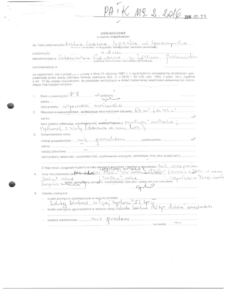 Wii/ic iii. '_„ „ima ...... OŚWiADCZENIE o stanie majątkowym Ja nizej podpisany(a ”)i/„t „S ) . . KUL/LQ. .pl... LL < L&L. LAfQ/Tqrwk kopie/€ zypadku podaćnaZWisko pameńsk na: „._ „W. igla-. . . . ) urodzony(aa)r zatrudniony(a )w...JUKA/(A.W.! zamieszkaMa) w działalnośm gospo zapoznaniu się z przepiowu o:.iawy z dnia Zi sierpnia 1997 r. o ograniczeniu prowadzenia podarczej pizez osoby pełniące funkcje pubiiczne (Dz U. z 2006 r. Nr 216 poz 1584 z póżn. zm) zgodnie iub Stano— z art. 10 tej ustawy oświadczam ze posiadam wchodzące w skład maizeńskiej wspólności ustawowej W|ące rnb] majątek odrębny *]. Dom @ pOWierzchn'i/l 8.. .. adres: 'iytui 2. I m2 połozony . ..... prawny .W”? „;o _i && MUL./„(illi £.(Ś'...'.. wiasnościowelubiane). Mieszkanie—Auzasneaerowe spoldyeicze adres: tytutprawny(Magnusa. współwjasność WT VTL Wicik/ostudaaiu). 1D ' V.) 3. _ Gospodarstwo rolne. rodzaj gospodarstwa: ....' adres: .............................. rodzaj zabudowy: ............... tytuł prawny (własność. współwłasnośc, użytkowanie Wieczyste. dzierzawa. mny tytuł. podać jaki): Z lego tytułu 05|ągnąiern(ętam) w roku 4 inne nieruchomośo 4135/57 5. i |»?dewp?” . ** ”ESPA hm../».. „.(/)i)". .. [... ; .. -, ,. " i .. .(.Cf'ń'v 1” ”<...? rh?” L'”WV."rm)/il ećMiia; (plL'wafa-JHAL„ ! m1... (MATAm; ublięsymmychoddechóEw Nysokoscr ' . . ” ”'A "A?" , J/Sńw'". iii?/).). [Amx.x] wsooiwjasnośc' |nny tyiuł- podac jaki oraz inne dane) Zasoby piemęzrie: — środki pieniężne zgromadzone w „ .LJ/QHĄX bum/Wkł. - ~ waiucie polskiej:... L„J.... „(Sun . Liwii-z.. srodki pieniężne zgromadzone w waIUCie obcej. papiery wartościowe. .............. $]ij :) MPKAPLA .. . (TQS/(.o? .... [| ............... ”WŁ „(YJDGQVV] .. na kwotę:. K&M wią Qwiixdą "*) |ub/L:? H Państwa, inne] państwowej osoby prawnej. Jednostek Nabyłem(arn) (nabył mój małzonek) mienie od Skarbu komunalnej osoby prawne], które podlegało zbyw w drodze samorządu terytorialnego, ich związków lub od przetargu. _nle' tak' Podać rodzaj mienia, date nabycia. od kogo „m.iĘ.„.„ „ Kl.V/NW .VXO/ .. !II ZMW ani tez zarządu ani rady nadzorczej, komisji revvizygnej spółki prawa handiowego, dzxaiainość gospodarczą. prowadzącej fundaqi członkiem zarządu 1 a' Nie Jestem czionkiem bt Wmfzamąwawmmomsnlemzy'nąsooikwawmamdlowe—gęreaionkiem" ienic' pełnione funk „ i sianowiska wraz z nazwami spółek ifbndacli) ”*”(Uq ›— „W ' „XT %WT„„„„ Z tego tytutu osxągnąiemęiam) w roku ubiegłym dochód w wysokoścr. wykonuję innych zajęć w spółkach prawa handlowego. które a' NIE jestem zairudniony(a) ani tez niestronniczość lub interesowno'sć. mogłyby wywołać podegnenie o moją 2. b' & . , . . . . _ . Miami: ' dochód w wysokośc iego tytułu osxągnąiamęiam) w roku ubiegłym ani komisji rewizyjnej spółdzielni.” nadzorczej rady 3. a* Nie jesiern członkiem zarządu, Z b* . ( 4. oodać peinionąiunkc] . nazwę adres społdzxeinl) . . i . M LŚ „...ÓJTD. Z tego tytutu osęągnąłemęiamy w roku ubiegłym dochód w wysokoścr iub akcie-> W następujących spóikach prawa handiowego posiadam nizeg podane udziały (nazwa Spóikl - adre- , J . Wielkość udziałów. ność akcji) . . Tr . Z tego tytutu OSiągnąłemwłam) w roku ubiegłym dochód w wysokosci: Równocześnie oświadczam, ze w spółce . rm (.. . (”'—.K.? „ T<.L€r'1@<Lq. J;?DÓ/0LM„ moje udZiaiy (lub N „42.33; akcje”; przekraczaają 10%. pczostatych spółkach prawa handiowego posiadane udziały lub akcja nie stanowia 10wo kapitału IV i. Nie prowadzę działalności gospodarczej na własny rachunek arii wspóinie z innymi osobami, nie zarządzam również taką dziaiainosmą ani nie jestem przedstawicielem czy też pełnomocnikiem w prowadzeniu takie] dZiaiainOŚCi 2) 27. ' .'. "Ieacna: Z tego tytułu os›ągnąłem(ętarn) w roku ubiegłym dochód w wysokości: . _ ............. V Sktadniki mienia ruchomego o wańości powyżej to 000 złotych (w pnypadku pojazdów mechanicznych należy podać markę modei rok pdeUiji) i Uśikx„<% VI Zobowiazania pieniężne o wartości powyżej 10 0002 kutych w tym zaciągnięte kredyty i pozyczki. oraz warunki, zd zaniem w wysokości) c? ftw-h zostaiy udzielone (wobec kogo w związku ?Żkómo Mjakiei _ Liwx/Łt.~..N. VH inne dodatkowe dane @ stadne majątkowym wwysokoścr ..... „› ]„Z. 3 „' l» Z tego tytułu osuągnąłemęłam) w roku ubiegłym dochód Y K). ;,«Z„„„ _ „ „ an. 14 ust. 1 ustawy z dnia 21 sterowa 1997 Powyzsze oświadczenie składam Świadomy(a)„ ze na oodstawwe pełniące funkcje publwczne (Dz. U. z 2006 osoby przez o ogramczeniu prowadzenia dbałalności gospodarczej kara pozbawxema wolnośc. Nr 216. poz. 15841 póżn. zm.) za podanie nieprawdy grozi . & « (mxejscowosc, data) 1) Na dotyczy rad nadzorczych spółdziemn mieszkamowych 2) NIE dotyczy dnalamoścl WyXWćwczej w rolmcrwwe Nuewłaścuwe skreslić : uzupełnić, waga.-Je; w poszczegółnych punkiach odpowiedme dane . r r.