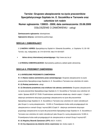 Tarnów: Grupowe ubezpieczenie na życie pracowników Specjalistycznego Szpitala im. E. Szczeklika w Tarnowie oraz członków ich rodzin Numer ogłoszenia: 139933 - 2009; data zamieszczenia: 25.08.2009 OGŁOSZENIE O ZAMÓWIENIU - usługi Zamieszczanie ogłoszenia: obowiązkowe. Ogłoszenie dotyczy: zamówienia publicznego. SEKCJA I: ZAMAWIAJĄCY I. 1) NAZWA I ADRES: Specjalistyczny Szpital im. Edwarda Szczeklika , ul. Szpitalna 13, 33-100 Tarnów, woj. małopolskie, tel. 014 6310100, faks 014 6310337. • Adres strony internetowej zamawiającego: http://www.ssz.tar.pl I. 2) RODZAJ ZAMAWIAJĄCEGO: Samodzielny publiczny zakład opieki zdrowotnej. SEKCJA II: PRZEDMIOT ZAMÓWIENIA II.1) OKREŚLENIE PRZEDMIOTU ZAMÓWIENIA II.1.1) Nazwa nadana zamówieniu przez zamawiającego: Grupowe ubezpieczenie na życie pracowników Specjalistycznego Szpitala im. E. Szczeklika w Tarnowie oraz członków ich rodzin. II.1.2) Rodzaj zamówienia: usługi. II.1.3) Określenie przedmiotu oraz wielkości lub zakresu zamówienia: Grupowe ubezpieczenie na życie pracowników Specjalistycznego Szpitala im. E. Szczeklika w Tarnowie oraz członków ich rodzin. Sprawa AE/ZP-27-75/09. Przedmiotowe zamówienie składa się z dwóch części: 1.Część I obejmuje zamówienie dotyczące grupowego ubezpieczenia na życie dla pracowników Specjalistycznego Szpitala im. E. Szczeklika w Tarnowie oraz członków ich rodzin (określonych jako Grupa I) z sumą ubezpieczenia - 10.000 zł, Przewidywana liczba osób przystępujących do ubezpieczenia w ramach Grupy I wynosi:280 2.Część II - obejmuje zamówienie dotyczące grupowego ubezpieczenia na życie dla pracowników Specjalistycznego Szpitala im. E. Szczeklika w Tarnowie oraz członków ich rodzin (określonych jako Grupa II) z sumą ubezpieczenia 12.000 zł . Przewidywana liczba osób przystępujących do ubezpieczenia w ramach Grupy II wynosi:427. II.1.4) Wspólny Słownik Zamówień (CPV): 66.51.10.00-5. II.1.5) Czy dopuszcza się złożenie oferty częściowej: tak, liczba części: 2. II.1.6) Czy dopuszcza się złożenie oferty wariantowej: nie. II.1.7) Czy przewiduje się udzielenie zamówień uzupełniających: nie. II.2) CZAS TRWANIA ZAMÓWIENIA LUB TERMIN WYKONANIA: Okres w miesiącach: 12. SEKCJA III: INFORMACJE O CHARAKTERZE PRAWNYM, EKONOMICZNYM, FINANSOWYM I TECHNICZNYM III.1) WARUNKI DOTYCZĄCE ZAMÓWIENIA Informacja na temat wadium: Oferta musi być zabezpieczona wadium na: - całe zamówienie (Część I i Część II łącznie) w wysokości: 8. 323,00 zł słownie: osiem tysięcy trzysta dwadzieści trzy złote, poszczególne części (wadium częściowe) w wysokości: Część I - 3.045,00 zł słownie trzy tysiące czterdzieści pięć złotych Część II - 5.278,00 zł słownie: pięć tysięcy dwieście siedemdziesiąt osiem złotych III.2) WARUNKI UDZIAŁU • Opis warunków udziału w postępowaniu oraz opis sposobu dokonywania oceny spełniania tych warunków: O udzielenie zamówienia ubiegać sie mogą Wykonawcy którzy: 1. Nie podlegają wykluczeniu na pdstawie art.24 ust.1 i 2 ustawy Prawo zamówień publicznych 2.Spełniają warunki określone w art.22 ust. 1 ustawy Prawo zamówień publicznych 3. Spełniają warunki określone w ogłoszeniu i SIWZ. Ocena spełniana warunków udziału w postępowaniu na podstawie wymaganych oświadczeń i dokumentów wg zasady spełnia nie spełnia.. • Informacja o oświadczeniach i dokumentach, jakie mają dostarczyć wykonawcy w celu potwierdzenia spełniania warunków udziału w postępowaniu: Na potwierdzenie spełniania warunków udziału w postępowaniu Wykonawca zobowiązany jest do złożenia następujących oświadczeń i dokumentów: 1.Oświadczenie, że jest uprawniony do występowania w obrocie prawnym zgodnie z wymaganiami ustawowymi i posiada uprawnienia niezbędne do wykonywania określonych w dokumentacji przetargowej prac lub czynności (wzór oświadczenia zał. nr 4 do siwz); 2.Oświadczenie, że posiada niezbędną wiedzę i doświadczenie oraz dysponuje potencjałem technicznym i osobami zdolnymi do wykonania zamówienia (wzór oświadczenia zał. nr 4 do siwz) lub przedstawi pisemne zobowiązanie innych podmiotów do udostępnienia potencjału technicznego i osób zdolnych do wykonania zamówienia; 3.Oświadczenie o posiadaniu na terytorium RP placówki lub placówek zdolnych do obsługi w języku polskim umowy ubezpieczenia zawartej na rzecz Zamawiającego, w tym do przeprowadzenia procedur związanych z likwidacją szkód,a w przypadku ich braku oświadczenie o korzystaniu w tym zakresie z usług profesjonalnych firm, które posiadają na terytorium RP placówkę lub placówki łącznie zdolne do obsługi w języku polskim umowy ubezpieczenia zawartej na rzecz Zamawiającego, w tym do przeprowadzenia procedur związanych z likwidacją szkód; w zakresie realizacji i wypłaty świadczeń ubezpieczeniowych (wzór oświadczenia zał. nr 4 do siwz); 4.Oświadczenie o zapewnieniu pełnej obsługi likwidacji szkód, wynikających z realizacji umowy grupowego ubezpieczenia na życie, na terenie miasta Tarnowa (wzór oświadczenia zał. nr 4 do siwz); 5.Oświadczenie potwierdzające, że znajduje się w sytuacji ekonomicznej i finansowej zapewniającej wykonanie zamówienia tj.: - wskaźnik pokrycia marginesu wypłacalności środkami własnymi na dzień 31.03.2009r. - tj. na koniec I (pierwszego) kwartału 2009 r. nie był niższy niż 110% (wzór oświadczenia zał. Nr 4 do siwz) ; - wskaźnik pokrycia rezerw techniczno-ubezpieczeniowych aktywami na dzień 31.03.2009r. - tj. na koniec I (pierwszego) kwartału 2009 r. nie był niższy niż 110% (wzór oświadczenia zał. nr 4 do siwz). 6.Oświadczenie w zakresie nie podlegania wykluczeniu z postępowania na podstawie art.24 ust. 1 i 2 ustawy P.z.p. (wzór oświadczenia zał. nr 4 do siwz) 7.Aktualny odpis z właściwego rejestru albo aktualne zaświadczenie o wpisie do ewidencji działalności gospodarczej, jeżeli odrębne przepisy wymagaj