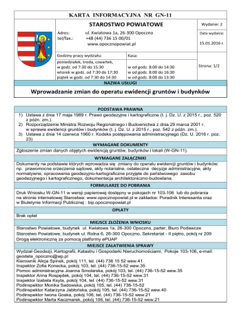 KARTA INFORMACYJNA NR GN-11 STAROSTWO POWIATOWE Adres: tel/fax.: ul. Kwiatowa 1a, 26-300 Opoczno +48 (44) 736 15 00/01 www.opocznopowiat.pl Godziny pracy wydziału: Kasa: poniedziałek, środa, czwartek, w godz. od 7:30 do 15:30 wtorek w godz. od 7:30 do 17:30 piątek w godz. od 7:30 do 14:30 w od godz. 8:00 do 14:30 w od godz. 8:00 do 16:30 w od godz. 8:00 do 13:30 Wydanie: 2 Data wydania: 15.01.2016 r. Strona: 1/2 NAZWA USŁUGI Wprowadzanie zmian do operatu ewidencji gruntów i budynków PODSTAWA PRAWNA 1) Ustawa z dnia 17 maja 1989 r. Prawo geodezyjne i kartograficzne (t. j. Dz. U. z 2015 r., poz. 520 z późn. zm.). 2) Rozporządzenie Ministra Rozwoju Regionalnego i Budownictwa z dnia 29 marca 2001 r. w sprawie ewidencji gruntów i budynków (t. j. Dz. U. z 2015 r., poz. 542 z późn. zm.). 3) Ustawa z dnia 14 czerwca 1960 r. Kodeks postępowania administracyjnego (Dz. U. 2016 r. poz. 23) WYMAGANE DOKUMENTY Zgłoszenie zmian danych objętych ewidencją gruntów, budynków i lokali (W-GN-11). WYMAGANE ZAŁĄCZNIKI Dokumenty na podstawie których wprowadza się zmiany do operatu ewidencji gruntów i budynków: np. prawomocne orzeczenia sądowe, akty notarialne, ostateczne decyzje administracyjne, akty normatywne, opracowania geodezyjno-kartograficzne przyjęte do państwowego zasobu geodezyjnego i kartograficznego, dokumentacja architektoniczno-budowlana. FORMULARZE DO POBRANIA Druk Wniosku W-GN-11 w wersji papierowej dostępny w pokojach nr 103-106 lub do pobrania na stronie internetowej Starostwa: www.opocznopowiat.pl w zakładce: Poradnik Interesanta oraz w Biuletynie Informacji Publicznej : bip.opocznopowiat.pl OPŁATY Brak opłat MIEJSCE ZŁOŻENIA WNIOSKU Starostwo Powiatowe, budynek ul. Kwiatowa 1a, 26-300 Opoczno, parter, Biuro Podawcze Starostwo Powiatowe, budynek ul. Rolna 6, 26-300 Opoczno, Sekretariat - II piętro, pokój nr 209 Drogą elektroniczną za pomocą platformy ePUAP MIEJSCE ZAŁATWIENIA SPRAWY Wydział Geodezji, Kartografii, Katastru i Gospodarki Nieruchomościami, Pokoje 103-106, e-mail: [email protected] Kierownik Alicja Spinek, pokój 111, tel. (44) 736 15 52 wew.41 Inspektor Zofia Konecka, pokój 103, tel. (44) 736-15-52 wew.35 Pomoc administracyjna Joanna Smolarska, pokój 103, tel. (44) 736-15-52 wew.35 Inspektor Anna Rospędek, pokój 104, tel. (44) 736-15-52 wew.31 Inspektor Izabela Ksyta, pokój 104, tel. (44) 736-15-52 wew.31 Podinspektor Monika Sadowska, pokój 105, tel. (44) 736-15-52 Podinspektor Katarzyna Jabłońska, pokój 105, tel. (44) 736-15-52 wew.40 Podinspektor Iwona Goska, pokój 106, tel. (44) 736-15-52 wew.21 Podinspektor Marta Kaczmarek, pokój 106, tel. (44) 736-15-52 wew.21 TERMIN ZAŁATWIENIA SPRAWY Do 30 dni od dnia złożenia kompletnego Wniosku. SPOSÓB ZAŁATWIENIA SPRAWY Wprowadzenie zmiany operatu ewidencji gruntów i budynków TRYB ODWOŁAWCZY/SKARGOWY Nie występuje UWAGI Właściciele i inne osoby fizyczne lub prawne, w których władaniu znajduje się grunt, budynek lub lokal obowiązane są zgłaszać wszelkie zmiany danych objętych ewidencją gruntów i budynków , w terminie 30 dni od powstania tych zmian. Obowiązek ten nie dotyczy zmian wynikających z aktów normatywnych, prawomocnych orzeczeń sądowych, decyzji administracyjnych, aktów notarialnych, materiałów zasobu, wypisów w innych rejestrach publicznych oraz dokumentacji architektoniczno – budowlanej przechowywanej przez organ administracji architektoniczno – budowlanej. Starosta może w drodze decyzji administracyjnej nałożyć na podmiot obowiązek opracowania dokumentacji geodezyjnej niezbędnej do aktualizacji EGiB, udostępnienia dokumentacji budowy lub dokumentacji powykonawczej lub udzielenie informacji o sposobie użytkowania budynków i lokali. Aktualizacją informacji zawartych w ewidencji gruntów i budynków następuje na podstawie dokumentacji przekazanej przez sądy, kancelarie notarialne oraz inne organy i instytucje, a także na wniosek strony, która winna załączyć dokumentację uzasadniającą zmianę. Data utworzenia: 12.01.2016 r. Data ostatniej aktualizacji: 13.01.2016 r. Data zatwierdzenia: 14.01.2016 r. Opracował: Podinspektor Marta Kaczmarek Sprawdził: Dyrektor Wydziału Agnieszka Karlińska Zatwierdził Starosta Józef Róg