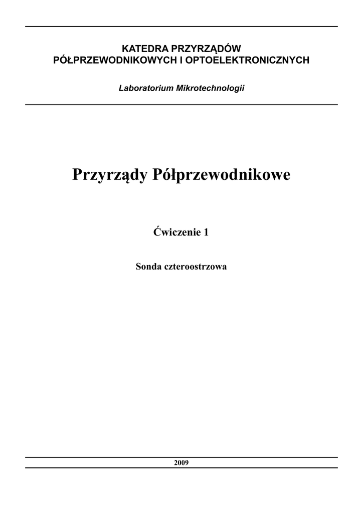 KATEDRA PRZYRZĄDÓW PÓŁPRZEWODNIKOWYCH I OPTOELEKTRONICZNYCH Laboratorium Mikrotechnologii Przyrządy Półprzewodnikowe Ćwiczenie 1 Sonda czteroostrzowa 2009 Ćwiczenie 1 – Sonda czteroostrzowa 1. Podstawy teoretyczne 1.1. Podłoża półprzewodnikowe Do produkcji diod, tranzystorów i układów scalonych stosuje się materiały półprzewodnikowe z IV grupy układu okresowego pierwiastków: przede wszystkim krzem (Si) i w bardzo ograniczonym stopniu german (Ge), węglik krzemu (SiC) oraz związki grupy III-V takie jak arsenek galu (GaAs), fosforek galu (GaP), fosforek indu (InP), fosforek galu (GaN) – głównie na elementy optoelektroniki. Krzem jest jasno błyszczącym, metalicznym, twardym materiałem. Krystalizuje w sieci kubicznej, tworząc regularne, ściennie centrowane kryształy. Oznaczenia orientacji płaszczyzn w krysztale dokonuje się za pomocą wskaźników Millera. Ułożenie trzech podstawowych płaszczyzn krystalograficznych (100), (111), (110) przedstawiono na rysunku 1. z z z y y (100) y (110) x x (111) x Rys.1. Podstawowe płaszczyzny krystalograficzne krzemu. W planarnej technologii mikroelektroniki krzem monokrystaliczny stosuje się w postaci podłoży krzemowych, czyli płaskich, jedno- lub dwustronnie wypolerowanych płytek o średnicy od 1” do 12” i grubości kilkuset mikrometrów. Do wytworzenia podłoża stosuje się najczęściej metodę Czochralskiego wyciągania monokryształu (rys.2). W metodzie tej do powierzchni czołowej wolno obracanego trzpienia przytwierdza się mały monokryształ krzemu nazywany zarodkiem krystalizacji. Orientacja płaskiej powierzchni czołowej tego kryształu najczęściej jest zgodna z płaszczyzną (100), (111), (110). Zarodek opuszcza się na trzpieniu do wnętrza tygla, w którym znajduje się czysty krzem w postaci płynnej (temperatura powyżej 1410oC). Po delikatnym zetknięciu czoła zarodka z powierzchnią cieczy, bardzo powoli podnosi się trzpień, stale go obracając. narastający monokryształ zarodek walec krzemowy stopiony krzem Rys.2. Wyciąganie monokryształu metodą Czochralskiego. 2 Ćwiczenie 1 – Sonda czteroostrzowa Podnoszenie następuje w tempie krystalizowania się materiału. Monokryształ rozrasta się i zwiększa swą średnicę. Proces jest powolny (1 – 40 mm/h), a w jego wyniku powstaje w miarę regularny walec o długości do kilkuset centymetrów i ciężarze przekraczającym kilkadziesiąt kilogramów. Do płynnego krzemu często dodaje się pierwiastek domieszkujący (III lub V grupy układu okresowego), którego atomy wbudowując się w powstająca strukturę kryształu definiują typ przewodnictwa danego półprzewodnika. Pierwiastki te to bor, aluminium, gal, ind (domieszki akceptorowe - powstaje półprzewodnik typu p) oraz fosfor, arsen, antymon (domieszki donorowe - powstaje półprzewodnik typu n). Po ostudzeniu blok materiału poddaje się skomplikowanej obróbce mechanicznej i chemicznej, aby podzielić go na cienkie płytki o polerowanej powierzchni. W celu jednoznacznego określenia typu przewodnictwa i orientacji krystalograficznej powierzchni roboczej podłoża wykonuje się tzw. ścięcie główne (bazowe) i ścięcie pomocnicze poprzez zeszlifowanie krawędzi płytek. Ścięcie główne jest zawsze dłuższe i wykonywane wzdłuż wybranej krawędzi krystalograficznej, natomiast ścięcie pomocnicze jest krótsze i umownie oznacza typ przewodnictwa podłoża (rys.3.). Na przykład dla podłoży (100) typu p dłuższe ścięcie jest wykonane zgodnie z kierunkiem krystalograficznych <110>, zaś pomocnicze jest krótsze i prostopadłe do głównego. Rys. 3. Ścięcia główne i pomocnicze na podłożach krzemowych. 1.2. Zmiana typu przewodnictwa i rozkładu domieszek Typ przewodnictwa i koncentracja domieszek dla każdego podłoża krzemowego jest ustalany już w trakcie jego powstawania, czyli w procesie wyciągania monokryształu. Zmianę typu domieszkowania, warunkującą wykonanie nawet najprostszego przyrządu półprzewodnikowego, można uzyskać poprzez wprowadzenie do sieci krystalograficznej domieszki przeciwnego typu niż ta, która się w nim już znajduje. Aby jednak doszło do zmiany typu przewodnictwa koncentracja nowo wprowadzanej domieszki musie być większa od tej, jaka była oryginalnie w podłożu, przy czym po wykonaniu takiego zadania efektywnie działa elektrycznie w podłożu jedynie różnica koncentracji obu typów domieszek. Oznacza to w praktyce, że niezależnie od sposobu praktycznej realizacji zmiana typu przewodnictwa w podłożu krzemowym jest związana ze wzrostem koncentracji domieszek w podłożu. Z tego powodu koncentracja domieszek w produkowanych podłożach jest niska i zawiera się najczęściej w granicach 1014 – 1016 1/cm3. Można wyróżnić dwa sposoby wprowadzania domieszek: poprzez dyfuzję termiczną, w której atomy domieszek przesuwają się w półprzewodniku wskutek chaotycznych ruchów cieplnych, oraz przez implantację jonów, w której jony domieszek rozpędzane są w silnym polu elektrycznym i „wbijane” do wnętrza sieci krystalograficznej podłoża. Obie te metody wzajemnie się uzupełniają i są stosowane w zależności od potrzeb konstrukcyjnych. Metodą dyfuzji można wykonywać warstwy domieszkowane o szerokim zakresie grubości i koncentracji powierzchniowych domieszek oraz różnym rozkładzie koncentracji domieszek (ale w ograniczonym zakresie). Wykorzystując zjawisko maskowania dyfuzji domieszek przez warstwę dielektryczną można wykonywać obszary dyfuzyjne o wymaganym rozkładzie przestrzennym. Dyfuzja, 3 Ćwiczenie 1 – Sonda czteroostrzowa podobnie jak utlenianie termiczne podłoży krzemowych, jest procesem wysokotemperaturowym prowadzonym w piecu dyfuzyjnym. Metodą implantacji jonów można wykonywać stosunkowo płytko położone warstwy domieszkowane o szerokim zakresie koncentracji powierzchniowych domieszki i praktycznie dowolnym rozkładzie koncentracji domieszki. Implantacja jest 