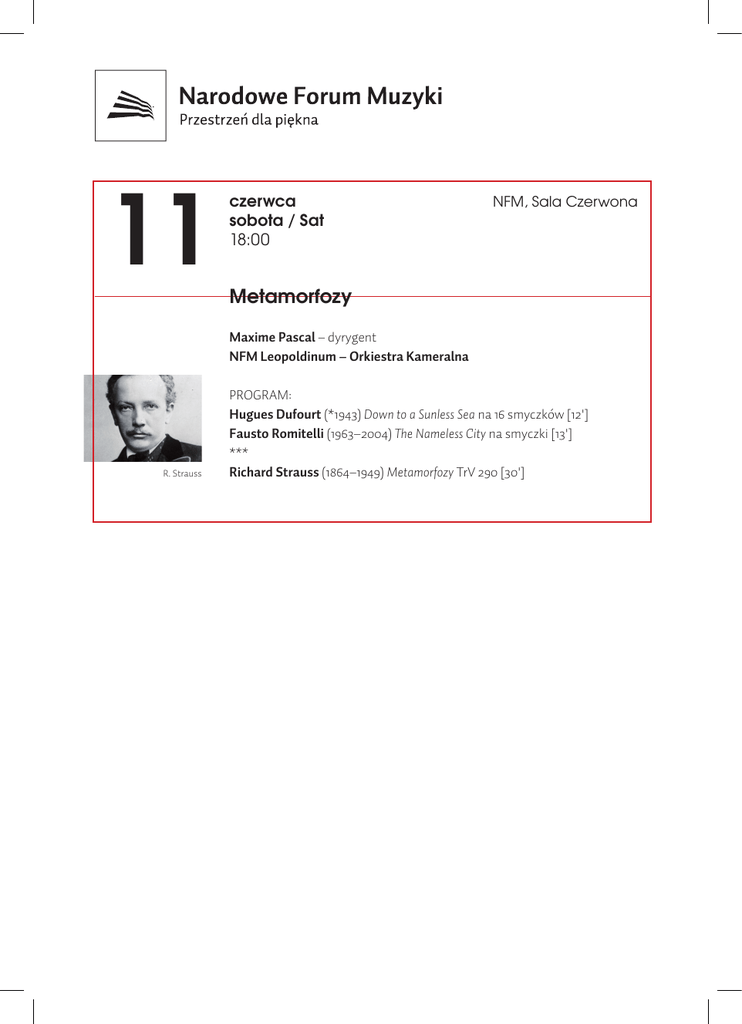 11 czerwca sobota / Sat 18:00 NFM, Sala Czerwona Metamorfozy Maxime Pascal – dyrygent NFM Leopoldinum – Orkiestra Kameralna R. Strauss PROGRAM: Hugues Dufourt (*1943) Down to a Sunless Sea na 16 smyczków [12'] Fausto Romitelli (1963–2004) The Nameless City na smyczki [13'] *** Richard Strauss (1864–1949) Metamorfozy TrV 290 [30'] Omówienie Agata Adamczyk Opinia Arturo Toscaniniego o Richardzie Straussie wyrażona słynnymi słowami: „Przed Straussem-kompozytorem zdejmuję kapelusz; przed Straussem-człowiekiem zakładam go z powrotem”, przez wiele lat ciążyła na reputacji niemieckiego twórcy. Kim zatem był Strauss – naiwnym artystą czy kolaborantem? Jego kontrowersyjna współpraca z nazistami do dziś prowokuje dyskusje. Gdy Adolf Hitler doszedł do władzy, Strauss skomentował ten fakt słowami: „Dzięki Bogu! Oto w końcu kanclerz Rzeszy, który interesuje się sztuką!”. Trzy lata później skomponował i poprowadził uroczyste wykonanie hymnu olimpijskiego podczas otwarcia letniej olimpiady w Berlinie. Został też pierwszym przewodniczącym Reichsmusikkamer (RMK) – Izby Muzyki Rzeszy. Funkcja ta oznaczała, że odpowiadał bezpośrednio przed Josephem Goebbelsem. Ten zaś ubolewał: „Nieszczęśliwie wciąż go potrzebujemy, ale pewnego dnia będziemy mieli swoją własną muzykę i wtedy zrezygnujemy z dekadenckiego neurotyka”. Tak naprawdę Strauss naiwnie wierzył, że pomoże muzyce niemieckiej i liczył na to, że bez przeszkód będzie mógł funkcjonować w muzycznym świecie. Pragnął też uchronić swoją rodzinę. Ufał, że ktoś tak znany jak on jest nietykalny. Dlatego kilkakrotnie interweniował w sprawie swojej żydowskiej synowej i jej matki. W prywatnym dzienniku wpisał: „Uważam, że pastwienie się nad Żydami przez Streichera i Goebbelsa plami niemiecki honor, jest całkowicie niewłaściwe – bazuje na sile, beztalenciu, mierności przeciwko inteligencji i talentowi”. Gdy uparł się, aby na plakacie zapowiadającym wystawienie jednej z oper umieścić nazwisko autora libretta, pisarza żydowskiego pochodzenia, Stefana Zweiga, Hitler odwołał swój przyjazd na premierę. Straussa zmuszono wówczas do ustąpienia z funkcji przewodniczącego RMK, choć w oficjalnej wersji odszedł on na emeryturę. Kilka lat później, już po rozpoczęciu wojny kompozytor odmówił przenocowania w swoim domu w Garmisch-Partenkirchen rannych niemieckich żołnierzy. Szef propagandy Rzeszy nie krył wściekłości – wykrzyczał, że Strauss jest już człowiekiem dnia wczorajszego. W ten sposób skończyła się przydatność kompozytora dla nazistowskiego reżimu. W 1944 roku wszystkim urzędnikom partyjnym zakazano kontaktów z nim. Metamorfozy, czyli Studium na 23 solowe smyczki Straussa to w pewnym sensie pożegnanie – jedna z jego ostatnich kompozycji, ukończona w ostatnich tygodniach II wojny światowej. Twórca miał wtedy 81 lat i boleśnie przeżył zbombardowanie kilku ważnych gmachów operowych: w Dreźnie, w Wiedniu oraz w rodzinnym Monachium. Napisał więc dzieło, które jest wyrazem wielkiej tęsknoty, nostalgii za czasem minionym. Kompozytor umieścił w nim temat Marsza żałobnego z „Eroiki” Ludwiga van Beethovena. Dorota Szwarcman na swoim muzycznym blogu gest ten odczytuje w taki sposób: „tak, wiem, już nigdy nie będzie tak, jak było. Ale ja należę do tego świata »jak było«, do tej kultury, i już inaczej być nie może. Ten świat musi odejść, i ja też odchodzę. Ale go kocham i tej miłości wyrzec się nie mogę. Ta miłość zostanie. Ale to przeszłość. Jestem przeszłością. I godzę się z tym, ale proszę was, pamiętajcie, że były w tej przeszłości rzeczy piękne i cenne”. Pozostałe dwa utwory, które usłyszymy podczas dzisiejszego koncertu, mają zupełnie inne podłoże ideologiczne oraz inną stylistykę. Spektralizm – kierunek, który pojawił się w drugiej połowie XX wieku – odkrył czwarty wymiar dźwięku: już nie tylko wysokość, głośność i czas trwania, ale też jego głębię. Ta specyficzna postawa wobec brzmienia po raz pierwszy została zamanifestowana przez członków L’Iteneraire – Gérarda Griseya, Michela Levinasa, Tristana Muraila oraz Hugues’a Dufourta (gdy powstawały Metamorfozy Straussa, Dufourt miał dwa lata). Artyści skupiali się wokół IRCAM-u. Jest to paryski Instytut Koordynacji Badań Akustyczno-Muzycznych, założony i w tamtych czasach kierowany przez Pierre’a Bouleza. Pracowali w nim razem akustycy, informatycy, kompozytorzy, wykonawcy, psychologowie i muzykolodzy. Podług definicji funkcjonującej w fizyce dźwięk to fala rozchodząca się m.in. w powietrzu, mająca określoną częstotliwość i amplitudę. Rzadko jest to fala prosta (sinusoida) – najczęściej to złożenie wielu fal tworzących widmo. Zatem każdy dźwięk możemy na takie fale rozłożyć. W spektralizmie melodia i harmonia są budowane w oparciu o spektrum/widmo dźwięku (inaczej zbiór alikwotów, czyli tonów składowych wybranego tonu podstawowego – fali harmonicznej o najmniejszej częstotliwości). Podobnie zbudowane są wszystkie inne fale, np. światło – rozbijane na spektrum przez pryzmat lub w zjawisku tęczy. Odbierana przez nas wysokość dźwięku zależy od pierwszego tonu podstawowego. Rozkład pozostałych tonów składowych i ich amplituda decydują o barwie dźwięku. Na podstawie analiz widma spektraliści wprowadzają nas w zupełnie nowy świat dźwiękowy. Budują melodię z alikwotów, rozpisują je na szereg instrumentów, płynnie przechodzą z jednego spektrum do innego, ścieśniają lub rozrzedzają widmo, stwarzają sztuczne widma harmoniczne, statyczne, dynamiczne… Nigdy wcześniej sztuka nie była tak ściśle związana z doświadczeniami akustyczno-fizycznymi, choć matematyczną stronę muzyki znali już starożytni. Fausto Romitelli studiował informatykę muzyczną w IRCAM-ie, a później współpracował
