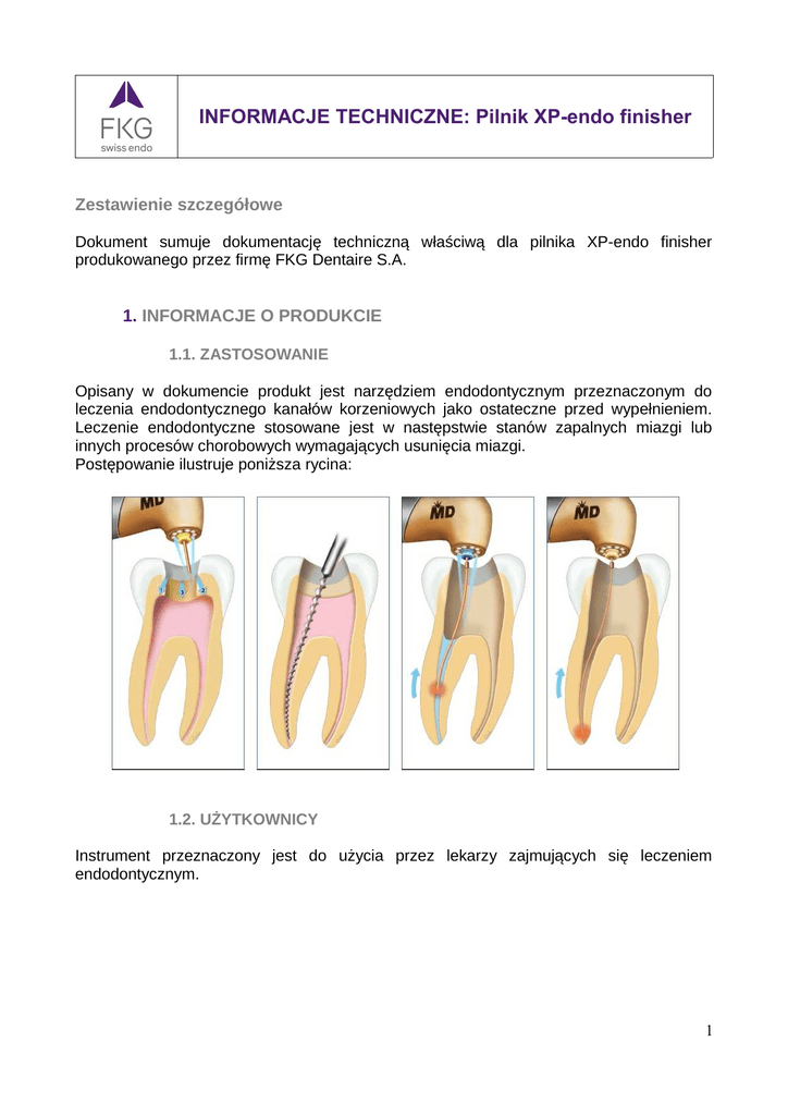 INFORMACJE TECHNICZNE: Pilnik XP-endo finisher Zestawienie szczegółowe Dokument sumuje dokumentację techniczną właściwą dla pilnika XP-endo finisher produkowanego przez firmę FKG Dentaire S.A. 1. INFORMACJE O PRODUKCIE 1.1. ZASTOSOWANIE Opisany w dokumencie produkt jest narzędziem endodontycznym przeznaczonym do leczenia endodontycznego kanałów korzeniowych jako ostateczne przed wypełnieniem. Leczenie endodontyczne stosowane jest w następstwie stanów zapalnych miazgi lub innych procesów chorobowych wymagających usunięcia miazgi. Postępowanie ilustruje poniższa rycina: 1.2. UŻYTKOWNICY Instrument przeznaczony jest do użycia przez lekarzy zajmujących się leczeniem endodontycznym. 1 INFORMACJE TECHNICZNE: Pilnik XP-endo finisher 2. OPIS PRODUKTU Instrumentem można opracować kanały korzeniowe o bardzo zróżnicowanej budowie od bardzo wąskich do najszerszych oraz od prostych do tych z wieloma zagięciami. Ze względu na niewielką grubość (rozmiar ISO 25) bez rozszerzalności narzędzie jest niewiarygodnie sprężyste oraz wykazuje nieporównywalną odporność na cykliczne obciążenia. Dodatkowo pilnik mimo, iż pracuje w kontakcie ze ścianami kanału nie zmienia oryginalnego kształtu kanału. Pilnik XP-endo finisher produkowany jest ze specjalnie wytwarzanego dla firmy FKG stopu - drut NiTi Max Wire (Martensite-Autstenite ElectropolishFleX). Materiał wykazuje zmienną reakcję w zależności od temperatury, a FKG opatentowała tę procedurę. Stworzenie i produkcja pilnika XP-endo finisher bazuje na podstawowej właściwości stopu NiTi tzw. pamięci kształtu. Pilnik jest prosty w fazie M - gdy jest zimny, gdy temperatura otoczenia podwyższa się do temperatury ciała (w kanale korzeniowym) zmienia swój kształt, dzięki pamięci molekularnej i przechodzi do fazy A. W fazie A pilnik przybiera kształt pozwalający w trakcie obrotów na osiągnięcie bocznych ścian kanału i ich oczyszczanie co jest nieosiągalne standardowymi narzędziami. Powrót do fazy M (pilnik prosty) jest ponownie możliwy po jego schłodzeniu. 2 INFORMACJE TECHNICZNE: Pilnik XP-endo finisher OPAKOWANIE I OZNACZENIE: Produkt pakowany jest w blistry co zapewnia jego sterylność w okresie 5 lat od daty produkcji zaznaczonej na opakowaniu. W opakowaniu znajdują się 3 sterylne narzędzia o długości 25 mm. 3 INFORMACJE TECHNICZNE: Pilnik XP-endo finisher 1. XP-endo finisher Wskazówki dla użytkownika ZŁOTE REGUŁY: Zalecane obroty Moment skręcający (torque) - 800 obr./min - 1 Ncm > XP-endo finisher może zostać użyty dopiero po poszerzeniu kanału do rozmiaru minimum ISO 25. > w zębach wielokorzeniowych zaleca się by zaczynać od kanału najszerszego. > pracować ruchami wzdłuż długości kanału (góra/dół) przez około 1 min. > płyn należy deponować do komory już po umieszczeniu pilnika w kanale. Prędkość: 800 obr./min. (800 – 1000 obr./min.) Moment obrotowy: 1 Ncm 1. Użyj XP-endo finisher dopiero po osiągnięciu rozmiaru ISO 25. 2. W zębach wielokorzeniowych zaczynaj zawsze od kanału najszerszego. W kanale zawsze powinien znajdować się płyn, jednak należy unikać deponowania go przed włożeniem pilnika do kanału. 3. Rękoma zabezpieczonymi rękawicami wyciągnąć pilnik ze sterylnego opakowania (blister) i osadzić w kątnicy. 4. Z pomocą plastikowej tuby (a) na pilniku oznaczyć długość roboczą (WL) używając gumowego krążka (b) (Rysunek 1). 5. Schłodzić XP-endo finisher polewając tubę, w której umieszczone jest narzędzie używając spray chłodzący. 6. Umieścić schłodzone narzędzie w kątnicy następnie zdjąć tubę osłonową i upewnić się, że pilnik jest prosty (Rysunek 2.). (Wyjmując narzędzie należy palcami złapać tubę przy jej końcu, tam gdzie jest napis z logo FKG aby nie ocieplać narzędzia. Jeżeli pilnik pozostaje na zewnątrz można użyć gazika nasączonego np. alkoholem w celu jego oczyszczenia i schłodzenia). 7. Gdy pilnik jest jeszcze prosty wsunąć go do pierwszego opracowywanego kanału (Rysunek 3). Kiedy umieścimy czubek w kanale uruchamiamy rotację wsuwając pilnik głębiej. Deponujemy płyn do komory. (Jeżeli pojawią się problemy w umieszczeniu pilnika w kanale,w zębach wielokorzeniowych należy stosować zasadę by czubek pilnika skierowany był w stronę ścianki mezjalnej dla kanałów MB, ML i DB lub policzkowej / językowej dla kanałów D). 4 INFORMACJE TECHNICZNE: Pilnik XP-endo finisher 8. Pracować XP-endo finisher w kanale przez około 1 min wykonując delikatne ruchy posuwisto-zwrotne o amplitudzie około 7-8 mm by objąć pracą całą długość kanału (Rysunek 5). Używaj ruchów bocznych w czasie pracy. Należy uważać by pilnik cały czas znajdował się w kanale. 9. Po ok. 1min należy wyjąć pilnik z kanału nie wyłączając obrotów. 10. Przepłukać kanał by usunąć resztki. Kontynuacja leczenia w wąskich kanałach tego samego zęba: 11. Oczyścić XP-endo finisher z zanieczyszczeń i umieścić w tubce. 12. Postępuj zgodnie z procedurą od pkt. 4. Po zakończeniu leczenia: 13. Wyrzucić pilnik zgodnie z procedurą utylizacji. 14. Oczyścić kanał i wypełnić używając uszczelniacza (sealer) np. TotalFill i gutaperki. …............................................................................................................................................ Informacje Ogólne …............................................................................................................................................ Używanie produktu sterylnego 1. Rozpakuj instrument. 2. Wyjąć instrument mając założone rękawice ochronne i założyć go na kątnicę. 3. Pracować zgodnie z powyższą instrukcją. …............................................................................................................................................ XP-endo finisher jest przeznaczony do jednorazowego użytku. Powtórne użycie instrumentu może prowadzić do
