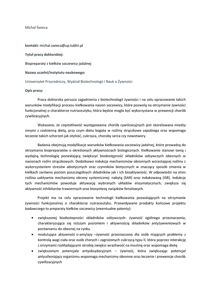 Michał Świeca kontakt: [email protected] Tytuł pracy doktorskiej: Biopreparaty z kiełków soczewicy jadalnej Nazwa uczelni/instytutu naukowego: Uniwersytet Przyrodniczy, Wydział Biotechnologii i Nauk o Żywności Opis pracy: Praca doktorska porusza zagadnienia z biotechnologii żywności i na celu opracowanie takich warunków modyfikacji procesu kiełkowania nasion soczewicy, które pozwolą na otrzymanie żywności funkcjonalnej o charakterze nutraceutyku, która będzie mogła byd wykorzystana w prewencji chorób cywilizacyjnych. Wykazano, że częstotliwośd występowania chorób cywilizacyjnych jest skorelowana miedzy innymi z codzienną dietą, przy czym dieta bogata w rośliny strączkowe zapobiega oraz wspomaga leczenie takich schorzeo jak otyłośd, cukrzyca, choroby serca czy nowotwory. Badania obejmują modyfikacje warunków kiełkowania soczewicy jadalnej, które prowadzą do otrzymania biopreparatów o określonych aktywnościach biologicznych. Kiełkowanie stanowi tanią i wydajną technologię pozwalającą zwiększyd biodostępnośd składników odżywczych obecnych w nasionach roślin strączkowych. Dodatkowo indukcja mechanizmów obronnych wzrastającej rośliny z wykorzystaniem stresów abiotycznych oraz czynników biotycznych w znaczący sposób zmienia w kiełkach zarówno poziom poszczególnych składników jak i ich bioaktywnośd. W odpowiedzi na stres roślina uaktywnia mechanizmy obrony systemicznej: nabytą (SAR) oraz indukowaną (ISR). Indukcja tych mechanizmów powoduje aktywację wybranych układów enzymatycznych, zwiększa się aktywnośd inhibitorów trawiennych oraz biosyntezę związków fenolowych. Projekt ma na celu opracowanie technologii kiełkowania pozwalających na otrzymanie żywności funkcjonalnej o charakterze nutraceutyku. Przewidywane produkty koocowe projektu badawczego to preparaty kiełków soczewicy (ewentualne patenty): zwiększonej biodostepności składników odżywczych- żywnośd ogólnego przeznaczenia, charakteryzująca się niższym poziomem i aktywnością składników antyżywieniowych w porównaniu do obecnej na rynku modulujące aktywnośd -amylazy –żywnośd przeznaczona dla osób mających problemy z kontrolą wagi ciała oraz osób chorych i zagrożonych cukrzycą typu II, która poprzez interakcję z enzymami rozkładającymi skrobię zwiększ wrażliwośd na insulinę oraz wspomaga dietę zwiększonym potencjale antyoksydacyjnym – żywnośd, która zwiększając potencjał antyutleniający organizmu wspomaga mechanizmy obronne oraz leczenie i prewencje chorób cywilizacyjnych zwiększonej aktywności inhibitorów proteaz –produkty, przeznaczone dla osób u których występuje zwiększone ryzyko wystąpienia zmian nowotworowych, a w szczególności nowotworów jamy ustnej oraz układu pokarmowego Dodatkowo badania mają na celu zaprojektowanie receptury otrzymywania nutaceutyku z wykorzystaniem organizmów probiotycznych, modelujących florę jelitową, będącego alternatywą wobec obecnych na rynku innych tego typu preparatów.