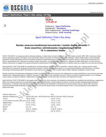 Informacje o produkcie Utworzono 02-03-2017 Sport Definition That's the whey 2270g Cena : 199,00 zł 175,00 zł Sport Definition That's the whey 2270g .p l Producent : Sport Definition Dostępność : Dostępny Stan magazynowy : poniżej średniego Średnia ocena : brak recenzji .c om Bardzo smaczna kombinacja koncentratu i izolatu białka serwatki !! Duża zawartosc aminokwasów rozgałęzionych BCAA 76 % zawartosci białka w ef ul THAT’S THE WHEY® to najwyższej jakości odżywka białkowa, w skład której wchodzi koncentrat oraz izolat białka serwatki (WPC, WPI). Zwierzęce źródła protein gwarantują idealny aminogram, który jest bardzo zbliżony do profilu aminokwasowego białka ludzkiego. Idealne źródło białka w diecie każdego sportowca! Każda osoba aktywna fizycznie posiada zwiększone zapotrzebowanie na pełnowartościowe proteiny, których często trudno jest dostarczyć z diety w odpowiedniej ilości. Stosując ten produkt możesz być pewien, że suplementujesz się jednym z najlepszych białek dostępnych na rynku! Jest ono bardzo uniwersalne ze względu na kinetykę wchłaniania zastosowanych źródeł białka – co sprawia, że idealnie nada się w ciągu dnia oraz zaraz po treningu. Sport Definition THAT’S THE WHEY® charakteryzuje się dopracowanym składem ale to nie wszystko – kwestia smaku, jak i rozpuszczalności został potraktowana na poważnie! Oryginalne kompozycje smakowe i łatwość rozpuszczania sprawi, że z przyjemnością będziesz wyczekiwał pory na kolejną porcją tego rewelacyjnego białka! Nie będziesz musiał męczyć się z grudkami, jak to miało miejsce kiedyś! Odżywka występuje w wersji instant. po Wysoka zawartość aminokwasów rozgałęzionych BCAA oraz EAA mają olbrzymie znaczenie dla zabezpieczenia przed katabolizmem oraz promocji procesów anabolicznych. Odpowiednia jakość „cegiełek” budujących Twoje mięśnie ma niezwykłe znaczenie. Postaw na produkt najwyższej jakości, by w niedługim czasie cieszyć się lepszymi efektami. Odpowiednie uzupełnienie diety ma tak samo duże znaczenie, jak odpowiedni trening. sk le p. Sport Definition THAT’S THE WHEY® jest bogate także w glutaminę, która wykazuje silne działanie antykataboliczne (podobnie jak aminokwasy rozgałęzione BCAA) oraz wpływa pozytywnie na prawidłową pracę układu pokarmowego. Często spotyka się opinie, że warto stosować odżywkę białkową podczas odchudzania – to prawda, ponieważ przyczynia się ona do podkręcenia metabolizmu! Oczywiście nie tak jak spalacz tłuszczu, jednak fakt, że proces trawienia białka wymaga większego nakładu energii niż sam proces dostarcza jest w tej kwestii bardzo istotny i może przyśpieszyć utratę zbędnych kilogramów wagi. Wartość odżywcza w 100 g Wartość energetyczna 1552 kJ (367 kcal) , 1679 kJ (397 kcal) 465 kJ (110 kcal)1 504 kJ (119 kcal) Tłuszcz 7,48 g1, 8,09 g 2,24 g1, 2,43 g w tym kwasy tłuszczowe nasycone 5,25 g , 5,68 g 1,57 g1, 1,70 g Węglowodany 4,72 g , 5,10 g 1,42 g1, 1,53 g w tym cukry 4,72 g1, 5,10 g 1,42 g1, 1,53 g Błonnik 0 g1, 0 g 0 g1, 0 g Białko 70,31 g , 76,08 g 21,09 g1, 22,82 g Sól 0,22 g , 0,24 g 0,07 g1, 0,07 g 1 Wygenerowano w programie www.oscGold.com 1 1 1 30 g 1