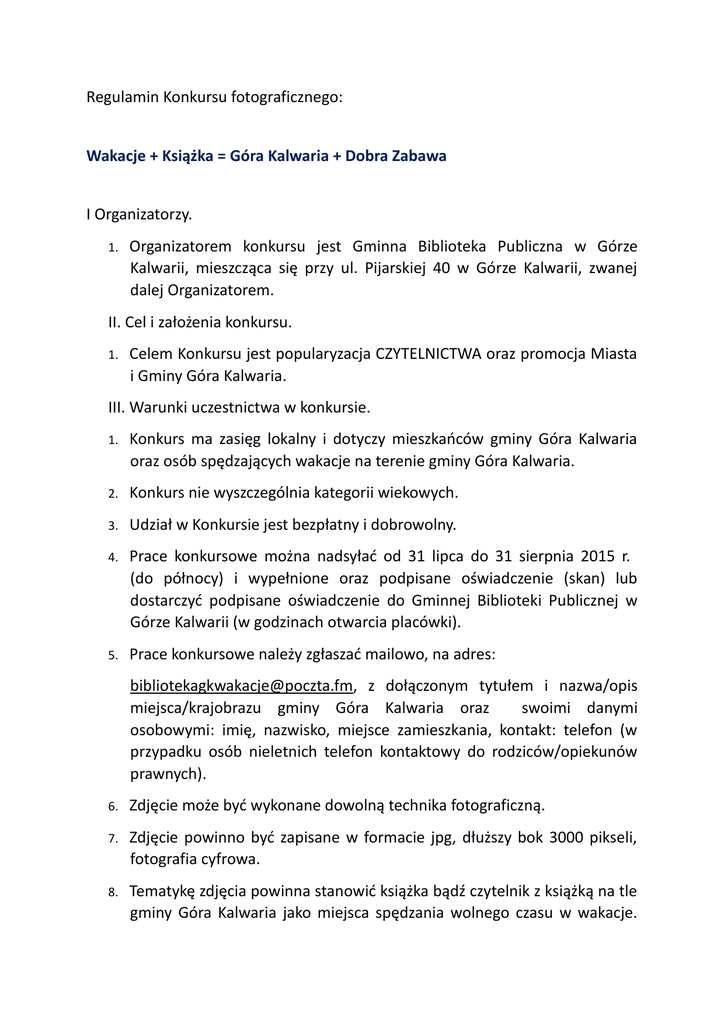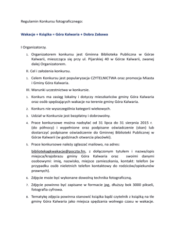 Regulamin Konkursu fotograficznego: Wakacje + Książka = Góra Kalwaria + Dobra Zabawa I Organizatorzy. 1. Organizatorem konkursu jest Gminna Biblioteka Publiczna w Górze Kalwarii, mieszcząca się przy ul. Pijarskiej 40 w Górze Kalwarii, zwanej dalej Organizatorem. II. Cel i założenia konkursu. 1. Celem Konkursu jest popularyzacja CZYTELNICTWA oraz promocja Miasta i Gminy Góra Kalwaria. III. Warunki uczestnictwa w konkursie. 1. Konkurs ma zasięg lokalny i dotyczy mieszkańców gminy Góra Kalwaria oraz osób spędzających wakacje na terenie gminy Góra Kalwaria. 2. Konkurs nie wyszczególnia kategorii wiekowych. 3. Udział w Konkursie jest bezpłatny i dobrowolny. 4. Prace konkursowe można nadsyłać od 31 lipca do 31 sierpnia 2015 r. (do północy) i wypełnione oraz podpisane oświadczenie (skan) lub dostarczyć podpisane oświadczenie do Gminnej Biblioteki Publicznej w Górze Kalwarii (w godzinach otwarcia placówki). 5. Prace konkursowe należy zgłaszać mailowo, na adres: [email protected], z dołączonym tytułem i nazwa/opis miejsca/krajobrazu gminy Góra Kalwaria oraz swoimi danymi osobowymi: imię, nazwisko, miejsce zamieszkania, kontakt: telefon (w przypadku osób nieletnich telefon kontaktowy do rodziców/opiekunów prawnych). 6. Zdjęcie może być wykonane dowolną technika fotograficzną. 7. Zdjęcie powinno być zapisane w formacie jpg, dłuższy bok 3000 pikseli, fotografia cyfrowa. 8. Tematykę zdjęcia powinna stanowić książka bądź czytelnik z książką na tle gminy Góra Kalwaria jako miejsca spędzania wolnego czasu w wakacje. Zdjęcia ukazujące niewłaściwe treści, odbierane powszechnie jako niewłaściwe (nie obyczajowe) bądź niezgodne z prawem nie będą dopuszczone do konkursu. 9. Uczestnik zobowiązany jest do wysłania na konkurs tylko jednego wykonanego przez siebie zdjęcie. Udział w konkursie jest jednoznaczny z zaświadczeniem o posiadaniu praw autorskich do zgłoszonej fotografii. 10. Zgłoszone zdjęcia, które nie będą spełniały warunków, o których mowa w niniejszym regulaminie nie będą dopuszczone do konkursu. IV Komisja konkursowa 1. Nadesłane prace oceni jury, powołane przez dyrektora Gminnej Biblioteki Publicznej w Górze Kalwarii, w skład którego wejdzie Dyrektor Renata Zagożdżon oraz Paweł Tabor – instruktor Ośrodka Kultury w Górze Kalwarii, Tadeusz Sas – instruktor muzyki Ośrodka Kultury w Górze Kalwarii. 2. Nagrody w postaci książek, ufundowane zostaną przez PPUH Księgarnia Szkolna Elżbieta Wojtas, Ogrodnik foto-studio oraz Gminną Bibliotekę Publiczną w Górze Kalwarii. Nagodzone zostaną trzy najciekawsze fotografie. 3. Organizator zastrzega sobie prawo do przyznania wyróżnień. 4. Zwycięzcy konkursu zostaną powiadomieni telefonicznie. 5. Nagrodę można będzie odebrać w siedzibie Gminnej Biblioteki Publicznej w Górze Kalwarii do końca listopada 2015 r. 6. Organizator nie ponosi odpowiedzialności za niemożność odbioru nagrody z przyczyn leżących po stronie Uczestnika Konkursu. V Postanowienia końcowe 1. Organizator Konkursu zastrzega sobie prawo zmiany niniejszego regulaminu. 2. Prace nie będą odsyłane do Uczestników. 3. Autorzy prac zachowują prawa autorskie. 4. Biorąc udział w niniejszym konkursie, Uczestnik akceptuje treść Regulaminu i zobowiązuje się stosować do jego postanowień (w przypadku osób nieletnich rodzice/opiekun prawny). 5. Udział w niniejszym Konkursie jest równoznaczne z oświadczeniem, iż: Zgłoszona do Konkursu praca fotograficzna jest autorstwa Uczestnika i przysługuje mu do niej całość praw autorskich. Uczestnik posiada zgodę osób widniejących na przesłanej fotografii na rozpowszechnianie ich wizerunku w ramach Konkursu oraz w materiałach związanych z Konkursem, także podawanych do publicznej wiadomości na portalach internetowych Organizatora zgodnie z Ustawą z dnia 4 lutego 1994 r. o prawie autorskim i prawach pokrewnych. 6. Uczestnik Konkursu poprzez udział w Konkursie jednocześnie udziela nieodpłatnej licencji niewyłącznej do swojej fotografii na rzecz Organizatora bez ograniczeń czasowych, ilościowych oraz terytorialnych na następujących polach eksploatacji: w zakresie utrwalania i zwielokrotniania utworu - wytwarzanie określoną techniką egzemplarzy utworu, w tym techniką drukarską, reprograficzną, zapisu magnetycznego oraz techniką cyfrową; w zakresie obrotu oryginałem albo egzemplarzami, na których utwór utrwalono - wprowadzanie do obrotu, użyczenie lub najem oryginału albo egzemplarzy; w zakresie rozpowszechniania utworu - publiczne wykonanie, wystawienie, wyświetlenie, odtworzenie oraz nadawanie i reemitowanie, a także publiczne udostępnianie utworu w taki sposób, aby każdy mógł mieć do niego dostęp w miejscu i w czasie przez siebie wybranym; jednocześnie wyraża zgodę na wykonanie praw autorskich zależnych, w szczególności twórcze przekształcanie, przerabianie i adaptowanie całości lub fragmentów; wielokrotne publikowanie (oraz publikowanie imienia, nazwiska i miejsca zamieszkania Uczestnika) w materiałach promocyjnych związanych z Konkursem (tegorocznej i każdej następnej edycji), w wydawnictwach Organizatora, a także na stronach internetowych oraz wykorzystywanie ich w celach promocyjnych i marketingowych Organizatora. 7. Uczestnicy Konkursu zobowiązują się do przesłania na prośbę Organizatora zdjęcia w rozdzielczości pozwalającej na wydruk dobrej jakości na potrzeby wystawy konkursowej. Uczestnik może zostać poproszony o przesłanie pliku źródłowego nie poddanego obróbce komputerowej. 8. Uczestnik Konkursu poprzez udział w Konkursie wyraża zgodę na przetwarzanie jego danych osobowych w celu związanym z realizacją Konkursu i celach marketingowych Organizatora. Administratorem danych osobowych w rozumieniu ustawy z dnia 29 sierpnia 1997 r. o ochronie danych osobowych (tekst jednolity: Dz. U. z 2002 r. Nr. 101, poz. 926 ze zm.) jest Gminna Biblioteka Pub