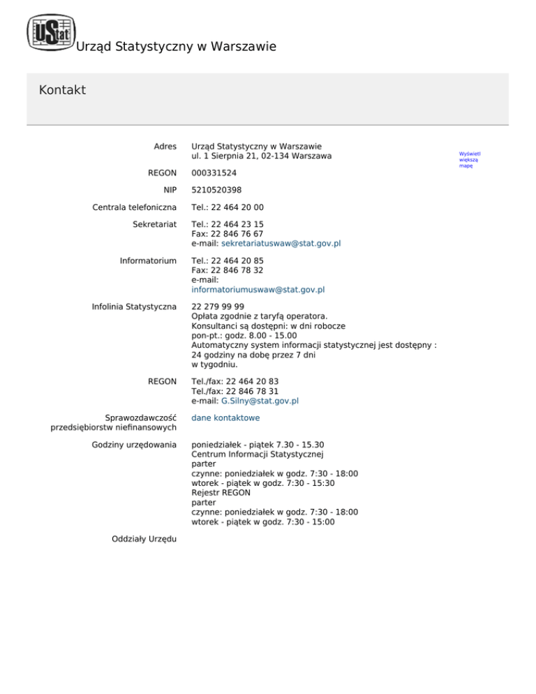 Urząd Statystyczny w Warszawie Kontakt Adres REGON NIP Centrala telefoniczna Sekretariat Informatorium Infolinia Statystyczna REGON Sprawozdawczość przedsiębiorstw niefinansowych Godziny urzędowania Oddziały Urzędu Urząd Statystyczny w Warszawie ul. 1 Sierpnia 21, 02-134 Warszawa 000331524 5210520398 Tel.: 22 464 20 00 Tel.: 22 464 23 15 Fax: 22 846 76 67 e-mail: [email protected] Tel.: 22 464 20 85 Fax: 22 846 78 32 e-mail: [email protected] 22 279 99 99 Opłata zgodnie z taryfą operatora. Konsultanci są dostępni: w dni robocze pon-pt.: godz. 8.00 - 15.00 Automatyczny system informacji statystycznej jest dostępny : 24 godziny na dobę przez 7 dni w tygodniu. Tel./fax: 22 464 20 83 Tel./fax: 22 846 78 31 e-mail: [email protected] dane kontaktowe poniedziałek - piątek 7.30 - 15.30 Centrum Informacji Statystycznej parter czynne: poniedziałek w godz. 7:30 - 18:00 wtorek - piątek w godz. 7:30 - 15:30 Rejestr REGON parter czynne: poniedziałek w godz. 7:30 - 18:00 wtorek - piątek w godz. 7:30 - 15:00 Wyświetl większą mapę w Ciechanowie ul. Nadrzeczna 1, 06-400 Ciechanów tel. bezp. 23 672 37 89 faks 23 672 50 41 e-mail: [email protected] Godziny urzędowania poniedziałek - piątek w godz. 7:30 - 15:30 Rejestr REGON pokój 105 czynne: poniedziałek w godz. 7:30 - 18:00 wtorek-piątek w godz. 7:30 - 15:00 tel. 23 672 53 12 Centrum Informacji Statystycznej pokój 105 czynne: poniedziałek w godz. 7:30 - 18:00 wtorek-piątek w godz. 7:30 - 15:30 tel. 23 672 53 12, tel. 23 672 32 00, tel. 23 672 32 08 wew. 109 w Ostrołęce ul. Insurekcyjna 3, 07-410 Ostrołęka centrala 29 760 42 52 sekretariat 29 760 42 55 faks 29 760 42 66 e-mail: [email protected] Godziny urzędowania poniedziałek - piątek w godz. 7:30 - 15:30 Rejestr REGON czynne: poniedziałek w godz. 7:30 - 18:00 wtorek-piątek w godz. 7:30 - 15:00 tel. 29 760 78 42, tel. 29 760 78 54 Centrum Informacji Statystycznej pokój 10 czynne: poniedziałek w godz. 7:30 - 18:00 wtorek-piątek w godz. 7:30 - 15:30 tel. 29 760 78 50 w Płocku ul. Otolińska 21, 09-407 Płock centrala 24 366 50 40 sekretariat 24 366 50 40 faks 24 366 50 38 e-mail: [email protected] Godziny urzędowania poniedziałek - piątek w godz. 7:00 - 15:00 Rejestr REGON czynne: poniedziałek w godz. 7:00 - 18:00 wtorek-piątek w godz. 7:00 - 14:30 tel. 24 366 50 36 Centrum Informacji Statystycznej pokój 107 czynne: poniedziałek w godz. 7:00 - 18:00 wtorek-piątek w godz. 7:00 - 15:00 tel. 24 366 50 37 faks 24 366 50 38 w Radomiu w Siedlcach ul. Planty 39/45, 26-600 Radom centrala 48 362 21 01 sekretariat 48 362 21 01 w. 206 faks 48 362 78 67 e-mail: [email protected] Godziny urzędowania poniedziałek - piątek w godz. 7:15 - 15:15 Rejestr REGON parter, pokój 46 i 47 czynne: poniedziałek w godz. 7:15 - 18:00 wtorek-piątek w godz. 7:15 - 14:45 tel. 48 363 06 04 Centrum Informacji Statystycznej II piętro, pokój 238 czynne: poniedziałek w godz. 7:15 - 18:00 wtorek-piątek w godz. 7:15 - 15:15 tel. 48 362 21 01 w. 343, 344 ul. Kazimierza Pułaskiego 19/21, 08-110 Siedlce tel. bezp. 25 632 63 47 faks 25 632 63 46 e-mail: [email protected] Godziny urzędowania poniedziałek - piątek w godz. 7:30 - 15:30 Rejestr REGON pokój 1 czynne: poniedziałek w godz.7:30 - 18:00 wtorek-piątek w godz. 7:30 - 15:00 tel. 25 632 76 45 Centrum Informacji Statystycznej pokój 2 czynne: poniedziałek w godz. 7:30 - 18:00 wtorek-piątek w godz. 7:30 - 15:30 tel. 25 632 57 67