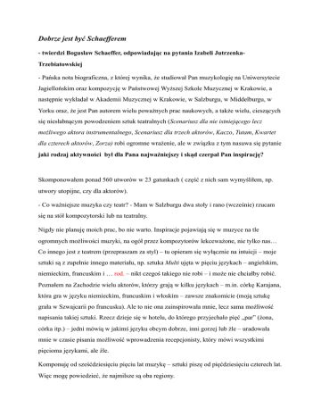 Dobrze jest być Schaefferem - twierdzi Bogusław Schaeffer, odpowiadając na pytania Izabeli JutrzenkaTrzebiatowskiej - Pańska nota biograficzna, z której wynika, że studiował Pan muzykologię na Uniwersytecie Jagiellońskim oraz kompozycję w Państwowej Wyższej Szkole Muzycznej w Krakowie, a następnie wykładał w Akademii Muzycznej w Krakowie, w Salzburgu, w Middelburgu, w Yorku oraz, że jest Pan autorem wielu poważnych prac naukowych, a także wielu, cieszących się niesłabnącym powodzeniem sztuk teatralnych (Scenariusz dla nie istniejącego lecz możliwego aktora instrumentalnego, Scenariusz dla trzech aktorów, Kaczo, Tutam, Kwartet dla czterech aktorów, Zorza) robi ogromne wrażenie, ale w związku z tym nasuwa się pytanie jaki rodzaj aktywności był dla Pana najważniejszy i skąd czerpał Pan inspirację? Skomponowałem ponad 560 utworów w 23 gatunkach ( część z nich sam wymyśliłem, np. utwory utopijne, czy dla aktorów). - Co ważniejsze muzyka czy teatr? - Mam w Salzburgu dwa stoły i rano (wcześnie) rzucam się na stół kompozytorski lub na teatralny. Nigdy nie planuję moich prac, bo nie warto. Inspiracje pojawiają się w muzyce na tle ogromnych możliwości muzyki, na ogół przez kompozytorów lekceważone, nie tylko nas… Co innego jest z teatrem (przepraszam za styl) – tu opieram się wyłącznie na intuicji – moje sztuki są z zupełnie innego materiału, np. sztuka Multi ujęta w pięciu językach – angielskim, niemieckim, francuskim i … rod. – nikt czegoś takiego nie robi – i może nie chciałby robić. Poznałem na Zachodzie wielu aktorów, którzy grają w kilku językach – m.in. córkę Karajana, która gra w języku niemieckim, francuskim i włoskim – zawsze znakomicie (moją sztukę grała w Szwajcarii po francusku). Ale to nie ona zainspirowała mnie, lecz sama możliwość napisania takiej sztuki. Rzecz dzieje się w hotelu, do którego przyjechało pięć „par” (żona, córka itp.) – jedni mówią w jakimś języku obcym dobrze, inni gorzej lub źle – uradowała mnie w czasie pisania możliwość wprowadzenia recepcjonisty, który mówi wszystkimi pięcioma językami, ale źle. Komponuję od sześćdziesięciu pięciu lat muzykę – sztuki piszę od pięćdziesięciu czterech lat. Więc mogę powiedzieć, że najmilsze są oba regiony. - Mam przed sobą dzieła pańskiego autorstwa: Leksykon kompozytorów XX wieku, Mały informator muzyki XX wieku, Muzykę XX wieku, Nową muzykę, Almanach polskich kompozytorów, oraz Klasyków dodekafonii i zastanawiam się czy posiadł Pan również umiejętność zamieniania nocy w dzień, czy też podobnie jak Napoleon nie sypiał Pan prawie wcale. W nocy nie pracuję, za to rano potrafię wstać o piątej, bo wcześnie idę spać; TV nie oglądam ani tu, ani nigdzie, bo to jest śmietnik. Napisałem czternaście książek głównie o nowej muzyce. Kompozytorzy nie piszą; kto by tam potrafił napisać trzy historie muzyki przeznaczone dla różnych użytkowników… Myślę, że kompozytorzy nie mają nic do powiedzenia – na to wygląda. A szkoda, bo napisanie np. historii muzyki jest bardzo pouczające – dotychczas. Muzykę należy dobrze poznać – również po to, żeby nie robić rzeczy wciąż podobnych do już istniejących…. Napoleon sypiał na koniu dziesięć minut i to mu wystarczało. W nocy nie pracowałem nigdy, nie było potrzeby. Ja dużo odpoczywam. - W artykule opublikowanym w 1971 roku w Forum Musicum Nr 12 dotyczącym estetyki nowej muzyki stwierdził Pan między innymi, że „muzyka współczesna powinna się rozwijać w różnych kierunkach estetycznego działania” – czy Pańskim zdaniem ten postulat i Pańskie oczekiwania zwłaszcza w zakresie takich nowatorskich form jak muzyka graficzna czy audiowizualna na przestrzeni minionych blisko czterdziestu lat zostały urzeczywistnione? Możliwości interesujące, które mnie tak fascynują, tworzą idealny klimat dla nowatorstwa. Dotąd kompozytorzy np. komponują na orkiestry, w których smyczki grają stadami, co dla mnie od początku było nieinteresujące – ergo postanowiłem pisać na solistycznie grających muzyków – tak jest w moich partyturach od pięćdziesięciu lat… Warto eksperymentować, – więc to robię. IV koncert skrzypcowy jest na solistę, grającego na trzech osobnie strojonych skrzypcach… Czegoś takiego nie było. Albo: Koncert fortepianowy na fortepian i chór piętnastu solistów wokalnych – jest taki zespół w Katowicach… Przykłady można bez końca wyliczać i może warto, bo nie piszę utworów podobnych. Stefan Kisielewski napisał kiedyś, że komponuję za piętnastu kompozytorów. Za dużo. Nawet były pretensje o to, że za dużo. A ja się pytam, czy ten, kto komponuje mało – i tylko na festiwale – co stało się już regułą… ( rozpisałem się). Nowa muzyka ma wielkie szanse, ale pełne urzeczywistnienie trwa dopiero po latach… - Ciekawi mnie ogromnie skąd u muzyka wziął się pomysł napisania dramatu i czy na tej decyzji zaważyły Pańskie osobiste kontakty z Teatrem Stu (podejrzewam, że Pan je musiał mieć) uchodzącym w swoim czasie w Krakowie za objawienie. Nie miałem żadnych kontaktów z Teatrem Stu. A tam się wystawiało całe lata sztuki kameralne … i tyle. - Którą ze swoich sztuk ceni Pan najbardziej i chciałby Pan, aby przeszła do kanonu klasyki? Oczywiście sztuki wielkoobsadowe (co za słowo!) – Mroki, Zorza, wspomniane Multi i sztukę Webern, która jest najwcześniejsza (1955). - Pisząc sztuki teatralne i komponując muzykę tworzył Pan teatr awangardowy – jakie w Pańskim zamyśle miało być jego ogólnoludzkie przesłanie i jaka w ogóle powinna być rola teatru? Sztuki pisałem zawsze myśląc o aktorach i o na ogół źle wykorzystywanych [scenariuszach] – w całej Europie. Scenariusza nie pisałem na przykład dla Peszka, lecz dałem mu, bo nikogo nie znałem, a on to trzymał dobrych parę 