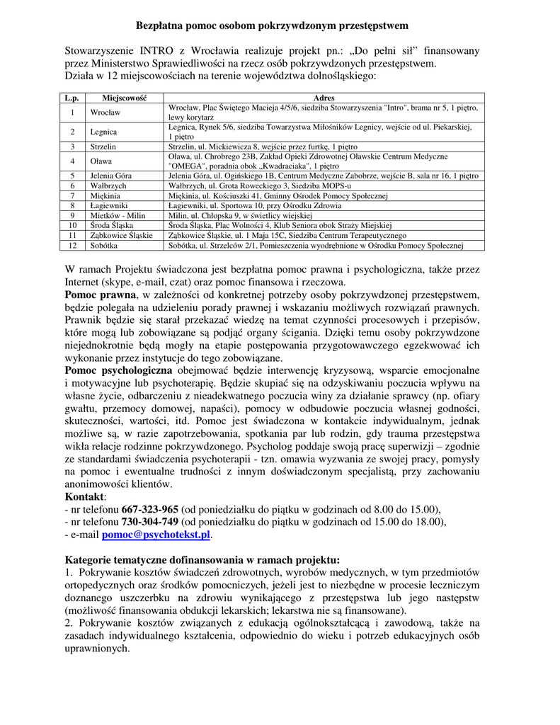 Bezpłatna pomoc osobom pokrzywdzonym przestępstwem Stowarzyszenie INTRO z Wrocławia realizuje projekt pn.: „Do pełni sił” finansowany przez Ministerstwo Sprawiedliwości na rzecz osób pokrzywdzonych przestępstwem. Działa w 12 miejscowościach na terenie województwa dolnośląskiego: L.p. Miejscowość 1 Wrocław 2 Legnica 3 Strzelin 4 Oława 5 6 7 8 9 10 11 12 Jelenia Góra Wałbrzych Miękinia Łagiewniki Mietków - Milin Środa Śląska Ząbkowice Śląskie Sobótka Adres Wrocław, Plac Świętego Macieja 4/5/6, siedziba Stowarzyszenia "Intro", brama nr 5, 1 piętro, lewy korytarz Legnica, Rynek 5/6, siedziba Towarzystwa Miłośników Legnicy, wejście od ul. Piekarskiej, 1 piętro Strzelin, ul. Mickiewicza 8, wejście przez furtkę, 1 piętro Oława, ul. Chrobrego 23B, Zakład Opieki Zdrowotnej Oławskie Centrum Medyczne "OMEGA", poradnia obok „Kwadraciaka", 1 piętro Jelenia Góra, ul. Ogińskiego 1B, Centrum Medyczne Zabobrze, wejście B, sala nr 16, 1 piętro Wałbrzych, ul. Grota Roweckiego 3, Siedziba MOPS-u Miękinia, ul. Kościuszki 41, Gminny Ośrodek Pomocy Społecznej Łagiewniki, ul. Sportowa 10, przy Ośrodku Zdrowia Milin, ul. Chłopska 9, w świetlicy wiejskiej Środa Śląska, Plac Wolności 4, Klub Seniora obok Straży Miejskiej Ząbkowice Śląskie, ul. 1 Maja 15C, Siedziba Centrum Terapeutycznego Sobótka, ul. Strzelców 2/1, Pomieszczenia wyodrębnione w Ośrodku Pomocy Społecznej W ramach Projektu świadczona jest bezpłatna pomoc prawna i psychologiczna, także przez Internet (skype, e-mail, czat) oraz pomoc finansowa i rzeczowa. Pomoc prawna, w zależności od konkretnej potrzeby osoby pokrzywdzonej przestępstwem, będzie polegała na udzieleniu porady prawnej i wskazaniu możliwych rozwiązań prawnych. Prawnik będzie się starał przekazać wiedzę na temat czynności procesowych i przepisów, które mogą lub zobowiązane są podjąć organy ścigania. Dzięki temu osoby pokrzywdzone niejednokrotnie będą mogły na etapie postępowania przygotowawczego egzekwować ich wykonanie przez instytucje do tego zobowiązane. Pomoc psychologiczna obejmować będzie interwencję kryzysową, wsparcie emocjonalne i motywacyjne lub psychoterapię. Będzie skupiać się na odzyskiwaniu poczucia wpływu na własne życie, odbarczeniu z nieadekwatnego poczucia winy za działanie sprawcy (np. ofiary gwałtu, przemocy domowej, napaści), pomocy w odbudowie poczucia własnej godności, skuteczności, wartości, itd. Pomoc jest świadczona w kontakcie indywidualnym, jednak możliwe są, w razie zapotrzebowania, spotkania par lub rodzin, gdy trauma przestępstwa wikła relacje rodzinne pokrzywdzonego. Psycholog poddaje swoją pracę superwizji – zgodnie ze standardami świadczenia psychoterapii - tzn. omawia wyzwania ze swojej pracy, pomysły na pomoc i ewentualne trudności z innym doświadczonym specjalistą, przy zachowaniu anonimowości klientów. Kontakt: - nr telefonu 667-323-965 (od poniedziałku do piątku w godzinach od 8.00 do 15.00), - nr telefonu 730-304-749 (od poniedziałku do piątku w godzinach od 15.00 do 18.00), - e-mail [email protected]. Kategorie tematyczne dofinansowania w ramach projektu: 1. Pokrywanie kosztów świadczeń zdrowotnych, wyrobów medycznych, w tym przedmiotów ortopedycznych oraz środków pomocniczych, jeżeli jest to niezbędne w procesie leczniczym doznanego uszczerbku na zdrowiu wynikającego z przestępstwa lub jego następstw (możliwość finansowania obdukcji lekarskich; lekarstwa nie są finansowane). 2. Pokrywanie kosztów związanych z edukacją ogólnokształcącą i zawodową, także na zasadach indywidualnego kształcenia, odpowiednio do wieku i potrzeb edukacyjnych osób uprawnionych. 3. Finansowanie okresowych dopłat do bieżących zobowiązań czynszowych za lokal mieszkalny, do którego osoba uprawniona posiada tytuł prawny, a lokal mieszkalny nie jest użytkowany przez inne osoby. 4. Finansowanie przejazdów środkami komunikacji publicznej lub pokrywanie kosztów transportu związanych z uzyskiwaniem świadczeń i regulowaniem spraw określonych w pkt. 1-2 oraz korzystaniem z pomocy prawnej i psychologicznej. 5. Pokrywanie kosztów żywności lub bonów żywnościowych. 6. Pokrywanie kosztów zakupu odzieży, bielizny, obuwia, środków czystości i higieny osobistej. Więcej informacji o Projekcie pod adresem e-mail: [email protected] lub na stronie: http://www.psychotekst.pl/strona.php?nr=92.