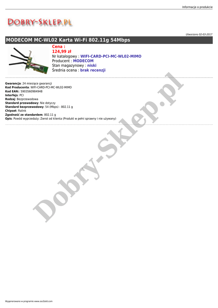 Informacje o produkcie Utworzono 02-03-2017 MODECOM MC-WL02 Karta Wi-Fi 802.11g 54Mbps Cena : 124,99 zł D ob ry - Sk le Gwarancja: 24 miesiące gwarancji Kod Producenta: WIFI-CARD-PCI-MC-WL02-MIMO Kod EAN:: 5903560984948 Interfejs: PCI Rodzaj: Bezprzewodowa Standard przewodowy: Nie dotyczy Standard bezprzewodowy: 54 (Mbps) - 802.11 g Chipset: Ralink Zgodność ze standardem: 802.11 g Opis: Powód wyprzedaży: Zwrot od klienta (Produkt w pełni sprawny i nie używany) p. pl Nr katalogowy : WIFI-CARD-PCI-MC-WL02-MIMO Producent : MODECOM Stan magazynowy : niski Średnia ocena : brak recenzji Wygenerowano w programie www.oscGold.com