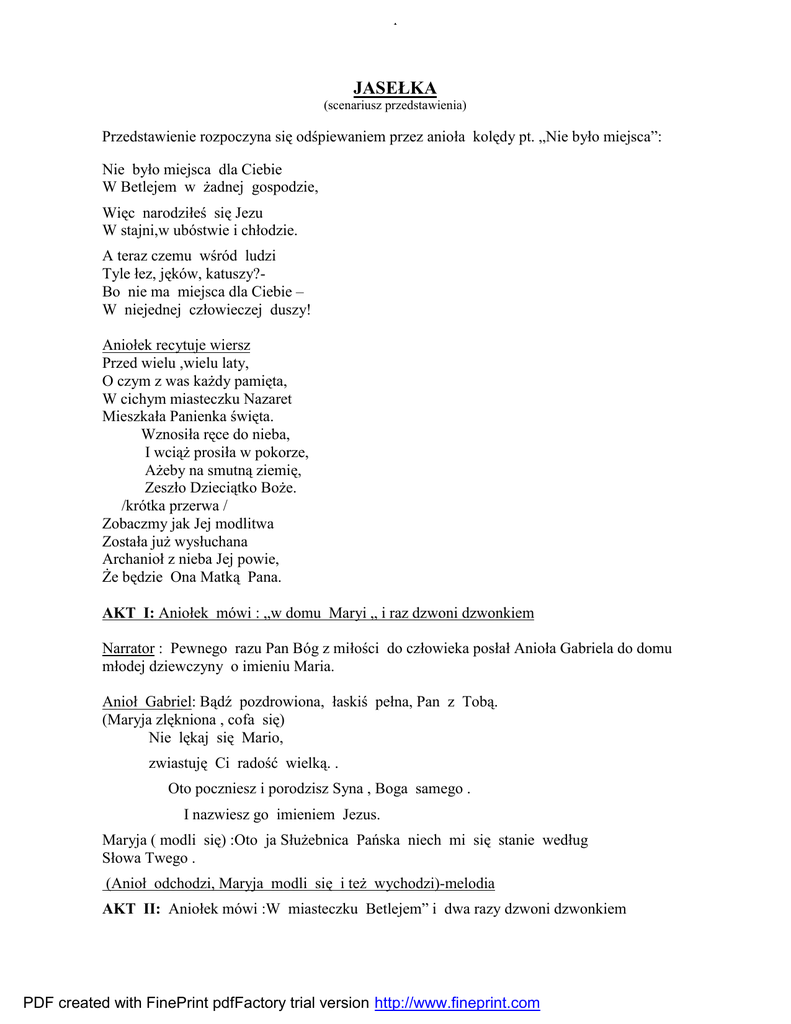 1 JASEŁ KA (scenariusz przedstawienia) Przedstawienie rozpoczyna się odśpiewaniem przez anioła kolę dy pt. „ Nie było miejsca” : Nie było miejsca dla Ciebie W Betlejem w ż adnej gospodzie, Wię c narodziłeś się Jezu W stajni,w ubó stwie i chłodzie. A teraz czemu wśró d ludzi Tyle łez, ję kó w, katuszy?Bo nie ma miejsca dla Ciebie – W niejednej człowieczej duszy! Aniołek recytuje wiersz Przed wielu ,wielu laty, O czym z was każ dy pamię ta, W cichym miasteczku Nazaret Mieszkała Panienka świę ta. Wznosiła rę ce do nieba, I wcią ż prosiła w pokorze, Aż eby na smutną ziemię , Zeszło Dziecią tko Boż e. /kró tka przerwa / Zobaczmy jak Jej modlitwa Została już wysłuchana Archaniołz nieba Jej powie, Ż e bę dzie Ona Matką Pana. AKT I: Aniołek mó wi : „ w domu Maryi „ i raz dzwoni dzwonkiem Narrator : Pewnego razu Pan Bó g z miłości do człowieka posłałAnioła Gabriela do domu młodej dziewczyny o imieniu Maria. AniołGabriel: Bą dź pozdrowiona, łaskiś pełna, Pan z Tobą . (Maryja zlę kniona , cofa się ) Nie lę kaj się Mario, zwiastuję Ci radość wielką . . Oto poczniesz i porodzisz Syna , Boga samego . I nazwiesz go imieniem Jezus. Maryja ( modli się ) :Oto ja Służ ebnica Pańska niech mi się stanie według Słowa Twego . (Aniołodchodzi, Maryja modli się i też wychodzi)-melodia AKT II: Aniołek mó wi :W miasteczku Betlejem” i dwa razy dzwoni dzwonkiem PDF created with FinePrint pdfFactory trial version http://www.fineprint.com 2 Narrator Wyszedłdekret od cesarza Augusta, aby spisano wszelki świat. Każ dy tedy szedłdo miasta swego. Poszedłwię c i Jó zef z Galilei do Betlejem , miasta Dawidowego wraz z Maryją , poślubioną sobie Małżonką brzemienną . Jó zef: puka Gospodarz: Kto tam? Jó zef: Podró ż ni strudzeni daleką drogą , proszą o nocleg. Gospodarz : A zapłacić mogą ? Jó zef: Pienię dzy nie mamy – lecz zrobię co trzeba, Bylebyśmy dach mieli i kawałek chleba. Gospodarz: Idźcie szukać dalej- moż e co znajdziecie? Nie tylko mó j zajazd istnieje na świecie! Jó zef: Panie zmiłuj się ! Gospodarz: Nie ma litości, dla takich , jak wybez pienię dzy - gości ! Jó zef: puka znowu Gospodarz: Kto tam? Jó zef: W imię Boga proszę Otwó rzcie nam Panie, I dajcie choć na słomie, Na ziemi posłanie. Gospodarz: Nie ma miejsca dla biedakó w, Nie pukajcie po pró ż nicy, Gdy nie macie czym zapłacićTo nocujcie na ulicy! Śpiew: Nie było miejsca dla Ciebie........Maryja: Jó zefie...... Nie mogę iść dalej......... Jó zef: Maryjo - biedna Ty panienko moja....... Usią dź tu trochę ..........tak pó źna godzina Jeszcze poszukam – moż e znajdę miejsce – Dla Ciebie Maryjo . Maryja: (cicho) Dla mojego Syna! ( św. Jó zef wychodzi - cisza, krzesło dla Maryi) Narrator: Siadła Maryja już bez sił I na Jó zefa czeka ........ W dłoniach ukryła świę tą twarz , Mię dzy palcami łza ścieka......... Nikt nie chce przyją ć Matki tej , Co miast srebrnikó w u proga, PDF created with FinePrint pdfFactory trial version http://www.fineprint.com 3 W zapłatę , za marny niesie dach Ludziom – samego Boga! O ludzie betlejemscy Gdzież wasze serca są ?! Czemu chciwością zamknię tePrzed przyjściem Boga drż ą ?! A Matka znuż ona siedzi wcią ż I czeka – cią gle czekaCzy się otworzą przed nią drzwi, A moż e- serce człowieka?! Pastuszek (wchodzi i mó wi do siebie): Kto tu siedzi na kamieniu? Jakaś niewiasta ? - i płacze ?..... Kto Ona ?-Nie wiem, podejdę bliż ej i zobaczę . (podchodzi , zaglą da) Wchodzi św. Jó zef i zbliż a się milczą c do Maryi. Jó zef: Maryjo tak mi cię ż al , Zrobiłem co w mojej jest mocy, Maryja: Trudno Jó zefie , tak widać chce Bó g, Ale mi ż al ,ż e ludzie nie chcą przyją ć Boga!....... Pastuszek : Panie.......... My domu nie mamy , bośmy pasterze – i nawet stą d blisko Nasze pastusze - palimy ognisko , Przenocujcie w stajence ,wśró d trzody. Bydlą t w stajni nie ma. Słomę Wam przyniosę . Cieplej bę dzie, jak na dworze. Pó jdźcie za mną ! Proszę . Maryja: Bó g zapłać ci – stokrotnie , Pastuszku mó j drogi..... Pastuszek: Nie ma za co ( ze smutkiem) w tak niegodne prowadzę was progi..... Jó zef : Widzisz chłopcze . Pan Bó g czasem – Taką wiedzie drogą , Któ rej ludzie najmą drzejsi - zrozumieć nie mogą . Pasterz: Chodźmy ,chodźmy. Niedaleko jest nasza stajenka...... Nie przemoknie tam na deszczuMaryi sukienka . (wychodzą powoli) PDF created with FinePrint pdfFactory trial version http://www.fineprint.com 4 Śpiew :Spuśćcie nam ......... Narrator: Wicher ję czy zawodzi – targa gałęziami, O!, ż eby zatargałi wstrzą sną łsercami !...duszami ludzkimi, któ re śpią , o swojej wygodzie, tylko śnią ... Cicho ,wiatr ustał.....gwiazdy niebo złocą , jak boż e światła migocą , migocą .... Niech wpatrzy się w te gwiazdy na tym niebie lud. Niech czeka w milczeniu ! Niech czuwa ! BO SPEŁ NIA SIĘ CUD!!!!!! AKT III Aniołek mó wi: Dwie odsłony były teraz bę dzie trzecia. W tej trzeciej odsłonie wielka radość bę dzie- wszyscy do stajenki przyjdą po kolę dzie.-aniołek dzwoni trzy razy dzwonkiem Czekajcie kochani, chyba już ktoś przyszedłSzum anielskich skrzydełza kurtyną słyszę ................... Śpiew :Bó g się rodzi........... ( zapala się światło) Wchodzą aniołowie, Maryja i Jó zef Anioł: Wiatr się wdziera poprzez ściany, Po stajence hula..... W ż łobie leż y Pan nad Pany, Matka Go otula!! - W ż łobie leż y – Bó g Wszechmocny – - Niemowlą tko małe !.... - Opuszczone , w twardym sianie , - Z zimna - drż ą ce całe ! Aniołowie śpiewają : Nie było miejsca dla Ciebie...... Anioł: W niebieś miałJezu swe szczę ście , -Nic Ci nie było potrzeba – Czemuś wię c zeszedłna ziemię W noc ciemną ? Daleko od Nieba ? Anioł: Czemuś Jezu pozwolił Na ż łób i opuszczenie? Dlaczegoś tak się zniż ył? Wszyscy: By przynieść 