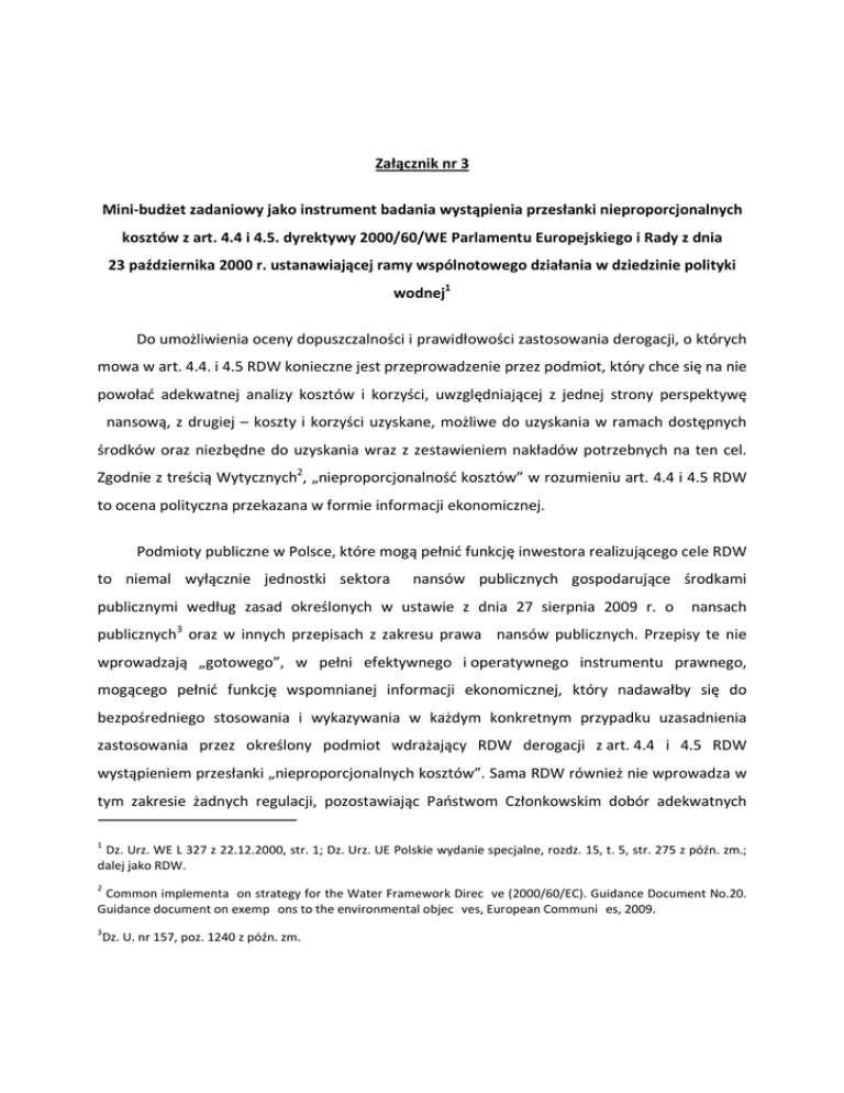 Załącznik nr 3 Mini-budżet zadaniowy jako instrument badania wystąpienia przesłanki nieproporcjonalnych kosztów z art. 4.4 i 4.5. dyrektywy 2000/60/WE Parlamentu Europejskiego i Rady z dnia 23 października 2000 r. ustanawiającej ramy wspólnotowego działania w dziedzinie polityki wodnej1 Do umożliwienia oceny dopuszczalności i prawidłowości zastosowania derogacji, o których mowa w art. 4.4. i 4.5 RDW konieczne jest przeprowadzenie przez podmiot, który chce się na nie powołać adekwatnej analizy kosztów i korzyści, uwzględniającej z jednej strony perspektywę % nansową, z drugiej – koszty i korzyści uzyskane, możliwe do uzyskania w ramach dostępnych środków oraz niezbędne do uzyskania wraz z zestawieniem nakładów potrzebnych na ten cel. Zgodnie z treścią Wytycznych2, „nieproporcjonalność kosztów” w rozumieniu art. 4.4 i 4.5 RDW to ocena polityczna przekazana w formie informacji ekonomicznej. Podmioty publiczne w Polsce, które mogą pełnić funkcję inwestora realizującego cele RDW to niemal wyłącznie jednostki sektora % nansów publicznych gospodarujące środkami publicznymi według zasad określonych w ustawie z dnia 27 sierpnia 2009 r. o % nansach publicznych3 oraz w innych przepisach z zakresu prawa % nansów publicznych. Przepisy te nie wprowadzają „gotowego”, w pełni efektywnego i operatywnego instrumentu prawnego, mogącego pełnić funkcję wspomnianej informacji ekonomicznej, który nadawałby się do bezpośredniego stosowania i wykazywania w każdym konkretnym przypadku uzasadnienia zastosowania przez określony podmiot wdrażający RDW derogacji z art. 4.4 i 4.5 RDW wystąpieniem przesłanki „nieproporcjonalnych kosztów”. Sama RDW również nie wprowadza w tym zakresie żadnych regulacji, pozostawiając Państwom Członkowskim dobór adekwatnych 1 Dz. Urz. WE L 327 z 22.12.2000, str. 1; Dz. Urz. UE Polskie wydanie specjalne, rozdz. 15, t. 5, str. 275 z późn. zm.; dalej jako RDW. 2 Common implementa; on strategy for the Water Framework Direc; ve (2000/60/EC). Guidance Document No.20. Guidance document on exemp; ons to the environmental objec; ves, European Communi; es, 2009. 3 Dz. U. nr 157, poz. 1240 z późn. zm. środków prawno-organizacyjnych, które mogłyby być stosowane w tym celu. Z tego względu należy wykorzystać środki lub mechanizmy, które z jednej strony będą bazować na już wdrożonych instrumentach prawno-organizacyjnych funkcjonujących w polskim systemie $ nansów publicznych, z drugiej – dadzą się zaadoptować do celów, które musza spełnić w kontekście art. 4.4 lub art. 4.5 RDW. Mając na uwadze powyższe, w przypadkach, w których możliwe wydaje się być zastosowanie ww. przepisów, rekomenduje się sporządzenie analizy $ nansowo-środowiskowej, opartej na analizie wniosków wynikających z: 1) analizy budżetów (planów $ nansowych) podmiotów wdrażających RDW od roku poprzedzającego rozpoczęcie wdrażania RDW, analizy budżetu na bieżący rok budżetowy oraz analizy prognoz na lata budżetowe pozostałe do zakończenia pierwszego etapu wdrażania RDW, z uwzględnieniem prognozy budżetów w latach obejmujących drugi (i ewentualnie kolejny) etap wdrażania RDW oraz 2) analizy budżetów zadaniowych w tych jednostkach realizujących cele RDW, w których są one wdrożone, lub analizy mini-budżetów zadaniowych, opracowanych specjalnie dla potrzeb skorzystania z ewentualnej derogacji z art. 4.4. lub 4.5 RDW, obejmujących wyłącznie zadania realizowane przez dany podmiot w zakresie wdrażania celów RDW. Wykazanie przez podmioty publiczne nieproporcjonalności kosztów nie może ograniczać się do analizy własnej sytuacji $ nansowej w jednym roku budżetowym. W analizie winna być wskazana precyzyjna analiza gospodarki budżetowej co najmniej od roku poprzedzającego rok rozpoczęcia wdrażania RDW, ze wskazaniem trendów i tendencji. Analizę bezwzględnie należy uzupełnić o prognozę dotyczącą stanu $ nansów podmiotu w latach przyszłych. Powinna ona być ściśle skorelowana z Wieloletnim Planem Finansowym Państwa, bo dopiero wówczas możliwe jest ujęcie prognozy własnych $ nansów w kontekście prognoz dotyczących budżetu państwa. Zgodnie z art. 42 ust. 1 ustawy o $ nansach publicznych, sposób gromadzenia środków publicznych przez podmioty z sektora $ nansów publicznych z poszczególnych tytułów określają odrębne ustawy. Co do zasady gospodarowanie wodami i wdrażanie RDW jest $ nansowane ze środków budżetu państwa. Dodatkowo, choć w znacząco mniejszej skali, do puli środków, które zgodnie z obowiązującymi w Polsce przepisami mogą być przeznaczane na realizację zadań z zakresu gospodarki wodnej, w tym na wdrażanie działań niezbędnych do osiągnięcia celów RDW wchodzą między innymi fundusze UE, dochody własne jednostek samorządu terytorialnego oraz dochody z opłat wnoszonych przez użytkowników wód zgodnie z zasadą zwrotu kosztów. Zgodnie z art. 44 ust. 1 ustawy o $ nansach publicznych wydatki publiczne mogą być ponoszone wyłącznie na cele i w wysokościach ustalonych w: 1) ustawie budżetowej; 2) uchwale budżetowej jednostki samorządu terytorialnego; 3) planie $ nansowym jednostki sektora $ nansów publicznych. W związku z tym, że podmioty z sektora $ nansów publicznych nie mogą wydatkować środków poza budżetem (planem) i bez zawartego w nim upoważnienia, analiza ustawy i uchwały budżetowej lub planu $ nansowego (dalej jako analiza budżetu) w odpowiednim, wyżej wskazanym horyzoncie czasowym powinna wyczerpująco wyjaśniać kwes: ę dostępności środków na realizację celów RDW dla danego podmiotu publicznego. Podmioty publiczne, zwłaszcza jednostki samorządu terytorialnego konstruujące budżet i organy administracji rządowej konstruujące plan $ nansowy są ściśle związane limitami środków z budżetu państwa przeznaczonych na określone zadania z zakresu administracji rządowej, do 