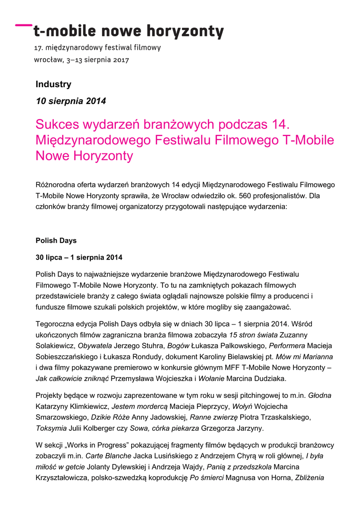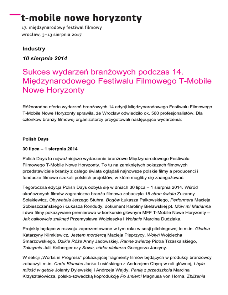 Industry 10 sierpnia 2014 Sukces wydarzeń branżowych podczas 14. Międzynarodowego Festiwalu Filmowego T-Mobile Nowe Horyzonty Różnorodna oferta wydarzeń branżowych 14 edycji Międzynarodowego Festiwalu Filmowego T-Mobile Nowe Horyzonty sprawiła, że Wrocław odwiedziło ok. 560 profesjonalistów. Dla członków branży filmowej organizatorzy przygotowali następujące wydarzenia: Polish Days 30 lipca – 1 sierpnia 2014 Polish Days to najważniejsze wydarzenie branżowe Międzynarodowego Festiwalu Filmowego T-Mobile Nowe Horyzonty. To tu na zamkniętych pokazach filmowych przedstawiciele branży z całego świata oglądali najnowsze polskie filmy a producenci i fundusze filmowe szukali polskich projektów, w które mogliby się zaangażować. Tegoroczna edycja Polish Days odbyła się w dniach 30 lipca – 1 sierpnia 2014. Wśród ukończonych filmów zagraniczna branża filmowa zobaczyła 15 stron świata Zuzanny Solakiewicz, Obywatela Jerzego Stuhra, Bogów Łukasza Palkowskiego, Performera Macieja Sobieszczańskiego i Łukasza Rondudy, dokument Karoliny Bielawskiej pt. Mów mi Marianna i dwa filmy pokazywane premierowo w konkursie głównym MFF T-Mobile Nowe Horyzonty – Jak całkowicie zniknąć Przemysława Wojcieszka i Wołanie Marcina Dudziaka. Projekty będące w rozwoju zaprezentowane w tym roku w sesji pitchingowej to m.in. Głodna Katarzyny Klimkiewicz, Jestem mordercą Macieja Pieprzycy, Wołyń Wojciecha Smarzowskiego, Dzikie Róże Anny Jadowskiej, Ranne zwierzę Piotra Trzaskalskiego, Toksymia Julii Kolberger czy Sowa, córka piekarza Grzegorza Jarzyny. W sekcji „Works in Progress” pokazującej fragmenty filmów będących w produkcji branżowcy zobaczyli m.in. Carte Blanche Jacka Lusińskiego z Andrzejem Chyrą w roli głównej, I była miłość w getcie Jolanty Dylewskiej i Andrzeja Wajdy, Panią z przedszkola Marcina Krzyształowicza, polsko-szwedzką koprodukcję Po śmierci Magnusa von Horna, Zbliżenia Magdaleny Piekorz i debiut fabularny Zbigniewa Libery, pt. Walser. Po prezentacjach, w ciągu 2 dni odbyło się 106 oficjalnych spotkań 1 na 1 pomiędzy gośćmi a zespołami prezentującymi projekty. Goście Wśród 200 gości wydarzenia znaleźli się m.in. fundusze filmowe, zagraniczni producenci, selekcjonerzy festiwali filmowych w Berlinie, Cannes, Edynburgu, Rotterdamie, Monachium, Stambule i Goteborgu, a także dystrybutorzy i agenci sprzedaży, m.in. z firm Level K, NDM, Premium Films, Film Republic, Alpha Violet, Indie Sales, New Europe Film Sales, Just Film Distribution, Imagine Film, Soda Pictures i Epicentre. Turcja We Wrocławiu obecna była również delegacja przedstawicieli tureckiej branży filmowej zaproszona w ramach obchodów 600-lecia stosunków dyplomatycznych między Polską a Turcją. Partnerami tej prezentacji był międzynarodowy festiwal filmowy w Stambule, Instytut Adama Mickiewicza i tureckie ministerstwo kultury i turystyki. Nagrody W tym roku po raz pierwszy partnerzy Polish Days ze studiów post-produkcyjnych Chimney Poland i Toya Studios przyznali nagrody w postaci 50% zniżki na usługi post-produkcyjne obrazu i dźwięku. Toya Studios przyznało nagrodę Wołyniowi Wojtka Smarzowskiego, a Chimney Poland exequo Wołyniowi Wojtka Smarzowskiego i Sowie, córce piekarza Grzegorza Jarzyny. W ramach Polish Days odbyły się także warsztaty dźwiękowe Toya Studios prowadzone przez Błażeja Kafarskiego, a także spotkanie Meet the Polish Film Commissions, podczas którego polska i zagraniczna branża mogła spotkać przedstawicieli polskich komisji filmowych na indywidualnych spotkaniach. Współorganizatorami Polish Days byli Polski Instytut Sztuki Filmowej, Wrocław Film Commission i Odra Film a partnerami Film Commission Poland, Łódź Film Commission, Mazovia Warsaw Film Commission, Poznań Film Commission, Kraków Film Commission i Silesia Film Commission, Chimney Poland, Toya Studios, Festivalscope i Narodowy Instytut Audiowizualny. Studio Nowe Horyzonty 27 - 30 lipca 2014 Studio Nowe Horyzonty to najważniejszy program szkoleniowy Międzynarodowego Festiwalu Filmowego T-Mobile Nowe Horyzonty. Organizowane od 5 lat warsztaty wychowały już ponad 100 absolwentów z Polski i zagranicy. Współorganizatorami wydarzenia są Creative Europe Desk Polska i London Film Academy. 5. edycja Studia Nowe Horyzonty odbyła się w dniach 27 - 30 lipca 2014. W czasie warsztatów młodzi uczestnicy (reżyserzy i producenci) poznali tajniki międzynarodowego rynku filmowego - spotkali ekspertów, rozmawiali o swoich projektach i planowaniu kariery, a także zdobyli wiedzę o pitchingu, nawiązywaniu profesjonalnych kontaktów, a także rozwoju i pakietowaniu projektów filmowych. Tegoroczni wykładowcy to profesjonaliści z dużym doświadczeniem: Gavin Humpfries, David Pope (London Film Academy), Marc Guidoni, Joanna Szybist (Fondivina), Raymond Phathanavirangoon (producent i selekcjoner), Guillaume de Seille (Arizona Films), Gulin Ustun (Istanbul FF, Meetings on the Bridge), Emre Yeksan (producent) i James Mullighan (Cork Film Festival). W ramach Studia Nowe Horyzonty odbył się także masterclass z Małgorzatą i Wojciechem Staroniami. Wśród tegorocznych uczestników znaleźli się m.in. zwycięzcy Konkursu Młodego Kina na festiwalu w Gdyni w 2013 roku Paweł Maślona (Magma) i Julia Kolberger (Mazurek), a także producenci Klaudia Śmieja (Pod Mocnym Aniołem) i Paweł Kosuń (W cieniu). W ramach współpracy z festiwalami w Transylwanii, Locarno, Lizbonie, Stambule i Cinesonne w Paryżu, w Studiu Nowe Horyzonty wzięło także udział osiem osób z zagranicy. A Sunday in the Country 30 lipca – 2 sierpnia 2014 We współpracy z Europejską Akademią Filmową, Międzynarodowy Festiwal Filmowy TMobile Nowe Horyzonty już po raz trzeci zorganizował we Wrocławiu wydarzenie A Sunday in the Country, poświęcone edukacji młodych europejskich krytyków filmowych. Pod opieką organizatorów, mieli oni możliwość przez cztery d