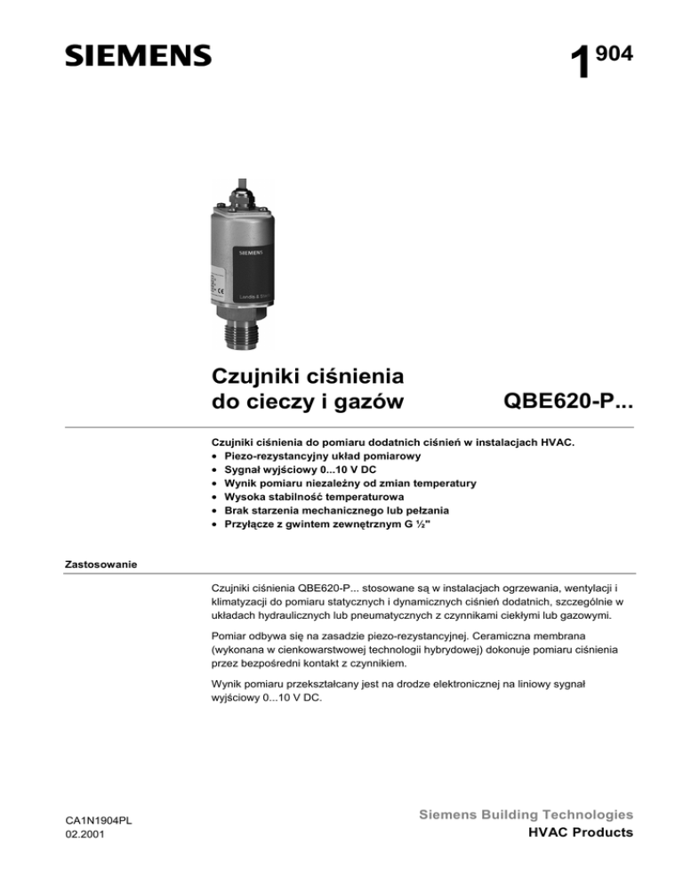 1904 Czujniki ciśnienia do cieczy i gazów QBE620-P