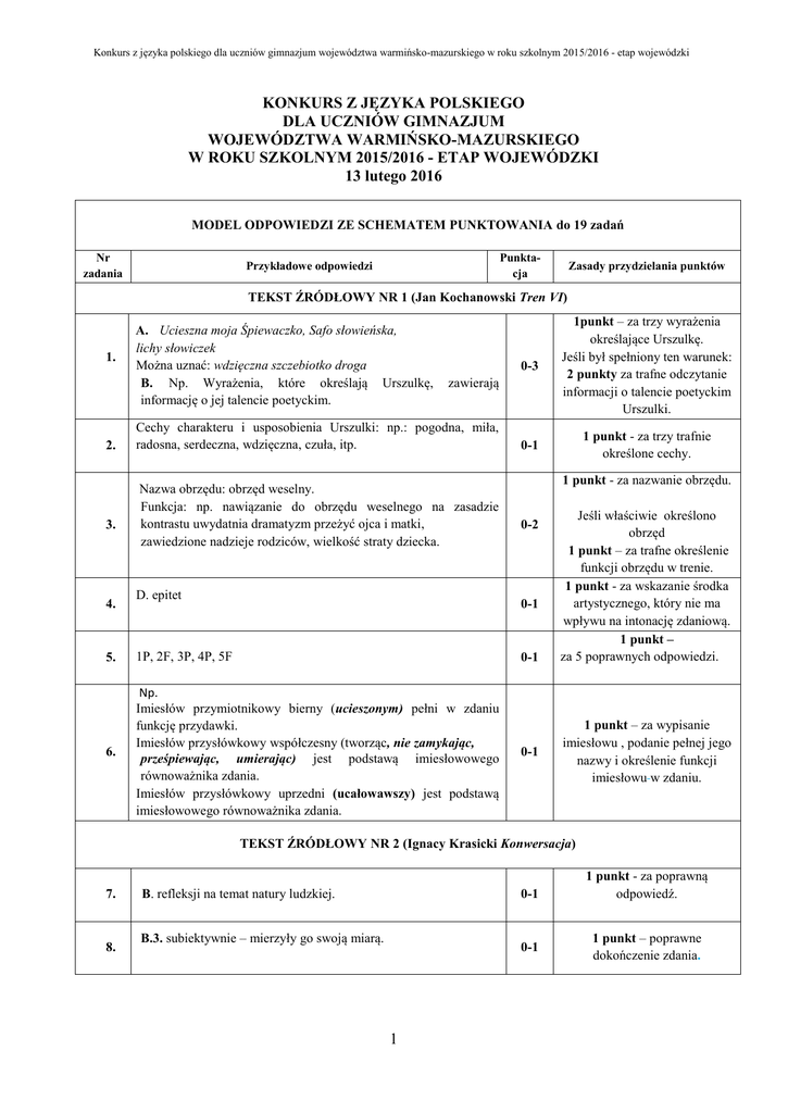 Konkurs z języka polskiego dla uczniów gimnazjum województwa warmińsko-mazurskiego w roku szkolnym 2015/2016 - etap wojewódzki KONKURS Z JĘZYKA POLSKIEGO DLA UCZNIÓW GIMNAZJUM WOJEWÓDZTWA WARMIŃSKO-MAZURSKIEGO W ROKU SZKOLNYM 2015/2016 - ETAP WOJEWÓDZKI 13 lutego 2016 MODEL ODPOWIEDZI ZE SCHEMATEM PUNKTOWANIA do 19 zadań Nr zadania Punktacja Przykładowe odpowiedzi Zasady przydzielania punktów TEKST ŹRÓDŁOWY NR 1 (Jan Kochanowski Tren VI) 1. 2. 3. 4. A. Ucieszna moja Śpiewaczko, Safo słowieńska, lichy słowiczek Można uznać: wdzięczna szczebiotko droga B. Np. Wyrażenia, które określają Urszulkę, informację o jej talencie poetyckim. 0-3 1punkt – za trzy wyrażenia określające Urszulkę. Jeśli był spełniony ten warunek: 2 punkty za trafne odczytanie informacji o talencie poetyckim Urszulki. 0-1 1 punkt - za trzy trafnie określone cechy. zawierają Cechy charakteru i usposobienia Urszulki: np.: pogodna, miła, radosna, serdeczna, wdzięczna, czuła, itp. Nazwa obrzędu: obrzęd weselny. Funkcja: np. nawiązanie do obrzędu weselnego na zasadzie kontrastu uwydatnia dramatyzm przeżyć ojca i matki, zawiedzione nadzieje rodziców, wielkość straty dziecka. D. epitet 1 punkt - za nazwanie obrzędu. 0-2 0-1 5. 1P, 2F, 3P, 4P, 5F 6. Np. Imiesłów przymiotnikowy bierny (ucieszonym) pełni w zdaniu funkcję przydawki. Imiesłów przysłówkowy współczesny (tworząc, nie zamykając, prześpiewając, umierając) jest podstawą imiesłowowego równoważnika zdania. Imiesłów przysłówkowy uprzedni (ucałowawszy) jest podstawą imiesłowowego równoważnika zdania. 0-1 0-1 Jeśli właściwie określono obrzęd 1 punkt – za trafne określenie funkcji obrzędu w trenie. 1 punkt - za wskazanie środka artystycznego, który nie ma wpływu na intonację zdaniową. 1 punkt – za 5 poprawnych odpowiedzi. 1 punkt – za wypisanie imiesłowu , podanie pełnej jego nazwy i określenie funkcji imiesłowu w zdaniu. TEKST ŹRÓDŁOWY NR 2 (Ignacy Krasicki Konwersacja) 7. 8. B. refleksji na temat natury ludzkiej. 0-1 B.3. subiektywnie – mierzyły go swoją miarą. 0-1 1 1 punkt - za poprawną odpowiedź. 1 punkt – poprawne dokończenie zdania. Konkurs z języka polskiego dla uczniów gimnazjum województwa warmińsko-mazurskiego w roku szkolnym 2015/2016 - etap wojewódzki 9. 1P, 2P, 3F, 4F, 5F 0-1 1 punkt – za 5 poprawnych odpowiedzi. Przykładowe odpowiedzi uwzględniające różne, ale możliwe w kontekście utworu odczytania bajki Konwersacja. Bajka ostrzega przed wygórowanym sądem o sobie, ponieważ wtedy narażamy się na śmieszność i nienaturalność. 10. Bajka ostrzega, że ocenianie innych według siebie prowadzi do nieobiektywnych i niesprawiedliwych ocen. 0-1 Bajka zachęca, by dbać o naturalność i niezależność, a odrzucić bezkrytyczne naśladownictwo. 1 punkt - za trafne określenie morału z bajki i zastosowanie zdania złożonego Bajka przypomina, że wywyższanie się człowieka ponad zwierzęta bywa często nieuzasadnione. Np. Kruk i lis - próżność, łatwowierność, zbytnia pewność siebie, brak krytycyzmu prowadzi do zguby. 11. 2 punkty – za podanie dwóch tytułów bajek Ignacego Krasickiego oraz za trafne sformułowanie pouczeń z każdej bajki. 0-2 Ptaszki w klatce - kto kocha wolność, nie pogodzi się z niewolą; przestroga dla młodych, by nie tracili poczucia tożsamości narodowej (przestroga dla narodu żyjącego pod zaborami). 1 punkt – za podanie tytułu bajki Ignacego Krasickiego oraz trafne sformułowanie pouczenia wynikającego z tej bajki TEKST ŹRÓDŁOWY NR 3 (fragment Zemsty) 12. B.2. pośredni, ponieważ o cechach i postawie bohatera świadczą jego wypowiedzi i zachowanie. 0-1 1 punkt – za poprawne dokończenie zdania 13. C. uważa przebiegłość za dobrą taktykę. 0-1 1 punkt – za poprawne dokończenie zdania. 14. 1F, 2P, 3P, 4F, 5P 0-1 1 punkt – za 5 poprawnych odpowiedzi. 15. Np. dwukropek - wprowadza przytoczenie czyichś słów /wprowadza mowę niezależną przecinki - wydzielają wyraz w wołaczu/bezpośredni zwrot do adresata/apostrofę cudzysłów - wydziela cytowane słowa / mowę niezależną wielokropek w nawiasie kwadratowym - sygnalizuje opuszczenie fragmentu cytowanego tekstu 2 0-2 2 punkty – za trafne uzasadnienie użycia w cytowanym fragmencie czterech znaków interpunkcyjnych. 1 punkt - za trafne uzasadnienie użycia w cytowanym fragmencie trzech znaków interpunkcyjnych. Konkurs z języka polskiego dla uczniów gimnazjum województwa warmińsko-mazurskiego w roku szkolnym 2015/2016 - etap wojewódzki 16. 17. TEKST ŹRÓDŁOWY NR 4 (Jerzy Bralczyk, fragment wywiadu) 1 punkt – za trafny wybór odpowiedzi. a) pozytywny - uzasadnienie: dzięki elektronicznym środkom przekazywania 1 punkt – za sformułowanie 0-2 informacji słowo pisane odzyskuje swoje znaczenie. trafnego argumentu wynikającego z tekstu. 2 punkty – za trafne nazwanie Np. dwóch funkcji emotikonów Funkcje emotikonów: w komunikacji internetowej. wyrażają emocje nadawcy, wskazują na ton intonacji, 1 punkt – za trafne nazwanie 0-2 jednej funkcji emotikonów zastępują w komunikacji internetowej. znaki interpunkcyjne, znaki niewerbalne. 18. Np. skracanie komunikatów np. Jerzy Bralczyk nie jest zwolennikiem tej tendencji, ponieważ uważa, że zbyt krótkie komunikaty nie opisują relacji międzyludzkich i pomijają nazywanie emocji. Sam jest zwolennikiem dłuższych komunikatów. 19. Neologizmy: emotikon, Twitter, mejl, infografika, SMS, blog, WWW. 0-2 1 punkt – za trafne nazwanie tendencji. 1 punkt – za trafne określenie stosunku Bralczyka do tej tendencji. 0-1 1 punkt – za wypisane z tekstu trzech neologizmów. Tren VI – 9 punktów, Konwersacja - 6 punktów Zemsta – 5 punktów Wywiad – 7 punktów Razem 27 punktów Zadanie 20. OPOWIADANIE w związku z treścią i wymową graffiti Banksy’ego KRYTERIA OCENIANIA TREŚCI OPOWIADANIA opracowane na podstawie kryteriów zastosowanych na egzaminie 