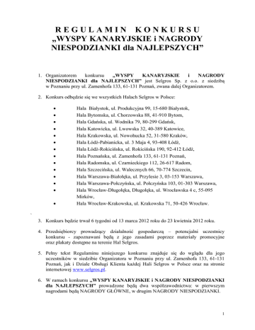 REGULAMIN KONKURSU „WYSPY KANARYJSKIE i NAGRODY NIESPODZIANKI dla NAJLEPSZYCH” 1. Organizatorem konkursu „WYSPY KANARYJSKIE i NAGRODY NIESPODZIANKI dla NAJLEPSZYCH” jest Selgros Sp. z o.o. z siedzibą w Poznaniu przy ul. Zamenhofa 133, 61-131 Poznań, zwana dalej Organizatorem. 2. Konkurs odbędzie się we wszystkich Halach Selgros w Polsce: Hala Białystok, ul. Produkcyjna 99, 15-680 Białystok, Hala Bytomska, ul. Chorzowska 88, 41-910 Bytom, Hala Gdańska, ul. Wodnika 79, 80-299 Gdańsk, Hala Katowicka, ul. Lwowska 32, 40-389 Katowice, Hala Krakowska, ul. Nowohucka 52, 31-580 Kraków, Hala Łódź-Pabianicka, ul. 3 Maja 4, 93-408 Łódź, Hala Łódź-Rokicińska, ul. Rokicińska 190, 92-412 Łódź, Hala Poznańska, ul. Zamenhofa 133, 61-131 Poznań, Hala Radomska, ul. Czarnieckiego 112, 26-617 Radom, Hala Szczecińska, ul. Walecznych 66, 70-774 Szczecin, Hala Warszawa-Białołęka, ul. Przylesie 3, 03-153 Warszawa, Hala Warszawa-Połczyńska, ul. Połczyńska 103, 01-303 Warszawa, Hala Wrocław-Długołęka, Długołęka, ul. Wrocławska 4 c, 55-095 Mirków, Hala Wrocław-Krakowska, ul. Krakowska 71, 50-426 Wrocław. ` 3. Konkurs będzie trwał 6 tygodni od 13 marca 2012 roku do 23 kwietnia 2012 roku. 4. Przedsiębiorcy prowadzący działalność gospodarczą – potencjalni uczestnicy konkursu - zapoznawani będą z jego zasadami poprzez materiały promocyjne oraz plakaty dostępne na terenie Hal Selgros. 5. Pełny tekst Regulaminu niniejszego konkursu znajduje się do wglądu dla jego uczestników w siedzibie Organizatora w Poznaniu przy ul. Zamenhofa 133, 61-131 Poznań, jak i Dziale Obsługi Klienta każdej Hali Selgros w Polsce oraz na stronie internetowej www.selgros.pl. 6. W ramach konkursu „WYSPY KANARYJSKIE i NAGRODY NIESPODZIANKI dla NAJLEPSZYCH” prowadzone będą dwa współzawodnictwa: w pierwszym nagrodami będą NAGRODY GŁÓWNE, w drugim NAGRODY NIESPODZIANKI. 1 7. NAGRODA GŁÓWNA: tygodniowy wyjazd na wyspy kanaryjskie dla 2 osób. Szczegóły nagrody opisane są w Załączniku nr 1 do niniejszego regulaminu. a/ całkowita pula NAGRÓD GŁÓWNYCH na całą Polskę to 70 – po 5 na każdą halę sprzedaży Organizatora. b/ wartość jednej NAGRODY GŁÓWNEJ (tygodniowy wyjazd na wyspy kanaryjskie dla 2 osób) to: 6.082,00,-zł (brutto). 8. NAGRODA NIESPODZIANKA. a/ całkowita pula NAGRÓD NIESPODZIANEK na całą Polskę to 84. b/ średnia wartość jednej NAGRODY NIESPODZIANKI to: 5.689,00,-zł (brutto). 9. W konkursie mogą brać udział tylko zarejestrowani w Selgros Sp. z o.o. - zgodnie z odrębnymi wymogami Organizatora - Przedsiębiorcy ( tj. podmioty gospodarcze będące Klientami Organizatora ) prowadzący działalność gospodarczą. 10. Zasady współzawodnictwa, w którym nagrodami będą NAGRODY GŁÓWNE: a/ pierwszych 5 (pięciu) Przedsiębiorców (podmiotów gospodarczych) o najlepszych skumulowanych obrotach netto w czasie trwania konkursu w danej, jednej hali Organizatora wymienionej w pkt. 2 niniejszego regulaminu na jeden nr karty klienta Selgros, otrzyma od Organizatora NAGRODĘ GŁÓWNĄ, b/ ze skumulowanych obrotów uczestników konkursu w terminie jego trwania wyłącza się obrót uzyskany z tytułu: - kupna towarów w cenach specjalnych (ceny na zapytanie negocjowane przez klienta), - transakcji specjalnych, - zakupu palet i opakowań zwrotnych, - zakupu towaru, który następnie został zwrócony. c/ w przypadku gdy okaże się, iż w danej hali więcej niż dwóch Uczestników Konkursu uzyskało takie same wartości obrotu, o przyznaniu nagrody zadecyduje kolejność zarejestrowania zakupów w Systemie. d/ uczestnik może brać udział w konkursie tyko w jednej hali Selgros Cash&Carry w Polsce. W przypadku uzyskania obrotu skumulowanego kwalifikującego do zdobycia nagrody w więcej niż jednej hali Selgros, uczestnikowi przysługuje tylko jedna nagroda, w hali, w której obrót skumulowany był największy. 11. Zasady współzawodnictwa, NIESPODZIANKI: w którym nagrodami będą NAGRODY a/ Przedsiębiorcy (podmioty gospodarcze) o najlepszych skumulowanych obrotach netto w czasie trwania konkursu na artykułach nie objętych promocją w danej, jednej hali Organizatora wymienionej w pkt. 2 niniejszego regulaminu na jeden nr karty klienta Selgros, otrzyma od Organizatora NAGRODĘ NIESPODZIANKĘ, 2 b/ ze skumulowanych obrotów uczestników konkursu na artykułach nie objętych promocją w terminie jego trwania wyłącza się obrót uzyskany z tytułu: - kupna towarów w cenach specjalnych (ceny na zapytanie negocjowane przez klienta), - transakcji specjalnych, - zakupu palet i opakowań zwrotnych, - zakupu towaru, który następnie został zwrócony. c/ w przypadku gdy okaże się, iż w danej hali więcej niż dwóch Uczestników Konkursu uzyskało takie same wartości obrotu na artykułach nie objętych promocją, o przyznaniu nagrody zadecyduje kolejność zarejestrowania zakupów w Systemie. d/ uczestnik może brać udział w konkursie tyko w jednej hali Selgros Cash&Carry w Polsce. W przypadku uzyskania obrotu skumulowanego na artykułach nie objętych promocją kwalifikującego do zdobycia nagrody w więcej niż jednej hali Selgros, uczestnikowi przysługuje tylko jedna nagroda, w hali, w której obrót skumulowany był największy. 12. Uczestnik w wyniku uczestnictwa w niniejszym konkursie może otrzymać tylko jedną NAGRODĘ GŁÓWNA lub jedną NAGRODĘ NIESPODZIANKĘ. W przypadku zajścia okoliczności, gdy jednemu uczestnikowi przypadnie i NAGRODA GŁÓWNA I NAGRODA NIESPODZIANKA – uczestnik otrzymuje jedynie NAGRODĘ GŁÓWNĄ. 13. Nadzór nad poprawnością przebiegu konkursu sprawuje powołana przez Organizatora Komisja Konkursowa w składzie: Cezary Furmanowicz, Marcin Jarosiński, Artur Wierzbicki, która po zakończeniu konkursu, z jego przebiegu, sporządzi odpowiednie protokoły, stanowiące załącznik do niniejszego regulaminu. 14. Wyniki konkursu zostaną ogłoszone do dnia 27 kwietnia 2012 roku, poprzez wywie