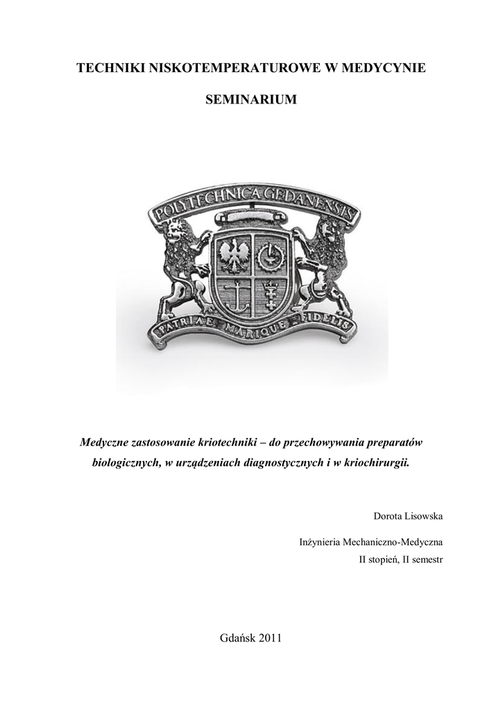 TECHNIKI NISKOTEMPERATUROWE W MEDYCYNIE SEMINARIUM