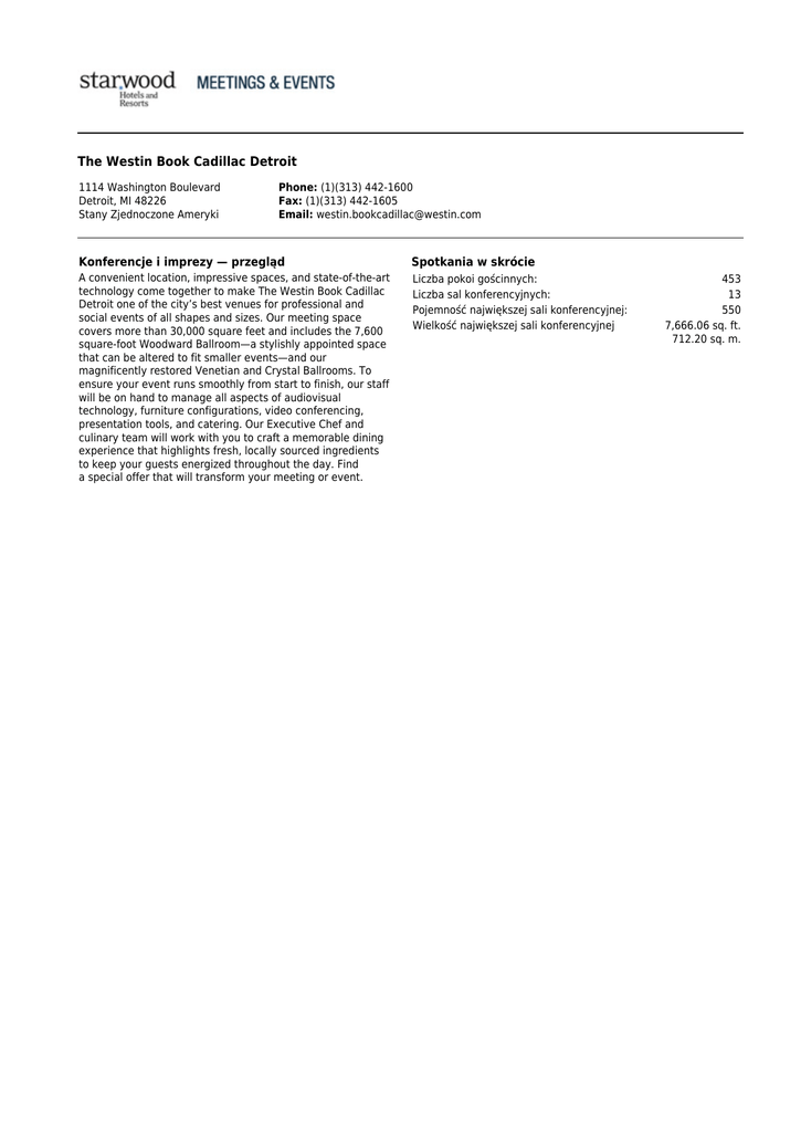 The Westin Book Cadillac Detroit 1114 Washington Boulevard Detroit, MI 48226 Stany Zjednoczone Ameryki Phone: (1)(313) 442-1600 Fax: (1)(313) 442-1605 Email: [email protected] Konferencje i imprezy — przegląd Spotkania w skrócie A convenient location, impressive spaces, and state-of-the-art technology come together to make The Westin Book Cadillac Detroit one of the city’s best venues for professional and social events of all shapes and sizes. Our meeting space covers more than 30,000 square feet and includes the 7,600 square-foot Woodward Ballroom—a stylishly appointed space that can be altered to fit smaller events—and our magnificently restored Venetian and Crystal Ballrooms. To ensure your event runs smoothly from start to finish, our staff will be on hand to manage all aspects of audiovisual technology, furniture configurations, video conferencing, presentation tools, and catering. Our Executive Chef and culinary team will work with you to craft a memorable dining experience that highlights fresh, locally sourced ingredients to keep your guests energized throughout the day. Find a special offer that will transform your meeting or event. Liczba pokoi gościnnych: Liczba sal konferencyjnych: Pojemność największej sali konferencyjnej: Wielkość największej sali konferencyjnej 453 13 550 7,666.06 sq. ft. 712.20 sq. m. The Westin Book Cadillac Detroit 1114 Washington Boulevard Detroit, MI 48226 Stany Zjednoczone Ameryki Phone: (1)(313) 442-1600 Fax: (1)(313) 442-1605 Email: [email protected] Specyfikacja szczegółowa Nieruchomości Typ obiektu Urban Liczba sal konferencyjnych 13 Rok budowy 1924 Całkowita wielkość sal konferencyjnych 3,087.54 sq. m. 33,234.00 sq. ft. Liczba budynków 1 Wielkość największej sali konferencyjnej 712.20 sq. m. 7,666.06 sq. ft. Liczba pięter 23 Pojemność największej sali konferencyjnej 550 Pojemność najmniejszej sali konferencyjnej 38.28 sq. m. Pojemność najmniejszej sali konferencyjnej 20 412.04 sq. ft. Pokoje gościnne Data zameldowania 3:00 PM Internet w pokoju Bezprzewodowy szybki dostęp do Internetu Bezprzewodowy szybki dostęp do Internetu Data wymeldowania 12:00 PM Liczba pokoi gościnnych 453 Udogodnienia Centrum odnowy biologicznej / WestinWORKOUT® Fitness Studio Basen Yes Centrum Fitness Whirlpool Heated Indoor Pool Nazwa basenu Spa Program wypożyczania sprzętu WestinWORKOUT® Udogodnienia odnowy biologicznej / medyczne Lokalne & atrakcje Strefa czasowa E Pobliskie lotniska Kod lotniska DTW Odległość od lotniska Detroit Metropolitan Wayne County Airport 27.36 Kilometers 17.00 Miles Situated in the heart of the Motor City, The Westin Book Cadillac Detroit gives guests a unique vantage point from which to experience the thriving, diverse culture of one of the oldest cities in the Midwest. Obszar lokalny Take a stroll through the enchanting green landscape of Campus Martius Park, just a short walk away, or look across the Detroit River to Canada’s nearby shores from the Detroit Riverwalk’s promenade. Restaurants like Red Smoke Barbecue, Roma Cafe, and Mosaic represent the city's multicultural heritage, while Cliff Bell’s delights music and food lovers alike as one of the region’s most authentic jazz clubs. Discover the thrills of Vegas-style gaming in three upscale casinos, the MGM Grand, Motor City Casino, and Greektown Casino, or catch a Tigers game at Comerica Park. The North American International Auto Show at the Cobo Center is a must-see for those traveling to Detroit in January. Or, take in a concert at Orchestra Hall, home of the world-famous Detroit Symphony Orchestra. The Charles H. Wright Museum of African American History is just a 10 minute cab ride from the hotel, while, just outside the city, The Henry Ford Museum exhibits one of the largest collections of Americana in the country. Transport & parkowanie Opłaty za parkowanie Available at the Washington Boulevard entrance, our 24-hour valet service is available for 30 USD for registered guests. Environmental Practices Energy & Water Conservation: • High-efficiency lighting in guest rooms • High-efficiency lighting in public areas • Water conserving fixtures • Regular preventive maintenance • Make A Green Choice program rewards guests for choosing to conserve natural resources in their guest room. Waste Minimization & Environmentally Responsible Purchasing: • Recycling • Dumpster monitoring • Elimination of styrofoam packaging • Environmentally preferred suppliers • Environmentally preferred products • Amenity management • Alternatives to plastic bottled water • Sustainable food and beverage options Enhanced Indoor Environmental Quality: • Green Housekeeping • Integrated pest management practices • Low-emitting materials, such as paints, flooring and furniture Raising Awareness: • Property-level Green Council • Sustainable Meetings Practices • Carbon-offset program Opłaty & podatki Waluta lokalna United States Dollars Kod waluty USD Metody płatności • CARTE BLANCHE • DINERS/SUNDIN/AMOCO • DISCOVER NETWORK • AMEX / OPTIMA • MASTER CARD • VISA The Westin Book Cadillac Detroit 1114 Washington Boulevard Detroit, MI 48226 Stany Zjednoczone Ameryki Phone: (1)(313) 442-1600 Fax: (1)(313) 442-1605 Email: [email protected] Capacity Charts Room Name Key Dim. (l x w) Area Height Banq. Thtr. Book Boardroom - 8.53 m. x 4.57 m.27.99 ft. x 14.99 ft. 38.65 sq. m. 416.03 sq. ft. 2.74 m. 8.99 ft. 20 20 Boulevard A - 12.19 m. x 8.23 m.39.99 ft. x 27.00 ft. 92.07 sq. m. 991.03 sq. ft. 2.74 m. 8.99 ft. 50 50 Crystal Ballroom - 12.19 m. x 22.25 m.39.99 ft. x 73.00 ft. 240.62 sq. m. 2,590.01 sq. ft. 3.35 m. 10.99 ft. 150 225 Esquire Room - 8.23 m. x 11.28 m.27.00 ft. x 37.01 ft. 87.89 sq. m. 946.04 sq. ft. 2.74 m. 8.99 ft. 50 50 Founders AB - 21.95 m. x 11.58 m.72.01 ft. x 37.99 ft. 220.66 sq. m. 2,375.16 sq. ft. 2.74 m. 8.99 ft. 150 180 Founders Room A - 11.58 m. x 12.50 m.37.99 ft. x 41.01 ft. 136.47 sq. m. 1,468.