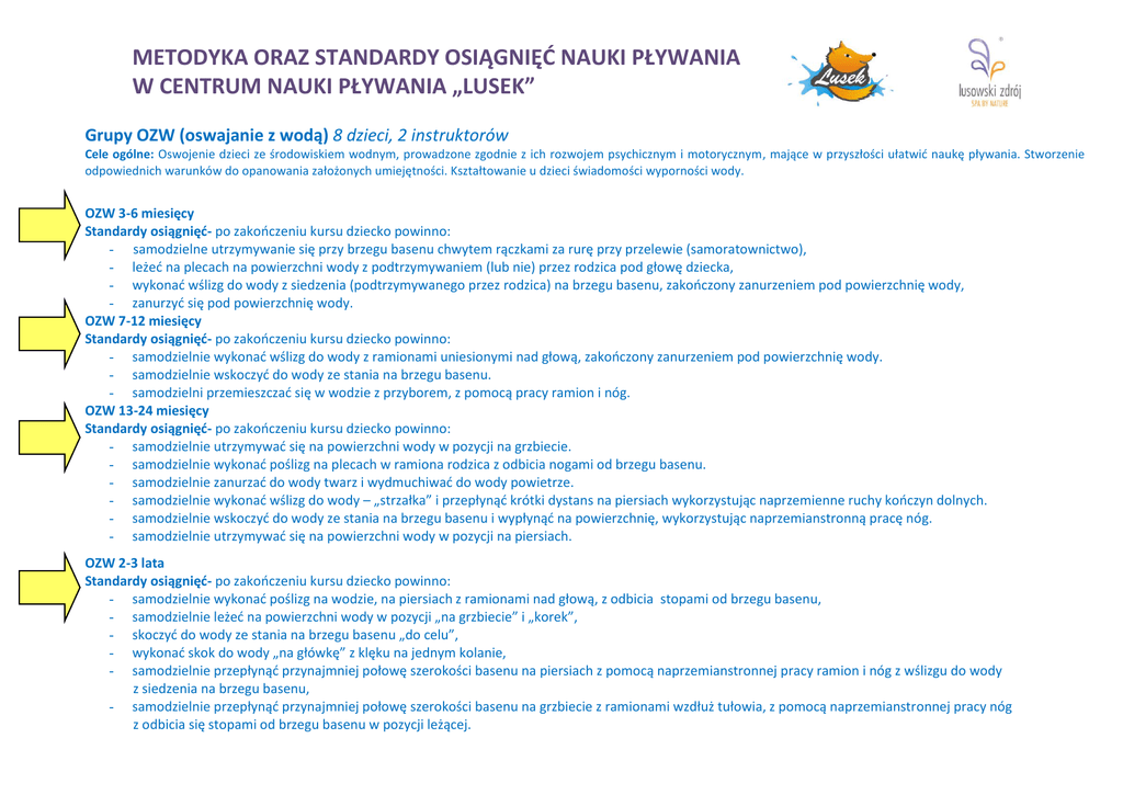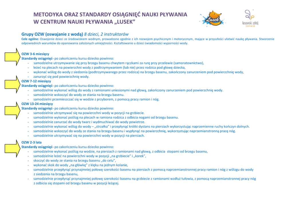 METODYKA ORAZ STANDARDY OSIĄGNIĘĆ NAUKI PŁYWANIA W CENTRUM NAUKI PŁYWANIA „LUSEK” Grupy OZW (oswajanie z wodą) 8 dzieci, 2 instruktorów Cele ogólne: Oswojenie dzieci ze środowiskiem wodnym, prowadzone zgodnie z ich rozwojem psychicznym i motorycznym, mające w przyszłości ułatwić naukę pływania. Stworzenie odpowiednich warunków do opanowania założonych umiejętności. Kształtowanie u dzieci świadomości wyporności wody. OZW 3-6 miesięcy Standardy osiągnięć- po zakończeniu kursu dziecko powinno: - samodzielne utrzymywanie się przy brzegu basenu chwytem rączkami za rurę przy przelewie (samoratownictwo), - leżeć na plecach na powierzchni wody z podtrzymywaniem (lub nie) przez rodzica pod głowę dziecka, - wykonać wślizg do wody z siedzenia (podtrzymywanego przez rodzica) na brzegu basenu, zakończony zanurzeniem pod powierzchnię wody, - zanurzyć się pod powierzchnię wody. OZW 7-12 miesięcy Standardy osiągnięć- po zakończeniu kursu dziecko powinno: - samodzielnie wykonać wślizg do wody z ramionami uniesionymi nad głową, zakończony zanurzeniem pod powierzchnię wody. - samodzielnie wskoczyć do wody ze stania na brzegu basenu. - samodzielni przemieszczać się w wodzie z przyborem, z pomocą pracy ramion i nóg. OZW 13-24 miesięcy Standardy osiągnięć- po zakończeniu kursu dziecko powinno: - samodzielnie utrzymywać się na powierzchni wody w pozycji na grzbiecie. - samodzielnie wykonać poślizg na plecach w ramiona rodzica z odbicia nogami od brzegu basenu. - samodzielnie zanurzać do wody twarz i wydmuchiwać do wody powietrze. - samodzielnie wykonać wślizg do wody – „strzałka” i przepłynąć krótki dystans na piersiach wykorzystując naprzemienne ruchy kończyn dolnych. - samodzielnie wskoczyć do wody ze stania na brzegu basenu i wypłynąć na powierzchnię, wykorzystując naprzemianstronną pracę nóg. - samodzielnie utrzymywać się na powierzchni wody w pozycji na piersiach. OZW 2-3 lata Standardy osiągnięć- po zakończeniu kursu dziecko powinno: - samodzielnie wykonać poślizg na wodzie, na piersiach z ramionami nad głową, z odbicia stopami od brzegu basenu, - samodzielnie leżeć na powierzchni wody w pozycji „na grzbiecie” i „korek”, - skoczyć do wody ze stania na brzegu basenu „do celu”, - wykonać skok do wody „na główkę” z klęku na jednym kolanie, - samodzielnie przepłynąć przynajmniej połowę szerokości basenu na piersiach z pomocą naprzemianstronnej pracy ramion i nóg z wślizgu do wody z siedzenia na brzegu basenu, - samodzielnie przepłynąć przynajmniej połowę szerokości basenu na grzbiecie z ramionami wzdłuż tułowia, z pomocą naprzemianstronnej pracy nóg z odbicia się stopami od brzegu basenu w pozycji leżącej. Grupy NP (nauka pływania) 10 uczestników, 2 instruktorów Cele ogólne- Kolejne (po OSWAJANIU Z WODĄ) etapy nauki pływania elementarnego dzieci - prowadzone zgodnie z ich rozwojem psychicznym i motorycznym, mające w przyszłości ułatwić naukę sportowych technik pływania. Kurs odbywa się bez obecności na basenie rodziców. Dzieci zostają na basenie z dwoma instruktorami. O przydzieleniu dziecka do odpowiedniej grupy decydują: grupy początkujące „p”: wiek oraz to, że dziecko nie uczestniczyło wcześniej w kursie nauki pływania, grupy zaawansowane „z” – wiek, umiejętności pływackie potwierdzone zaleceniem instruktora prowadzącego zajęcia, raportem (dla dzieci uczących się już w Lusowskim Zdroju), lub sprawdzianem przeprowadzanym we wcześniej umówionym terminie (w przypadku nowych klientów). Grupa NP 4-5 lat „p”, OZW/NP. 3-4 lata Standardy osiągnięć- po ukończeniu kursu dziecko powinno: - samodzielnie skoczyć do wody ze stania na brzegu basenu i samodzielnie wrócić, - przepłynąć pod powierzchnią wody na piersiach, z ramionami nad głową przynajmniej połowę szerokości basenu, - samodzielnie (ewentualnie z niewielką pomocą instruktora) przepłynąć sposobem elementarnym na piersiach długość basenu, - samodzielnie (ewentualnie z niewielką pomocą instruktora) przepłynąć sposobem elementarnym na grzbiecie długość basenu, - z pomocą wyławiać z dna basenu przedmioty. Grupa NP 5-6 lat „p” Standardy osiągnięć- po ukończeniu kursu dziecko powinno: - zaprezentować podstawową technikę pływania kraulem na grzbiecie, - przepłynąć z przyborem długość basenu na piersiach, tzw. „dokładanką”, - przepłynąć pod powierzchnią wody szerokość basenu z ramionami wyprostowanymi nad głową i z pomocą naprzemianstronnej pracy nóg, - wykonać samodzielny skok do wody na głowę ze stania na brzegu basenu, - samodzielnie wyławiać przedmioty z dna basenu. Grupa NP 6-7 lat „p” Standardy osiągnięć- po ukończeniu kursu dziecko powinno: - zaprezentować prawidłową technikę pływania kraulem na piersiach i na grzbiecie, - wykonać samodzielny skok do wody na głowę ze stania na brzegu basenu, - przepłynąć samodzielnie długość basenu przy pomocy pracy nóg do delfina, z ramionami nad głową, - nurkować w dal – ok. 5m, w głąb ok. 1,3m. Grupa NP 4-5 lat „z” Standardy osiągnięć- po ukończeniu kursu dziecko powinno: - zaprezentować podstawową technikę pływania kraulem na grzbiecie, przepływając samodzielnie w ten sposób szerokość basenu, - przepłynąć z przyborem długość basenu na piersiach i na grzbiecie, - przepłynąć pod powierzchnią wody szerokość basenu z ramionami wyprostowanymi nad głową i z pomocą naprzemianstronnej pracy nóg, - wykonać samodzielny skok do wody na głowę ze stania na brzegu basenu, - samodzielnie wyławiać przedmioty z dna basenu. Grupa NP 5-6 lat „z” Standardy osiągnięć- po ukończeniu kursu dziecko powinno: - zaprezentować prawidłową technikę pływania kraulem na piersiach, przepływając samodzielnie w ten sposób długość basenu, - zaprezentować prawidłową technikę pływania kraulem na 