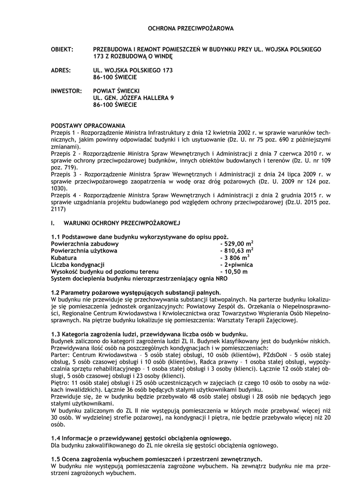 OCHRONA PRZECIWPOŻAROWA OBIEKT: PRZEBUDOWA I REMONT POMIESZCZEŃ W BUDYNKU PRZY UL. WOJSKA POLSKIEGO 173 Z ROZBUDOWĄ O WINDĘ ADRES: UL. WOJSKA POLSKIEGO 173 86-100 ŚWIECIE INWESTOR: POWIAT ŚWIECKI UL. GEN. JÓZEFA HALLERA 9 86-100 ŚWIECIE PODSTAWY OPRACOWANIA Przepis 1 - Rozporządzenie Ministra Infrastruktury z dnia 12 kwietnia 2002 r. w sprawie warunków technicznych, jakim powinny odpowiadać budynki i ich usytuowanie (Dz. U. nr 75 poz. 690 z późniejszymi zmianami). Przepis 2 - Rozporządzenie Ministra Spraw Wewnętrznych i Administracji z dnia 7 czerwca 2010 r. w sprawie ochrony przeciwpożarowej budynków, innych obiektów budowlanych i terenów (Dz. U. nr 109 poz. 719). Przepis 3 - Rozporządzenie Ministra Spraw Wewnętrznych i Administracji z dnia 24 lipca 2009 r. w sprawie przeciwpożarowego zaopatrzenia w wodę oraz dróg pożarowych (Dz. U. 2009 nr 124 poz. 1030). Przepis 4 - Rozporządzenie Ministra Spraw Wewnętrznych i Administracji z dnia 2 grudnia 2015 r. w sprawie uzgadniania projektu budowlanego pod względem ochrony przeciwpożarowej (Dz.U. 2015 poz. 2117) I. WARUNKI OCHRONY PRZECIWPOŻAROWEJ 1.1 Podstawowe dane budynku wykorzystywane do opisu ppoż. Powierzchnia zabudowy - 529,00 m2 Powierzchnia użytkowa - 810,63 m2 Kubatura - 3 806 m3 Liczba kondygnacji - 2+piwnica Wysokość budynku od poziomu terenu - 10,50 m System docieplenia budynku nierozprzestrzeniający ognia NRO 1.2 Parametry pożarowe występujących substancji palnych. W budynku nie przewiduje się przechowywania substancji łatwopalnych. Na parterze budynku lokalizuje się pomieszczenia jednostek organizacyjnych: Powiatowy Zespół ds. Orzekania o Niepełnosprawności, Regionalne Centrum Krwiodawstwa i Krwiolecznictwa oraz Towarzystwo Wspierania Osób Niepełnosprawnych. Na piętrze budynku lokalizuje się pomieszczenia: Warsztaty Terapii Zajęciowej. 1.3 Kategoria zagrożenia ludzi, przewidywana liczba osób w budynku. Budynek zaliczono do kategorii zagrożenia ludzi ZL II. Budynek klasyfikowany jest do budynków niskich. Przewidywana ilość osób na poszczególnych kondygnacjach i w pomieszczeniach: Parter: Centrum Krwiodawstwa – 5 osób stałej obsługi, 10 osób (klientów), PZdsOoN – 5 osób stałej obsług, 5 osób czasowej obsługi i 10 osób (klientów), Radca prawny – 1 osoba stałej obsługi, wypożyczalnia sprzętu rehabilitacyjnego – 1 osoba stałej obsługi i 3 osoby (klienci). Łącznie 12 osób stałej obsługi, 5 osób czasowej obsługi i 23 osoby (klienci). Piętro: 11 osób stałej obsługi i 25 osób uczestniczących w zajęciach (z czego 10 osób to osoby na wózkach inwalidzkich). Łącznie 36 osób będących stałymi użytkownikami budynku. Przewiduje się, że w budynku będzie przebywało 48 osób stałej obsługi i 28 osób nie będących jego stałymi użytkownikami. W budynku zaliczonym do ZL II nie występują pomieszczenia w których może przebywać więcej niż 30 osób. W wydzielnej strefie pożarowej, na kondygnacji I piętra, nie będzie przebywało więcej niż 20 osób. 1.4 Informacje o przewidywanej gęstości obciążenia ogniowego. Dla budynku zakwalifikowanego do ZL nie określa się gęstości obciążenia ogniowego. 1.5 Ocena zagrożenia wybuchem pomieszczeń i przestrzeni zewnętrznych. W budynku nie występują pomieszczenia zagrożone wybuchem. Na zewnątrz budynku nie ma przestrzeni zagrożonych wybuchem. 1.6 Informacje o klasie odporności pożarowej oraz klasie odporności ogniowej i stopniu rozprzestrzeniania ognia elementów budowlanych. 1.6.1 Klasa odporności pożarowej: 1.6.1.1 Dla budynku wymagana jest klasa „C” odporności pożarowej. Powierzchnia strefy 810,63 m2. Dopuszczalna wielkość strefy pożarowej 5 000 m2. Dla tej klasy odporności pożarowej, klasy odporności ogniowej elementów budynku są następujące: • główna konstrukcja nośna (ściany, słupy, podciągi): 60 minut (R 60); • konstrukcja dachu: 15 minut (R15); • stropy: 60 minut (REI 60); • ściana zewnętrzna: 30 minut (EI 30); • ściany wewnętrzne: 15 minut (EI15); • przekrycie dachu: 15 minut (RE15); • Elementy powinny posiadać cechę nierozprzestrzeniających ognia (główna konstrukcja nośna i stropy) oraz słabo rozprzestrzeniające ogień (ścianki działowe). Główną konstrukcję nośną stanowią ściany zewnętrzne i wewnętrzne z cegły ceramicznej pełnej o gr. powyżej 25cm. Klasa odporności ogniowej elementów powyżej R 60. Konstrukcję dachu stanowią: w części dach konstrukcji drewnianej ocieplony od zewnątrz i pokryty papą - klasa odporności pożarowej R15, w części stropodach żelbetowy ocieplony od zewnątrz i pokryty papą asfaltową - klasa odporności pożarowej powyżej R60. Ściany wewnętrzne z cegły ceramicznej pełnej gr. minimum 25 cm. Ścianki działowe z cegły ceramicznej pełnej gr. 12 cm. Klasa odporności pożarowej EI15. Przekrycie dachu z papy asfaltowej ICOPAL Firesmart Duo-Baza i Duo-Top. Klasa odporności pożarowej RE15. Stropy: w części stropy żelbetowe, prefabrykowane, gęstożebrowe – klasa odporności pożarowej powyżej REI60, w części stropy na belkach drewnianych. Klasa odporności ogniowej elementów REI 60. Wszystkie z wymienionych elementów są nierozprzestrzeniające ognia. Zabrania się stosowania w budynku do wykończenia wnętrz materiałów łatwo zapalnych, których produkty rozkładu termicznego są bardzo toksyczne lub intensywnie dymiące. Wykładziny podłogowe, okładziny ścienne na drogach ewakuacyjnych powinny być co najmniej trudno zapalne zaś okładziny sufitowe (sufity podwieszone) – niezapalne, nie kapiące i nie odpadające pod wpływem ognia. 1.7 Podział budynku na strefy pożarowe oraz strefy dymowe. Budynek zaprojektowano jako dwie strefy pożarowe. Wydzieloną strefę pożarową na parterze stanowi część budynku przeznaczona na RCKiK, na piętrze pom. nr 2.23-2.26. Pomiędzy strefami zaprojektowano ścianę oddzielenia pożarowego o klasie odpor