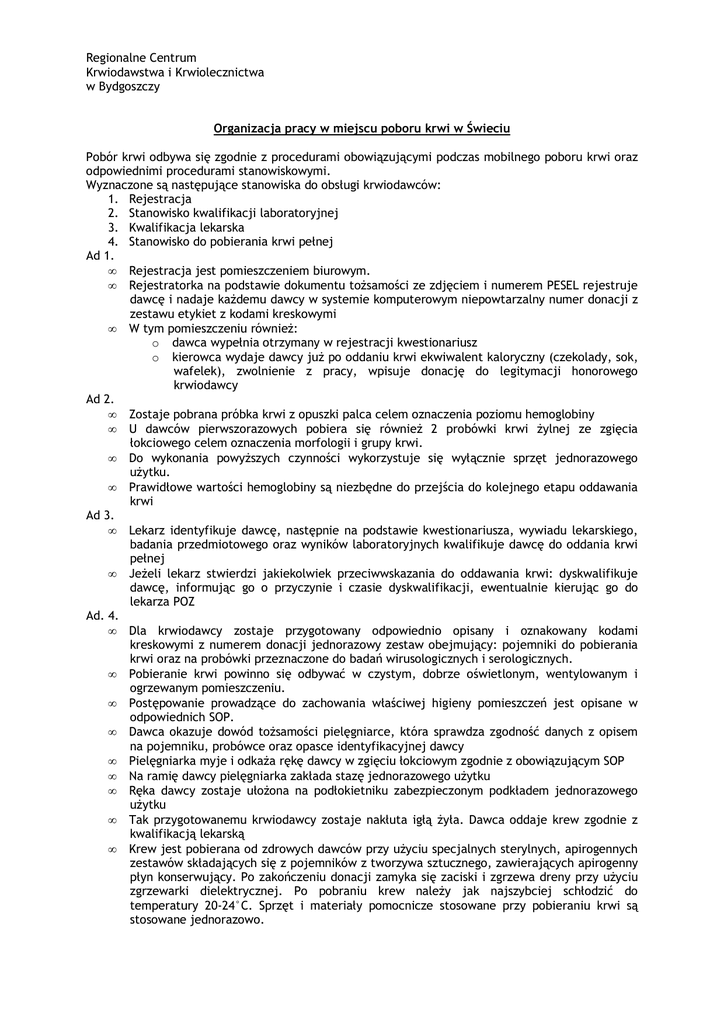 Regionalne Centrum Krwiodawstwa i Krwiolecznictwa w Bydgoszczy Organizacja pracy w miejscu poboru krwi w Świeciu Pobór krwi odbywa się zgodnie z procedurami obowiązującymi podczas mobilnego poboru krwi oraz odpowiednimi procedurami stanowiskowymi. Wyznaczone są następujące stanowiska do obsługi krwiodawców: 1. Rejestracja 2. Stanowisko kwalifikacji laboratoryjnej 3. Kwalifikacja lekarska 4. Stanowisko do pobierania krwi pełnej Ad 1. • Rejestracja jest pomieszczeniem biurowym. • Rejestratorka na podstawie dokumentu tożsamości ze zdjęciem i numerem PESEL rejestruje dawcę i nadaje każdemu dawcy w systemie komputerowym niepowtarzalny numer donacji z zestawu etykiet z kodami kreskowymi • W tym pomieszczeniu również: o dawca wypełnia otrzymany w rejestracji kwestionariusz o kierowca wydaje dawcy już po oddaniu krwi ekwiwalent kaloryczny (czekolady, sok, wafelek), zwolnienie z pracy, wpisuje donację do legitymacji honorowego krwiodawcy Ad 2. • Zostaje pobrana próbka krwi z opuszki palca celem oznaczenia poziomu hemoglobiny • U dawców pierwszorazowych pobiera się również 2 probówki krwi żylnej ze zgięcia łokciowego celem oznaczenia morfologii i grupy krwi. • Do wykonania powyższych czynności wykorzystuje się wyłącznie sprzęt jednorazowego użytku. • Prawidłowe wartości hemoglobiny są niezbędne do przejścia do kolejnego etapu oddawania krwi Ad 3. • Lekarz identyfikuje dawcę, następnie na podstawie kwestionariusza, wywiadu lekarskiego, badania przedmiotowego oraz wyników laboratoryjnych kwalifikuje dawcę do oddania krwi pełnej • Jeżeli lekarz stwierdzi jakiekolwiek przeciwwskazania do oddawania krwi: dyskwalifikuje dawcę, informując go o przyczynie i czasie dyskwalifikacji, ewentualnie kierując go do lekarza POZ Ad. 4. • Dla krwiodawcy zostaje przygotowany odpowiednio opisany i oznakowany kodami kreskowymi z numerem donacji jednorazowy zestaw obejmujący: pojemniki do pobierania krwi oraz na probówki przeznaczone do badań wirusologicznych i serologicznych. • Pobieranie krwi powinno się odbywać w czystym, dobrze oświetlonym, wentylowanym i ogrzewanym pomieszczeniu. • Postępowanie prowadzące do zachowania właściwej higieny pomieszczeń jest opisane w odpowiednich SOP. • Dawca okazuje dowód tożsamości pielęgniarce, która sprawdza zgodność danych z opisem na pojemniku, probówce oraz opasce identyfikacyjnej dawcy • Pielęgniarka myje i odkaża rękę dawcy w zgięciu łokciowym zgodnie z obowiązującym SOP • Na ramię dawcy pielęgniarka zakłada stazę jednorazowego użytku • Ręka dawcy zostaje ułożona na podłokietniku zabezpieczonym podkładem jednorazowego użytku • Tak przygotowanemu krwiodawcy zostaje nakłuta igłą żyła. Dawca oddaje krew zgodnie z kwalifikacją lekarską • Krew jest pobierana od zdrowych dawców przy użyciu specjalnych sterylnych, apirogennych zestawów składających się z pojemników z tworzywa sztucznego, zawierających apirogenny płyn konserwujący. Po zakończeniu donacji zamyka się zaciski i zgrzewa dreny przy użyciu zgrzewarki dielektrycznej. Po pobraniu krew należy jak najszybciej schłodzić do temperatury 20-24°C. Sprzęt i materiały pomocnicze stosowane przy pobieraniu krwi są stosowane jednorazowo. • Po oddaniu dawca jeszcze przez 15 minut odpoczywa pod kontrolą personelu, następnie wraca do pomieszczenia rejestracji po odbiór ekwiwalentu żywieniowego i ew. zwolnienia z pracy. Transport krwi: Zasady dotyczące transportu materiału do badań oraz pojemników z krwią są zwalidowane i opisane w odpowiednich SOP. Transport krwi odbywa się specjalistycznymi pojazdami do RCKiK w Bydgoszczy wyłącznie przez upoważnione do tego osoby. Pobrana krew transportowana jest w odpowiednich warunkach, w specjalistycznych lodówkach transportowych. Segregacja odpadów - Odpady komunalne są gromadzone w workach koloru mlecznego. - Odpady medyczne zakaźne są gromadzone w workach koloru czerwonego. - Odpady medyczne ostre gromadzone są w jednorazowych pojemnikach. Każdy pojemnik i worek z odpadami medycznymi musi posiadać widoczne oznakowanie świadczące o miejscu pochodzenia odpadów, datę zamknięcia, podpis osoby zamykającej pojemnik lub worek. Worki z odpadami bezpośrednio po ekipie przenoszone są do magazynów zbierania odpadów. Regionalne Centrum Krwiodawstwa i Krwiolecznictwa ma podpisaną umowę na odbiór, transport oraz utylizację odpadów medycznych z Centrum Onkologii – Zakład Utylizacji Odpadów Medycznych. Odpady odbierane są po zakończeniu poboru.