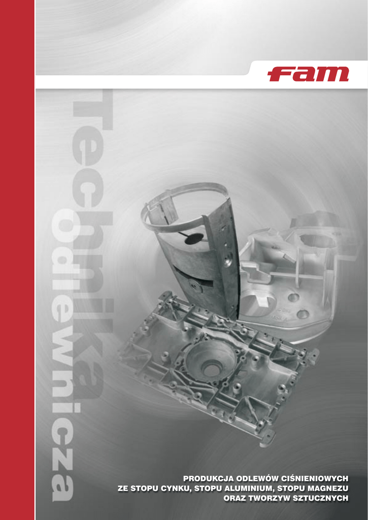 PRODUKCJA ODLEWÓW CIŚNIENIOWYCH ZE STOPU CYNKU, STOPU ALUMINIUM, STOPU MAGNEZU ORAZ TWORZYW SZTUCZNYCH Fam – Technika Odlewnicza, jest nowoczesnym producentem odlewów ciśnieniowych ze stopu cynku, stopu aluminium, stopu magnezu oraz tworzyw sztucznych. Spółka jest jednym z najbardziej liczących się w Polsce i uznanych na świecie producentów i dostawców akcesoriów budowlanych oraz meblowych. Obecnie produkujemy ponad 1000 różnego rodzaju wyrobów. Co roku Spółka wprowadza na rynek kilkadziesiąt nowych wyrobów oraz systematycznie modernizuje wyroby dotychczas produkowane. Coraz większy udział w produkcji stanowią usługi odlewnicze, tj. wykonawstwo detali, dostosowanych do indywidualnych potrzeb Klienta. Oferta FAM dedykowana jest dla branż: budowlanej, meblowej, motoryzacyjnej, elektronarzędziowej, AGD i innych branż. Od kilku lat Spółka z sukcesem rozwija sprzedaż eksportową na rynki międzynarodowe, sukcesywnie zwiększając eksport głównie do krajów Europy Zachodniej. Produkty FAM są tam doceniane za najwyższą jakość i konkurencyjność cenową. Unikalne umiejętności technologiczne FAM wypływają z wieloletniego doświadczenia na rynku oraz możliwości produkcyjne, które pozwalają na spełnienie najwyższych standardów jakościowych popartych certyfikatem TUV Management Service GmbH ISO 9001:2000. Przedsiębiorstwo w procesie produkcji stosuje cztery podstawowe technologie obróbki materiału oraz dwie metody nakładania powłok galwanicznych. Na Wydziale Odlewni Stopów Cynku stosowana jest technologia ciśnieniowego odlewania metali oraz wstępna ich obróbka. Na wtryskarkach o sile zwarcia 20-260 ton maszyn gorącokomorowych m. innymi firmy FRIEDRICH-PFUDERER i FRECH produkowane są odlewy ze stopu cynku dla przemysłu motoryzacyjnego, budowlanego, meblowego, elektrotechnicznego itp. Posiadany park maszynowy (DAW-20, DMZ-50, DAW-50, DMZ-80, DAW-125RC, DMM-B-260T, Castmatic Z-180 – łącznie 15 maszyn odlewniczych) pozwala na pełną kontrolę przebiegu procesu produkcyjnego. Większość produkowanych odlewów skierowana jest na rynki zagraniczne. FAM posiada również wtryskarki do tworzyw sztucznych, które pozwalają na produkcję wyrobów z różnego rodzaju tworzyw oraz produkcję wyrobów z cynkiem i magnezem. Na Wydziale Odlewni Stopów Metali Lekkich produkowane są bardzo skomplikowane detale ze stopów magnezu i aluminium z przeznaczeniem dla branży: budowlanej, meblowej, motoryzacyjnej, elekronarzędziowej itp. Wydział wyposażony jest w 5 maszyn gorącokomorowych do odlewnia stopów magnezu renomowanej firmy FRECH, o sile zwarcia 315 ton oraz jednej maszyny firmy FRIEDRICHPFUDERER o sile zwarcia 340 ton. Dwie maszyny stanowią tzw. celę odlewniczą, składającą się z robota odbierającego detale z formy, tunelu chłodzącego i urządzenia spryskującego, co pozwala na pełną automatyzację procesu. Na maszynach tego typu można odlewać bardzo skomplikowane detale, przy odpowiedniej konstrukcji formy – od 30 gram do 1500 gram. Wydział odlewni wyposażony jest także w maszynę firmy Buhler 66 do odlewania stopów aluminium w technologii zimnokomorowej. Maszyna ta również stanowi tzw. celę odlewniczą wyposażoną w piec, urządzenie zalewowe, robot odbierający i tunel chłodzący. Używane do produkcji siluminy (stopy aluminium z krzemem) mają nadzwyczaj dobrą lejność i obrabialność pozwalającą na odlewanie elementów o bardzo skomplikowanych kształtach. Na maszynie tego typu można odlewać detale o masie od 350 gram do 3500 gram. Wydział wyposażony jest także w dwie prasy hydrauliczne o mocy 160 ton, przeznaczonych do odcinania układów wlewowych, a także urządzenia do wiercenia i gwintowania otworów jak również oddział szlifierek do usuwania śladów podziału i przygotowujące detale pod powłoki. Produkcja wyrobów z magnezu i aluminium jest obecnie głównym kierunkiem rozszerzenia profilu działalności FAM. Wydział Obróbki Skrawaniem i Obróbki Plastycznej specjalizuje się w: • obróbce wiórowej (toczenie wzdłużne) drobnych detali na automatach tokarskich INDEX RN-8, INDEX RN-12, ATS – materiałem wyjściowym są pręty i druty stalowe o maksymalnej średnicy 8 mm. • obróbce plastycznej wyrobów stalowych poprzez technologię tłoczenia i kucia na zimno, Na Wydziale Powłok i Obróbki Powierzchni wytwarzane we wcześniejszych fazach elementy poddawane są obróbce wykończeniowej, polegającej na przygotowaniu powierzchni detali pod powłoki galwaniczne i lakiernicze. Stosowana jest obróbka szlifiersko-polerska lub wibrościerna. Urządzenia wibracyjne; ROSLER R-420, ROSLER R-620, ROSLER R-780, ROSLER R-1050, szlifierki tarczowe oraz polerki. Wydział ten posiada trzy linie galwaniczne: • linia bębnowa do nakładania powłoki cynkowej, • linia zawieszkowa, • linia bębnowa do nakładania powłoki niklowej. Przedsiębiorstwo ma wieloletnie doświadczenie w zakresie nakładania powłok galwanicznych najwyższej jakości. Właściwości techniczne wykonywanych przez FAM powłok są systematycznie kontrolowane. Prowadzone są pomiary ich grubości, a także odporności korozyjnej w komorze solnej. Proces przygotowywania powierzchni do galwanizacji dostosowany jest zawsze do potrzeb konkretnych produktów. W laboratorium chemicznym, wyposażonym w specjalistyczną aparaturę kontrolno-pomiarową, stale monitorowany jest skład chemiczny powłok galwanicznych i na bieżąco udoskonalone są technologie. W procesach produkcyjnych wykorzystywana jest technologia uznanych na świecie firm galwanotechnicznych tj.: Enthone, Dr Hesse, Schloetter, Atotech, dzięki czemu FAM ma możliwość pełnego przetestowania w skali mikro wszelkich nowości oferowanych na rynku powłok galwanicznych. Oferta Fam – Technika Odlewnicza obejmuje: pokrywanie wyrobów znalowych, stalowych i mosiężnych, powłokami galwanicznymi i malarskimi. Oferujemy następujące wykończenia galwaniczne: 
