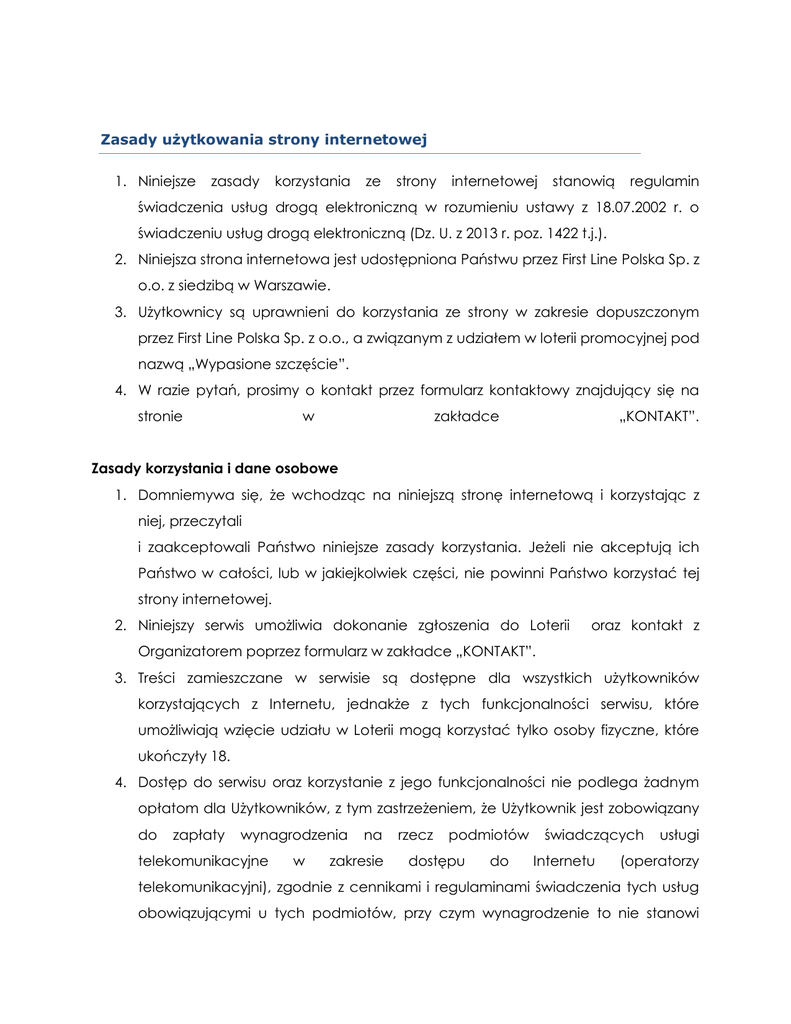 Zasady użytkowania strony internetowej 1. Niniejsze zasady korzystania ze strony internetowej stanowią regulamin świadczenia usług drogą elektroniczną w rozumieniu ustawy z 18.07.2002 r. o świadczeniu usług drogą elektroniczną (Dz. U. z 2013 r. poz. 1422 t.j.). 2. Niniejsza strona internetowa jest udostępniona Państwu przez First Line Polska Sp. z o.o. z siedzibą w Warszawie. 3. Użytkownicy są uprawnieni do korzystania ze strony w zakresie dopuszczonym przez First Line Polska Sp. z o.o., a związanym z udziałem w loterii promocyjnej pod nazwą „Wypasione szczęście”. 4. W razie pytań, prosimy o kontakt przez formularz kontaktowy znajdujący się na stronie w zakładce „KONTAKT”. Zasady korzystania i dane osobowe 1. Domniemywa się, że wchodząc na niniejszą stronę internetową i korzystając z niej, przeczytali i zaakceptowali Państwo niniejsze zasady korzystania. Jeżeli nie akceptują ich Państwo w całości, lub w jakiejkolwiek części, nie powinni Państwo korzystać tej strony internetowej. 2. Niniejszy serwis umożliwia dokonanie zgłoszenia do Loterii oraz kontakt z Organizatorem poprzez formularz w zakładce „KONTAKT”. 3. Treści zamieszczane w serwisie są dostępne dla wszystkich użytkowników korzystających z Internetu, jednakże z tych funkcjonalności serwisu, które umożliwiają wzięcie udziału w Loterii mogą korzystać tylko osoby fizyczne, które ukończyły 18. 4. Dostęp do serwisu oraz korzystanie z jego funkcjonalności nie podlega żadnym opłatom dla Użytkowników, z tym zastrzeżeniem, że Użytkownik jest zobowiązany do zapłaty wynagrodzenia telekomunikacyjne w na zakresie rzecz podmiotów dostępu do świadczących Internetu usługi (operatorzy telekomunikacyjni), zgodnie z cennikami i regulaminami świadczenia tych usług obowiązującymi u tych podmiotów, przy czym wynagrodzenie to nie stanowi wynagrodzenia za korzystanie z Serwisu. Warunkiem uzyskania dostępu do funkcjonalności Serwisu jest skorzystanie z urządzenia komunikującego się z Internetem i wyposażonego w powszechnie używaną przeglądarkę internetową. 5. Zasady przetwarzania danych osobowych opisane są w Polityce Prywatności, z którą osoba zainteresowana skorzystaniem z funkcjonalności strony internetowej powinna się zapoznać. Polityka dostępna jest na stronie internetowej www.wypasionaloteria.pl. 6. Szczegółowe zasady Loterii, określone są w regulaminie Loterii dostępnym na stronie internetowej, z którym Użytkownik biorący udział w Loterii jest zobowiązany się zapoznać. Obowiązki Użytkowników 1. Wszelkie działania podejmowane przez Użytkowników w ramach serwisu, a także cel tych działań, powinny być zgodne z przepisami prawa, zasadami współżycia społecznego i dobrymi obyczajami. 2. Użytkownik ponosi odpowiedzialność za swoje działania, w tym za treści, jakie zamieszcza w serwisie. 3. Korzystanie z serwisu jest równoznaczne ze złożeniem przez Użytkownika oświadczenia i akceptacji wszystkich postanowień niniejszego regulaminu. 4. Niedozwolone jest zamieszczanie w ramach korzystania z serwisu, treści: a) zawierających treści obsceniczne lub wulgarne; b) nawołujących do nienawiści w szczególności ze względu na rasę, płeć, narodowość, przynależność państwową, orientacje seksualną, obrażające uczucia religijne lub kwestionujące bezwyznaniowość; c) godzących w dobra osobiste jakichkolwiek osób trzecich; d) naruszających prawa własności intelektualnej osób trzecich, 5. Niedozwolone jest zamieszczani, w ramach korzystania z serwisu, treści: a) zawierających dane osobowe osób trzecich; b) zawierających inne dane mogące stanowić naruszenie prywatności osób trzecich, takich jak numer telefonu, adres e-mail lub numer karty kredytowej czy też imię i nazwisko; c) niezgodnych z tematyką serwisu. 6. Niedozwolone jest zamieszczanie w ramach korzystania z serwisu, treści o charakterze promocyjnym. Linki 1. First Line Polska sp. z o.o. może okresowo umieszczać na swej stronie internetowej linki do innych stron internetowych lub źródeł obsługiwanych przez inne podmioty. 2. Linki te zamieszczane są jedynie dla wygody użytkowników. First Line Polska sp. z o.o. nie ponosi odpowiedzialności za dostępność tych stron lub źródeł, a także nie potwierdza ani też nie bierze na siebie odpowiedzialności za ich zawartość, jak również nie ponosi odpowiedzialności, ani nie kontroluje polityki ochrony prywatności (jeżeli taka istnieje) prowadzonej przez operatorów takich stron. 3. Rekomendujemy sprawdzić zasady korzystania, jak również polityki ochrony danych osobowych stron, do których odsyłają linki zamieszczone na naszej stronie, przed wejściem na takie strony i korzystanie z nich. Własność intelektualna 1. Niniejszym przyjmują Państwo do wiadomości i w pełni akceptują, że wszelkie prawa autorskie, znaki towarowe i inne prawa własności intelektualnej, oprogramowanie i wszystkie kody HTML, jak również inne kody zawarte na niniejszej stronie internetowej, przysługują First Line Polska sp. z o.o. lub jej partnerów i są chronione przez przepisy prawa. 2. Użytkownikom nie wolno w szczególności modyfikować, kopiować, dystrybuować, transmitować, redystrybuować, reprodukować, publikować, udostępniać publicznie, wykorzystywać dla celów gospodarczych, tworzyć prac pochodnych, kopiować, przenosić jakichkolwiek materiałów, które mogą być/są zamieszczone na niniejszej stronie internetowej, bez uprzedniej zgody powyższych podmiotów wyrażonej na piśmie. Wymagania techniczne i reklamacje 1. First Line Polska sp. z o.o. dołoży starań, aby korzystanie z serwisu było możliwe dla Użytkowników systemów wszystkich operacyjnych, popularnych typów przeglądarek komputerów oraz internetowych, typów połączeń internetowych. Jednakże First Line Polska sp. z o.o. nie gwarantuje, że każda kombinacja tych czynników umożliwia w 