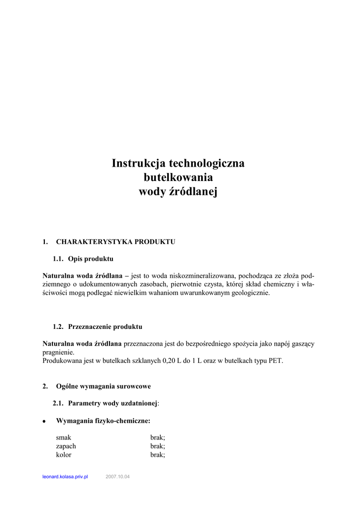 Instrukcja technologiczna butelkowania wody źródlanej 1. CHARAKTERYSTYKA PRODUKTU 1.1. Opis produktu Naturalna woda źródlana – jest to woda niskozmineralizowana, pochodząca ze złoża podziemnego o udokumentowanych zasobach, pierwotnie czysta, której skład chemiczny i właściwości mogą podlegać niewielkim wahaniom uwarunkowanym geologicznie. 1.2. Przeznaczenie produktu Naturalna woda źródlana przeznaczona jest do bezpośredniego spożycia jako napój gaszący pragnienie. Produkowana jest w butelkach szklanych 0,20 L do 1 L oraz w butelkach typu PET. 2. Ogólne wymagania surowcowe 2.1. Parametry wody uzdatnionej: Wymagania fizyko-chemiczne: smak zapach kolor leonard.kolasa.priv.pl brak; brak; brak; 2007.10.04 zmętnienie brak; żelazo 0,2 mg/l; mangan 0,05 mg / l twardość ok. 4 N (2 do 6 N); alkaliczność ( jako Ca CO ) 50 ppm (max); substancje organiczne brak; środki dezynfekujące brak; pH 6,5 - 9,5; azotany 50 mg/l; Pozostałe parametry wg Rozporządzenie Ministra Zdrowia z dn. 4 września 2000 r. w sprawie warunków, jakim powinna odpowiadać woda do picia i na potrzeby gospodarcze - z późniejszymi zmianami (patrz pkt 5,4 Dokumenty Związane). Wymagania mikrobiologiczne: woda surowa - bakterie grupy Coli ogólna liczba bakterii po stacji uzdatniona - bakterie grupy Coli ogólna liczba bakterii woda gazowana - bakterie grupy Coli ogólna liczba bakterii drożdże i pleśnie zero na 100 ml; mniej niż 100 na 1 ml; zero na 100 ml; mniej niż 10 na 1 ml; zero na 100 ml; mniej niż 10 na 1 ml; zero na 10 ml; 2.2. Materiały pomocnicze i opakowanie D w u t l e n e k w ę g l a - stosowany do produkcji napojów musi odpowiadać wymaganiom normy jakościowej. Należy używać dwutlenek węgla wyłącznie I - gatunku o składzie chemicznym: zawartość CO2 - co najmniej 99% objętości; zawartość tlenku węgla - najwyżej 0,1%; CO2 nie powinien wykazywać obcego zapachu. O p a k o w a n i e m bezpośrednim do wód butelkowanych są butelki szklane o różnej pojemności zamykane kapslami koronkowymi, zakrywką aluminiową gwintowaną, oraz butelki typu PET z nakrętkami plastykowymi. 3. Proces uzdatniania wody technologicznej (przykład) Wodę przeznaczoną do produkcji wody źródlanej butelkowanej poddaje się procesowi uzdatniania ponieważ zawiera składniki, które są niepożądane w gotowym produkcie. Woda może być uzdatniana trzema sposobami: z użyciem mleczka wapiennego (Przykład), z użyciem kationitów (metoda wycofywana ze względu na wprowadzanie do wody sodu – sód jest limitowany w diecie – opis i schemat w instrukcji produkcji napojów) lub poprzez odwróconą osmozę. Instrukcja technologiczna butelkowania wody źródlanej. leonard.kolasa.priv.pl 2007.10.04 2 Dodatek wapnia Dostarczanie wody Dodatek podchl. sodu Dodatek siarczanu żelaza Proces dekarbonizacji. Klarowanie Odchlorowanie Przesyłanie do prod. 3.1. Opis procesu uzdatniania wody 3.1.1. Uzdatnianie wody. Odbywa się na stacji wg instrukcji obsługi stacji uzdatniania. 3.1.2. Schładzanie wody. Wodę przeznaczoną do rozlewu w butelki schłodzić do temp. 2 4 C. 4. OPIS POSTĘPOWANIA PRZY PRODUKCJI WODY ŹRÓDLANEJ 4.1. Wymagania dla wody źródlanej butelkowanej Każda partię wyprodukowanej wody źródlanej należy poddać analizie mikrobiologicznej zgodnie w wymaganiami Rozporządzenie Ministra Zdrowia z dn. 29 kwietnia 2004 roku w sprawie naturalnych wód mineralnych, naturalnych wód źródlanych i wód stołowych (Dz.U.Nr.120 poz. 1256 z 2004 r. z późniejszymi zmianami), (patrz pkt5.3 Dokumenty związane). 4.2. Przygotowanie linii do rozlewu przed planowaną produkcją wody źródlanej należy przeprowadzić pięciostopniowe mycie linii wraz z dokładnym płukaniem; należy przestawić doprowadzenie wody do linii rurociągiem omijającym stacje uzdatniania wody; rurociąg wraz z filtrem ECOCART należy dokładnie odchlorować, zamykając zawór na instalacji doprowadzajacej chlor do filtra i rurociągu; urządzenia: rozlewaczkę, premix oraz myjkę butelek należy dokładnie wypłukać wodą źródlaną; przed każdorazowym przystąpieniem do rozlewu wody źródlanej należy sprawdzić wodę na pozostałość chloru (obecność chloru w wodzie jest niedopuszczalna); Instrukcja technologiczna butelkowania wody źródlanej. leonard.kolasa.priv.pl 2007.10.04 3 obecność chloru sprawdzać przy pomocy odczynnika dwuchlorowodoru o–tolidine (do braku żółtego zabarwienia). Do oznaczenia należy pobrać 5 ml badanej wody do probówki, następnie dodać 0,5 ml (ok. 15 kropel) roztworu o-tolidine. po produkcji wody źródlanej należy przestawić obieg wody przez stację uzdatniania wody; wyłączony rurociąg omijający stację uzdatniania należy zachlorować i pozostawić do następnej produkcji. 4.3. Przygotowanie opakowań Butelki dostarczać do linii w skrzynkach na paletach wózkiem widłowym, który ustawia pojedyncze palety na przenośniku do palet. Urządzenie do depaletyzacji rozładowuje skrzynki z butelkami. Skrzynki z butelkami transporter dostarcza do wyładowarki, która automatycznie wyjmuje butelki ze skrzynek i ustawia na przenośniku płytkowym. W przypadku butelek z zakrętkami, przed skierowaniem do mycia następuje odkręcanie nakrętek przy pomocy odkręcarki mechanicznej. Przenośnik płytowy dostarcza butelki do myjki butelek, a skrzynki do myjki skrzynek. 4.3.1. Mycie butelek (przykład) Mycie butelek przeprowadza się w myjce. Jako detergentów używać roztworu sody kaustycznej (wodorotlenku sodu). Preparat ten cechują bardzo wysokie właściwości rozpuszczania substancji organicznych oraz duża siła bakteriobójcza. Jest to substancja silnie żrąca i dlatego należy ściśle przestrzegać przepisów BHP przy sporządzaniu roztworów roboczych. Przygotowywać roztwory robocze o stężeniu 17 - 30% w zbiorniku zasilającym system automatycznego dozowania ługu do myjki. W kolejnych sekcjach myjki należy stosować następujące parametry mycia butelek: