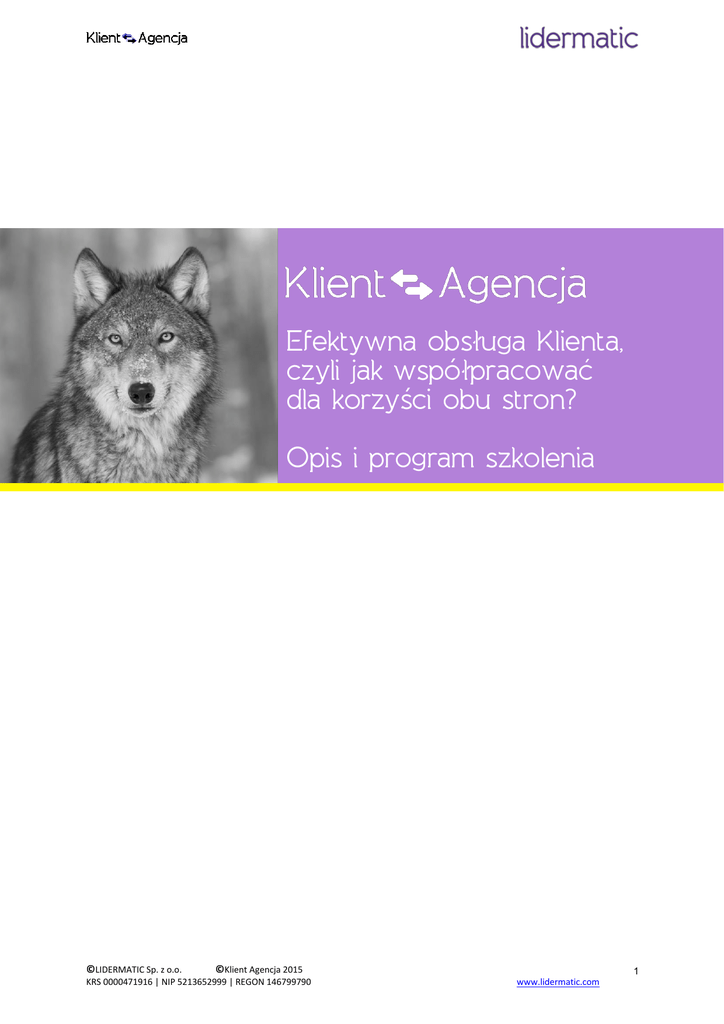 Efektywna obsługa Klienta, czyli jak współpracować dla korzyści obu stron? Opis i program szkolenia ©LIDERMATIC Sp. z o.o. ©Klient Agencja 2015 KRS 0000471916 | NIP 5213652999 | REGON 146799790 1 www.lidermatic.com EFEKTYWNA OBSŁUGA KLIENTA, CZYLI JAK WSPÓŁPRACOWAĆ DLA KORZYŚCI OBU STRON? SZKOLENIE JEDNODNIOWE CEL: Z LIDERMATIC ROZWINIECIE UMIEJĘTNOŚCI, KTÓRE POZWOLĄ ZWIĘKSZYĆ JAKOŚĆ OBSŁUGI KLIENTA I USPRAWNIĆ PROCES REALIZACJI ZLECEŃ W AGENCJI. Podczas szkolenia nauczymy Was: • jak efektywnie rozpoczynać prace projektową i przeciwdziałać niezadowoleniu klienta? • jak utrzymywać wysoki poziom zaangażowania w proces obsługi klienta, czyli jak nie tracić ducha działając pod presją lub pod naporem nieadekwatnych czy nadmiernych oczekiwań klienta. • jak być proaktywnym i wyprzedzać oczekiwania klienta, czyli budować u klienta poczucie, że otrzymuje najwyższą jakość obsługi? PROGRAM: MODUŁ 1: CO MOŻNA USPRAWNIĆ W OBSŁUDZE KLIENTA? Ważne insighty, które pomogą zrozumieć oczekiwania klientów od obsługi i partnerstwa biznesowego z agencją. • Jakie są kluczowe oczekiwania klienta od obsługi w stosunku do: Client Service, Kreacji, Strategii, całej agencji? • W jakich sytuacjach agencja działa na swoją niekorzyść - na wydłużenie procesu pracy, zwiększenie presji, konflikty wewnętrzne, popełnianie błędów? • Jakie są istotne czynniki, które agencja musi wziąć pod uwagę, aby sprawnie przeprowadzić proces współpracy (proces decyzyjny po stronie klienta, rola innych niż marketing działów w określaniu briefu i akceptacji prac agencji, nieefektywne lub negatywne zjawiska po stronie klienta)? • Jaki jest katalog powodów niezadowolenia klienta z obsługi i pracy zespołu agencji? • Czym charakteryzuje się trudny klient i jak z nim współpracować? MODUŁ 2: EFEKTYWNY BRIEFING JAKO FUNDAMENT SPRAWNEJ WSPÓŁPRACY. Jak rozpoczynać prace projektowe z klientem, aby obu stronom towarzyszyła wysoka motywacja i wiara w sukces? • Jakie znaczenie mają umiejętności interpersonalne podczas rozpoczynania pracy? • Jakie są podstawowe zasady efektywnej komunikacji na etapie briefu? • Jakich pytań nie zadaje agencja i jakie to ma konsekwencje na dalszy etap współpracy? • Jak rola, postawa i pytania ludzi z Kreacji na etapie briefu wpływają na późniejszą skuteczność współpracy i efektywność pracy agencji? • Jakie pytania należy zadać klientowi, aby klient brał odpowiedzialność za skuteczność swojej komunikacji podczas briefu? MODUŁ 3: EFEKTYWNE DZIAŁANIA WE WSPÓŁPRACY Z KLIENTEM. Na czym agencja powinna się najbardziej skoncentrować we współpracy z klientem, aby skutecznie realizować strategię klienta i jednocześnie swoją własną? • Jakie działania agencji w codziennej współpracy działają na klienta jak płachta na byka? • Jak odpowiadać na brief tak, aby klient miał poczucie, że jego oczekiwania zostały spełnione? • Jak konstruktywnie nie zgadzać się z klientem? • Jak rozpoznawać brak spójności po stronie klienta i jak wspierać klienta zamiast z nim walczyć? • Jak dobrze sprzedawać prace agencji? ©LIDERMATIC Sp. z o.o. ©Klient Agencja 2015 KRS 0000471916 | NIP 5213652999 | REGON 146799790 2 www.lidermatic.com MODUŁ 4: PROAKTYWNOŚĆ W OBSŁUDZE KLIENTA. Jak wyprzedzać oczekiwania klienta? • Czym jest proaktywność agencji z perspektywy klienta? • Kiedy jest przestrzeń na proaktywność, a kiedy praca agencji idzie na marne – jak rozpoznać właściwy moment na bycie proaktywnym? • Jakie działania budują proaktywną i ekspercką pozycję w oczach klienta o w wykonaniu Client Service o w wykonaniu Kreacji o w wykonaniu Strategów o w wykonaniu Managementu agencji • Co pomaga lepiej sprzedawać dodatkowe usługi agencji? • Jak proaktywność wpływa na wysokie oceny pracy agencji przez klienta? DLA KOGO JEST TO SZKOLENIE: Szkolenie jest skierowane do tych agencji, które stawiają na wysoką jakość obsługi i sprawność działania, czego efektem ma być skuteczność realizacji projektów reklamowych. Wiedza szkoleniowa będzie pomocna dla tych pracowników agencji, którzy chcą sprawniej realizować zadania, zmniejszyć puste przebiegi czy rozwiązać problemy komunikacyjne w bieżącej pracy zarówno z zespołem u klienta, jak i ze swoimi współpracownikami w agencji. Zapraszamy zespoły odpowiedzialne za codzienną współpracę i bezpośrednie kontakty z klientami: Client Service, Kreację, Strategię... EFEKTY: • szeroki i usystematyzowany katalog oczekiwań klienta od obsługi w agencji w formie przetłumaczonych insightów klienckich, • zasady efektywnej komunikacji i lista kluczowych umiejętności interpersonalnych niezbędnych na początkowych etapach pracy z klientem (rozpoczynanie współpracy, briefing na kampanię, briefing projektowy), • lista działań i postaw, które budują u klienta poczucie dobrej obsługi i spełniania oczekiwań, • zmniejszenie liczby zgłaszanych zastrzeżeń, skarg na obsługę klienta, • wzrost satysfakcji klienta z obsługi agencji, • zaangażowanie klienta do bliższej i bardziej otwartej współpracy. METODOLOGIA SZKOLENIA: • krótkie wykłady teoretyczne, • ćwiczenia (praca warsztatowa w parach lub grupach) wprowadzające zagadnienia szkoleniowe, • ćwiczenia (praca warsztatowa w parach lub grupach) utrwalające wprowadzone nowe umiejętności, • ćwiczenia praktycznych sytuacji uczestników, • moderowane dyskusje z wypracowaniem nowych rozwiązań, • udzielanie informacji zwrotnych, • zadania symulacyjne. Miejsce: Centrum Edukacyjne Stowarzyszenia Komunikacji Marketingowej SAR, Warszawa, ul. Czerska 8/10 (budynek Agory). Cena szkolenia dla 1 osoby: 1000 zł + VAT, dla członków SAR 10% zniżki Zgłoszenia: Mail: [email protected] [email protected] Telefon: 504 307 188 ©LIDERMATIC Sp. z o.o. ©Klient Agencja 2015 KRS 0000471916 | NIP 5213652999 | RE